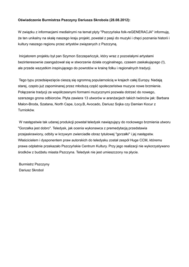 Oświadczenie Burmistrza Pszczyny Dariusza Skrobola (28.08.2012): W związku z informacjami medialnymi na temat płyty "Pszczyńska folk-reGENERACJA" informuję, że ten unikalny na skalę naszego kraju projekt, powstał z pasji do muzyki i chęci poznania historii i kultury naszego regionu przez artystów związanych z Pszczyną. Inicjatorem projektu był pan Szymon Szczepańczyk, który wraz z pozostałymi artystami bezinteresownie zaangażował się w stworzenie dzieła oryginalnego, czasem zaskakującego (!), ale przede wszystkim inspirującego do powrotów w krainę folku i regionalnych tradycji. Tego typu przedsięwzięcia cieszą się ogromną popularnością w krajach całej Europy. Nadają starej, często już zapominanej przez młodszą część społeczeństwa muzyce nowe brzmienie. Połączenie tradycji ze współczesnymi formami muzycznymi pozwala dotrzeć do nowego, szerszego grona odbiorców. Płyta zawiera 13 utworów w aranżacjach takich twórców jak: Barbara Malon-Broda, Szatana, North Cape, Łocy.B, Avocado, Dariusz Sojka czy Damian Kocur z Turnioków. W następstwie tak udanej produkcji powstał teledysk nawiązujący do rockowego brzmienia utworu "Gorzałka jest dobro". Teledysk, jak ocenia wykonawca z premedytacją przedstawia przejaskrawiony, odbity w krzywym zwierciadle obraz tytułowej "gorzałki" i jej następstw. Właścicielem i dysponentem praw autorskich do teledysku został zespół Huge CCM, któremu prawa odpłatnie przekazało Pszczyńskie Centrum Kultury. Przy jego realizacji nie wykorzystywano środków z budżetu miasta Pszczyna. Teledysk nie jest umieszczony na płycie. Burmistrz Pszczyny Dariusz Skrobol