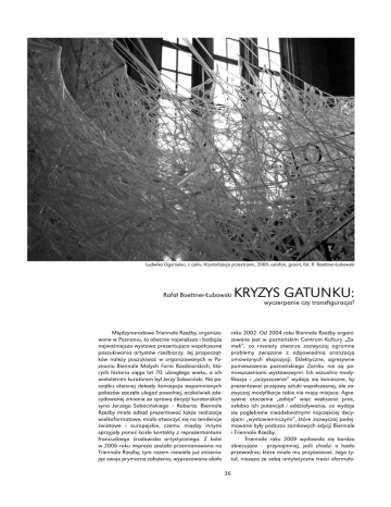 Ludwika Ogorzelec, z cyklu: Krystalizacja przestrzeni, 2009, celofan, granit, fot. R. Boettner-Łubowski Rafał Boettner-Łubowski KRYZYS GATUNKU: wyczerpanie czy transfiguracja? Międzynarodowe Triennale Rzeźby, organizowane w Poznaniu, to obecnie największa i bodajże najważniejsza wystawa prezentująca współczesne poszukiwania artystów rzeźbiarzy. Jej prapoczątków należy poszukiwać w organizowanych w Poznaniu Biennale Małych Form Rzeźbiarskich, których historia sięga lat 70. ubiegłego wieku, a ich wieloletnim kuratorem był Jerzy Sobociński. Na początku obecnej dekady koncepcja wspomnianych pokazów zaczęła ulegać powolnej, aczkolwiek zdecydowanej zmianie za sprawą decyzji kuratorskich syna Jerzego Sobocińskiego – Roberta. Biennale Rzeźby miało odtąd prezentować także realizacje wielkoformatowe, miało otworzyć się na tendencje światowe i europejskie, czemu między innymi sprzyjały ponoć ścisłe kontakty z reprezentantami francuskiego środowiska artystycznego. Z kolei w 2006 roku impreza została przemianowana na Triennale Rzeźby, tym razem niewiele już zmieniając swoje prymarne założenia, wypracowane około roku 2002. Od 2004 roku Biennale Rzeźby organizowane jest w poznańskim Centrum Kultury „Zamek”, co niestety stwarza zazwyczaj ogromne problemy związane z odpowiednią aranżacją omawianych ekspozycji. Eklektyczne, agresywne pomieszczenia poznańskiego Zamku nie są pomieszczeniami wystawowymi. Ich wizualna modyfikacja i „oczyszczenie” wydają się konieczne, by prezentować przejawy sztuki współczesnej, ale zazwyczaj modyfikacje takie nie mają miejsca. Agresywne otoczenie „zabija” więc większość prac, osłabia ich potencjał i oddziaływanie, co wydaje się pogłębiane nieadekwatnymi najczęściej decyzjami „wystawienniczymi”, które zazwyczaj podejmowane były podczas zamkowych edycji Biennale i Triennale Rzeźby. Triennale roku 2009 wydawało się bardzo obiecujące – przynajmniej, jeśli chodzi o hasło przewodnie, które miało mu przyświecać. Jego tytuł, niosące ze sobą antytetyczne treści sformuło36 wanie Kryzys gatunku, w kontekście poszukiwań i przewartościowań najnowszej rzeźby, staje się prawdziwym wyzwaniem dla współczesnego kuratora / kuratorów wielkich wystaw dzieł i aranżacji przestrzennych. Tak naprawdę bowiem, hasło to zadaje, w aluzyjny i niejako ukryty sposób, szereg pytań, na które mogłaby przynajmniej częściowo odpowiedzieć ciekawie przygotowana wystawa. Bo czyż nie warto się zastanowić nad tym: czy / i na ile aktualne są dzisiaj tradycyjne i klasyczne postawy rzeźbiarskie?; oraz: na ile żywe są wzorce i stylistyki dawnej, historycznej rzeźby w dziełach współczesnych?; jak również: jakie współczesne reinterpretacje i przewartościowania nastąpiły w pojmowaniu rzeźbiarskiego medium?; czy: jak rzeźba i sztuka przestrzeni może wchodzić obecnie w ciekawe relacje z mediami cyfrowymi?; i wreszcie: na ile w ciekawy i twórczy sposób można ożywiać i kontynuować obecnie wielkie rzeźbiarskie konwencje XX wieku, czyli np. wzorce ekspresjonistycznej figuracji lub dajmy na to szeroko pojmowaną „konwencję” rzeźby strukturalistycznej? Zjawisko kryzysu jest bowiem w odniesieniu do przejawów sztuk plastycznych zazwyczaj, co najmniej dwuznaczne: nie wiadomo bowiem czy „coś”, co podlega danemu kryzysowi kończy się i ostatecznie obumiera, czy też nie kiełkują przy okazji „inne” niż dotychczasowe przewartościowania, perspektywy i postawy twórcze. Poza tym kryzys jako swoisty stan może przyjmować różne postacie, może być on: ostateczny, przejściowy, długotrwały czy w efekcie finalnym konstruktywny lub, wręcz przeciwnie, totalnie destrukcyjny. A zatem już sama ambiwalencja wpisana w pojęcie „kryzysu” potencjalnie otwierała przed organizatorami zeszłorocznego Triennale Rzeźby możliwość zorganizowania naprawdę ciekawej, wieloaspektowej prezentacji współczesnej rzeźby i sztuki przestrzeni. A jaki był stan faktyczny? Monumentalną ekspozycję ubiegłorocznego Triennale, zorganizowaną pod czujnym okiem kuratora generalnego Roberta Sobocińskiego współtworzyły swego rodzaju wewnętrzne kręgi ekspozycyjne kreujące wspomnianą już rozbudowaną całość. I tak ważne miejsce zajmował tu pokaz zatytułowany Współcześni rzeźbiarze i ich galerie, do którego realizacji został zaproszony Olivier Billiard – ceniony dyrektor artystyczny wielu edycji Targów Sztuki we Francji, między innymi w Strasburgu i w Lille. W intencji wspomnianego kuratora najważniejsze galerie europejskie miały zaprezentować prace współpracujących z nimi artystów. Po niespodziewanej śmierci Billiarda, rolę kuratora wystawy przejęła Laurence d’Ist. Ostatecznie na pokazie Współcześni rzeźbiarze i ich galerie swoje prace zaprezentowali: Bernard Pagès, Berthelemy Toguo, Eric Liot, Coskun, Laurence Drocourt i Aurélie Foutel, Axel Cassel, Gabriela Morawetz, Nicolas Alquin, Louise Giamari, Guy Ferrer, Hadji Bachir, Xavier Boggio, Paul de Pignol oraz Marc Petit z Francji; Bjorn Norgaard z Danii; Maike Freess z Niemiec; Urs Twellmann i Christine Aymon ze Szwajcarii; Jhemp Bastin z Luksemburga; Anne Marie Klenes i Bob Verschueren z Belgii; Sentier z Martyniki 37 Dominik Dlouhy, Bez tytułu, 2007, żywica epoksydowa, tkanina, fot. R. Boettner-Łubowski 1. oraz Robert Sobociński z Polski. Śmierć Billiarda przyczyniła się niewątpliwie do zorganizowania pokazu memoratywnego zatytułowanego Niedokończona wystawa. Pamięci Oliviera Billiarda, do uczestnictwa w którym zaproszono twórców współpracujących w ostatnim czasie z francuskim kuratorem. Z kolei ekspozycja zatytułowana Indywidualności współczesnej rzeźby, przygotowana przez Roberta Sobocińskiego, zgromadziła prace dwudziestu jeden specjalnie wybranych artystów rzeźbiarzy, takich jak: Sylwester Ambroziak, Mariusz Białecki, Hans Bouman, Arnaud Cohen, Dom