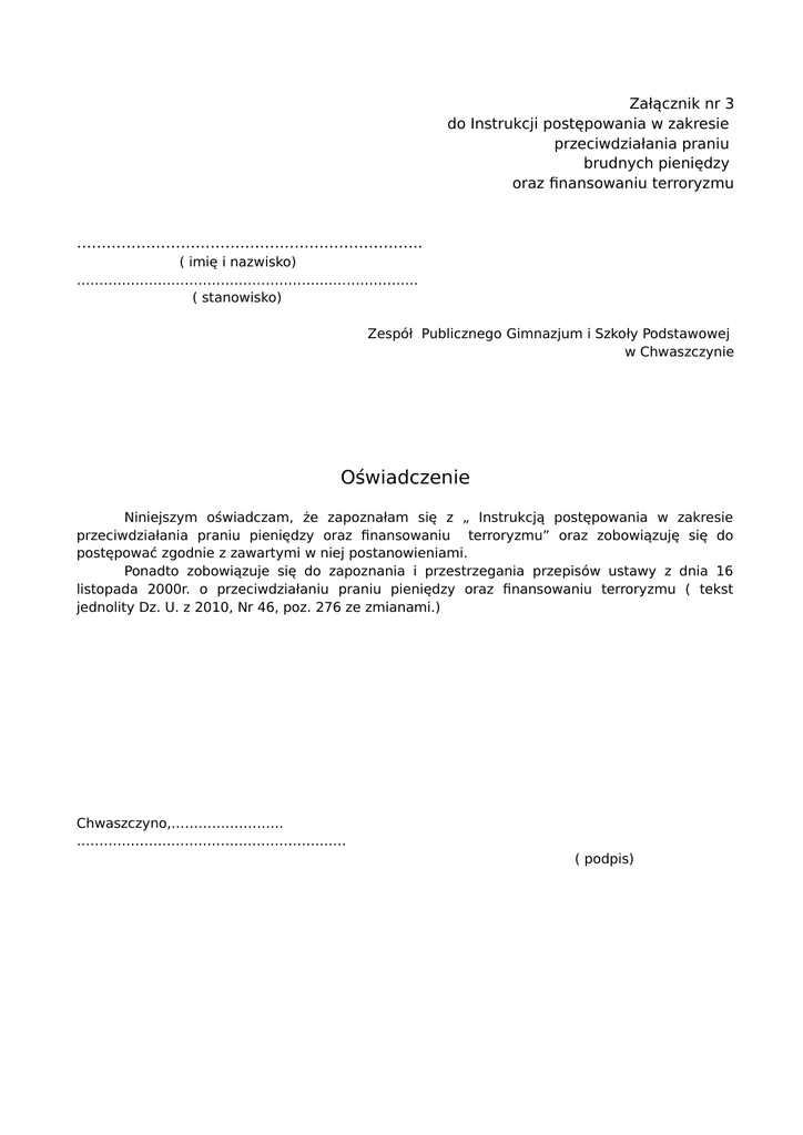 Załącznik nr 3 do Instrukcji postępowania w zakresie przeciwdziałania praniu brudnych pieniędzy oraz finansowaniu terroryzmu ……………………………………………………………. ( imię i nazwisko) …………………………………………………………………. ( stanowisko) Zespół Publicznego Gimnazjum i Szkoły Podstawowej w Chwaszczynie Oświadczenie Niniejszym oświadczam, że zapoznałam się z „ Instrukcją postępowania w zakresie przeciwdziałania praniu pieniędzy oraz finansowaniu terroryzmu” oraz zobowiązuję się do postępować zgodnie z zawartymi w niej postanowieniami. Ponadto zobowiązuje się do zapoznania i przestrzegania przepisów ustawy z dnia 16 listopada 2000r. o przeciwdziałaniu praniu pieniędzy oraz finansowaniu terroryzmu ( tekst jednolity Dz. U. z 2010, Nr 46, poz. 276 ze zmianami.) Chwaszczyno,……………………. …………………………………………………… ( podpis) Załącznik nr 2 do Instrukcji postępowania w zakresie przeciwdziałania praniu brudnych pieniędzy oraz finansowaniu terroryzmu Wzór powiadomienia Głównego Inspektora Informacji Finansowego …………………………………… Chwaszczyno, dnia ………………………… ( Sygnatura) Generalny Inspektor Informacji Finansowej Ministerstwo Finansów Ul. Świętokrzyska 12 00916 Warszawa Powiadomienie o podejrzeniu popełnienia prania brudnych pieniędzy oraz finansowania terroryzmu Na podstawie art. 15 a ust. 1,3 i 4 ustawy z dnia 16 listopada 2000r. o przeciwdziałaniu praniu pieniędzy oraz finansowaniu terroryzmu ( Dz. U. z 2010r. Nr 46, poz. 276 z późn. zm. ) powiadamiam, iż w trakcie czynności przeprowadzonej w związku z : ……………………………………………………………………………………………………………………………… ………………………………………… Zachodzi podejrzenie prania pieniędzy/finansowania terroryzmu* Opis ustaleń**: ……………………………………………….. ( podpis osoby upoważnionej) *niepotrzebne skreślić ** Opis ustaleń powinien zawierać dane, o których mowa w art. 12 ust. 1 pkt 1-4 oraz art. 158 a ust. 4 ustawy, a w zakresie danych dotyczących uczestników transakcji – w miarę możliwości należy podać informacje, o których mowa w art. 9 ust. 2 ustawy, Załączniki *** ***Zgodnie z art. 15 a ust. 1 pkt 2 ustawy, należy dołączyć potwierdzone kopie dokumentów dotyczących transakcji, co do których zachodzi podejrzenie, że mają one związek z popełnieniem przestępstw określonych w art. 165a, lub art. 2999 Kodeksu Karnego oraz informacje o stronach tych transakcji. Załącznik nr 1 do Instrukcji postępowania w zakresie przeciwdziałania praniu brudnych pieniędzy oraz finansowaniu terroryzmu Rejestr powiadomień Głównego Inspektora Informacji Finansowej L Data, Uczestnic Opis Data Stanowisko Data Decyzja Data p miejsce, y treści przekazania Koordynator przekazania Dyrektora wysyłania rodzaj transakcji dok. dot. Koordynatorow a Dyrektorow szkoły pow. Do trans. transakcji i i szkoły GIIF INSTRUKCJA POSTĘPOWANIA W ZAKRESIE PRZECIWDZIAŁANIA PRANIU BRUDNYCH PIENIĘDZY ORAZ FINANSOWANIA TERRORYZMU &1 Ilekroć w Instrukcji jest mowa o: 1. Ustawie – należy rozumieć ustawę z dnia 16 listopada 2000r. o przeciwdziałaniu praniu pieniędzy oraz finansowaniu terroryzmu ( tekst jedn. z 2010 Dz. U. Nr 46, poz. 276 z późn. zmianami) 2. GIIF – należy przez to rozumieć Generalnego Inspektora Informacji Finansowej, 3. Dyrektor – należy przez to rozumieć Dyrektora szkoły 4. Jednostce – oznacza Zespół Publicznego Gimnazjum i Szkoły Podstawowej w Chwaszczynie 5. Kierownik jednostki – należy przez to rozumieć W-ce dyrektora szkoły &2 Zobowiązuje się wszystkich pracowników jednostki, w trakcie wykonywania obowiązków służbowych, do: 1. Dokonywania analizy i oceny realizacji transakcji w rozumieniu art. 2 pkt 2 ustawy, a w szczególności wpłat i wniosków o zwrot kwot, przeniesień własności lub posiadania wartości majątkowych, w tym oddania pod zastaw, zamian wierzytelności na akcje lub udziały – zarówno gdy czynności te dokonywane są we własnym, jak i cudzym imieniu, na własny, jak i cudzy rachunek, w których występują oznaki wskazujące na możliwość wprowadzenia do obrotu finansowego wartości majątkowych pochodzących z nielegalnych lub nieujawnionych źródeł, 2. Sporządzania kopii dokumentów dotyczących transakcji, co do których zachodzi podejrzenie, że mają one związek z popełnieniem przestępstw, o których mowa w art. 165a lub art. 299 Kodeksu karnego, 3. Zebrania dostępnych informacji o osobach przeprowadzających te transakcje, 4. Zwracania szczególnej uwagi na: Transakcje nietypowe związane z nabyciem majątku komunalnego, Umowy i transakcje związane z wykonywaniem przez inne podmioty zadań publicznych w Zespole Publicznego Gimnazjum i Szkoły Podstawowej w Chwaszczynie, realizowane na warunkach odbiegających od istniejących standardów, Na nietypowe zachowania i czynności podejmowane przez uczestników postępowania o udzielenie zamówienia publicznego, polegające między innymi na oferowaniu przez nich warunków wykonania zamówienia w sposób rażąco odbiegający od oferowanych przez innych oferentów, Na udział kontrolowanych jednostek i innych podmiotów w nietypowych przedsięwzięciach, szczególnie finansowanych z udziałem kapitału zagranicznego, Dokonywanie wpłaty znacznych kwot gotówką ( np. tytułem zapłaty za nabyte mienie,) Dokonywanie wpłaty należności w ratach ( kilkakrotnie), w tym samym dniu, Przypadki dokonywania nadpłaty ( np. podatków i innych opłat) lub wpłat nienależnych jednostce i ewentualnego ich wycofania, Przekazywania bezpośredniemu przełożonemu, a następnie Koordynatorowi ds. współpracy z GIIF informacji w formie notatki służbowej dotyczącej opisu podejrzanych transakcji wr