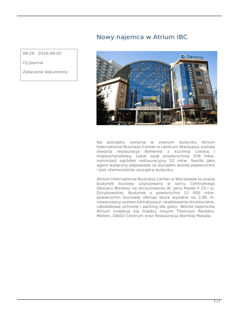 Nowy najemca w Atrium IBC 08:29 2016-09-02 CIJ Journal Załączone dokumenty: Na początku sierpnia w znanym budynku Atrium International Business Center w centrum Warszawy została otwarta restauracja Bohemia z kuchnią czeską i międzynarodową. Lokal zajął powierzchnię 339 mkw. natomiast ogródek restauracyjny 52 mkw. Savills jako agent wyłączny odpowiada za wynajem wolnej powierzchni i jest równocześnie zarządcą budynku. Atrium International Business Center w Warszawie to znany budynek biurowy usytuowany w sercu Centralnego Obszaru Biznesu na skrzyżowaniu Al. Jana Pawła II 23 i ul. Grzybowskiej. Budynek o powierzchni 12 000 mkw. powierzchni biurowej oferuje biura wysokie na 2,85 m, nowoczesny system klimatyzacji, okablowanie strukturalne, całodobową ochronę i parking dla gości. Wśród najemców Atrium znajdują się między innymi Thomson Reuters, Matexi, DAGO Centrum oraz Restauracja Bombaj Masala. 1/1