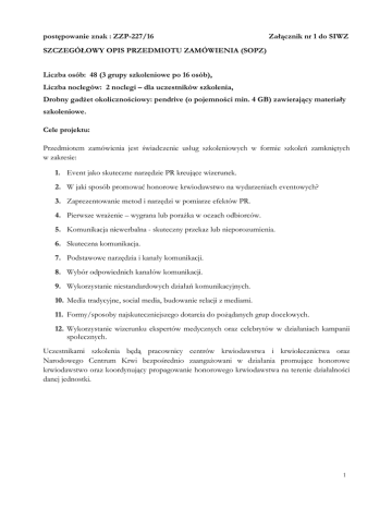 postępowanie znak : ZZP-227/16 Załącznik nr 1 do SIWZ SZCZEGÓŁOWY OPIS PRZEDMIOTU ZAMÓWIENIA (SOPZ) Liczba osób: 48 (3 grupy szkoleniowe po 16 osób), Liczba noclegów: 2 noclegi – dla uczestników szkolenia, Drobny gadżet okolicznościowy: pendrive (o pojemności min. 4 GB) zawierający materiały szkoleniowe. Cele projektu: Przedmiotem zamówienia jest świadczenie usług szkoleniowych w formie szkoleń zamkniętych w zakresie: 1. Event jako skuteczne narzędzie PR kreujące wizerunek. 2. W jaki sposób promować honorowe krwiodawstwo na wydarzeniach eventowych? 3. Zaprezentowanie metod i narzędzi w pomiarze efektów PR. 4. Pierwsze wrażenie – wygrana lub porażka w oczach odbiorców. 5. Komunikacja niewerbalna - skuteczny przekaz lub nieporozumienia. 6. Skuteczna komunikacja. 7. Podstawowe narzędzia i kanały komunikacji. 8. Wybór odpowiednich kanałów komunikacji. 9. Wykorzystanie niestandardowych działań komunikacyjnych. 10. Media tradycyjne, social media, budowanie relacji z mediami. 11. Formy/sposoby najskuteczniejszego dotarcia do pożądanych grup docelowych. 12. Wykorzystanie wizerunku ekspertów medycznych oraz celebrytów w działaniach kampanii społecznych. Uczestnikami szkolenia będą pracownicy centrów krwiodawstwa i krwiolecznictwa oraz Narodowego Centrum Krwi bezpośrednio zaangażowani w działania promujące honorowe krwiodawstwo oraz koordynujący propagowanie honorowego krwiodawstwa na terenie działalności danej jednostki. 1 I. Zakres zamówienia: 1. Wykonawca zobowiązany jest do zapewnienia uczestnikom szkolenia kompleksowej obsługi hotelarsko — gastronomicznej, w obiekcie minimum trzygwiazdkowym, w zakresie: zakwaterowania, wyżywienia i udostępnienia 3 sal konferencyjnych lub szkoleniowych, klimatyzowanych wraz z niezbędnym sprzętem na potrzeby przeprowadzenia dwudniowego szkolenia w trzech grupach szkoleniowych, w jednym terminie (dwa dni szkoleniowe + dwa noclegi w hotelu – w przeddzień i po pierwszym dniu szkolenia). a) Wykonawca w ofercie musi podać nazwę hotelu w którym organizowane będzie dwudniowe szkolenie. 2. Wykonawca jest zobowiązany zapewnić dwa noclegi wraz ze śniadaniem dla uczestników szkolenia. 3. Wykonawca jest zobowiązany zapewnić podczas szkolenia stały serwis kawowy obejmujący: świeżo parzoną gorącą kawę, gorąca wodę w nierdzewnych termosach z pompką lub termosach cateringowych, herbatę ekspresową, mleko do kawy, cukier, cytrynę, soki - 2 rodzaje, wodę niegazowaną i gazowaną w butelkach z tworzywa sztucznego o pojemności 500 ml, zestaw wyrobów cukierniczych składający się z minimum 2 rodzajów ciastek - wszystko powyższe uzupełniane w razie potrzeby; oraz wyżywienie w formie lunchu w każdym dniu szkolenia, a także dwóch kolacji: w przeddzień i w pierwszym dniu szkolenia, zgodnie z poniższą specyfikacją: a) lunch x 2 w formie szwedzkiego stołu, na który składa się: 2 dania ciepłe (w tym jedno jarskie) - dania mięsne minimum 170 g/os, danie jarskie minimum 300 g/os, zupa minimum 300 g/os, 2 rodzaje surówek, pieczywo, deser (minimum 200 g /os); b) kolację w formie szwedzkiego stołu, na który składa się: danie ciepłe (w tym jedno jarskie) dania mięsne minimum 170 g/os, danie jarskie minimum 300 g/os, 2 rodzaje sałatek, 2 rodzaje zimnych przystawek, pieczywo, deser (minimum 200 g / os) 4. Zamawiający wymaga, aby dania ciepłe w każdym dniu szkolenia były różne. 5. Powyższe nie dotyczy napojów podawanych w ramach całodziennej przerwy kawowej. 6. W szkoleniach będzie uczestniczyło maksymalnie 48 osób - w rozbiciu na 3 oddzielne szkolenia. Jedna grupa szkoleniowa będzie liczyła maksymalnie 16 osób. 7. Zamawiający na co najmniej trzy dni przed rozpoczęciem szkolenia przekazywać będzie Wykonawcy listy uczestników poszczególnych grup szkoleniowych. Wykonawca dołączy do oferty listę trenerów wraz z zapewnieniem, iż zostaną oni zapoznani ze specyfiką pracy w centrum krwiodawstwa związanej z propagowaniem honorowego krwiodawstwa. Zamawiający zapewni Wykonawcy możliwość konsultacji trenerów z właściwymi osobami w centrum krwiodawstwa. 8. Wykonawca zobowiązany jest dołączyć do oferty szczegółowy harmonogram szkolenia wraz ze wskazaniem ich terminu, miejsca realizacji. 2 9. Szkolenie będzie trwało 2 dni szkoleniowe, przy czym 1 dzień szkoleniowy = 8 godzin wraz z przerwami. Łącznie 16 godzin, w tym nie więcej niż 10 godzin teoretycznych i nie mniej niż 6 godzin warsztatów. 10. Przyjmuje się, że czas jednej godziny lekcyjnej odpowiada 45 minutom. 11. Miejsce szkolenia i zakwaterowania uczestników szkolenia , jak również restauracja powinny być zlokalizowane w jednym budynku: w granicach administracyjnych miasta stołecznego Warszawy (w odległości maksymalnie 10 km od Dworca Centralnego w Warszawie), w hotelu zlokalizowanym w odległości nie większej niż 500 m od przystanku komunikacji miejskiej, zapewniającej bezpośrednie połączenie (z wykorzystaniem ogólnodostępnej komunikacji miejskiej, np. metro, tramwaj, autobus). 12. Szkolenie może odbywać się tylko w dni robocze tj. od poniedziałku do piątku z wyłączeniem okresu od 10 do 14 listopada 2016 r. oraz od 22 do 25 listopada 2016 r. 13. Zamawiający wymaga realizacji zamówienia (dla każdej grupy szkoleniowej w tym samym miejscu) w hotelu o standardzie minimum trzygwiazdkowym (w rozumieniu przepisów Rozporządzenia Ministra Gospodarki i Pracy z dnia 19 sierpnia 2004 r. w sprawie obiektów hotelarskich i innych obiektów, w których są świadczone usługi hotelarskie). 14. Zamawiający wymaga, aby uczestnicy szkolenia byli zakwaterowani w pokojach 2- osobowych z łazienką, telewizorem, standardem odpowiadające obiektowi. Pokoje jednoosobowe za oddzielną dopłatą uczestnika. II. Przygotowanie i przeprowadzenie szkolenia: 1. Obowiązki Wykonawcy: 1) Wykonawca opracuje i przygotuje autorskie materiały szkoleniowe, które następnie dostarczy do mi
