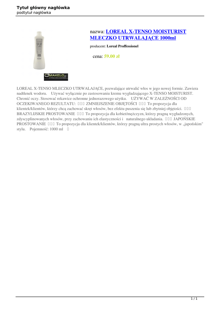 Tytuł główny nagłówka podtytuł nagłówka nazwa: LOREAL X-TENSO MOISTURIST MLECZKO UTRWALAJĄCE 1000ml producent: Loreal Proffessionel cena: 59.00 zł LOREAL X-TENSO MLECZKO UTRWALAJĄCE, pozwalające utrwalić włos w jego nowej formie. Zawiera nadtlenek wodoru. Używać wyłącznie po zastosowaniu kremu wygładzającego X-TENSO MOISTURIST. Chronić oczy. Stosować rekawice ochronne jednorazowego użytku. UŻYWAĆ W ZALEŻNOŚCI OD OCZEKIWANEGO REZULTATU: ZMNIEJSZENIE OBJĘTOŚCI To propozycja dla klientek/klientów, którzy chcą zachować skręt włosów, bez efektu puszenia się lub zbytniej objętości. BRAZYLIJSKIE PROSTOWANIE To propozycja dla kobiet/mężczyzn, którzy pragną wygładzonych, zdyscyplinowanych włosów, przy zachowaniu ich elastyczności i naturalnego układania. JAPOŃSKIE PROSTOWANIE To propozycja dla klientek/klientów, którzy pragną ultra prostych włosów, w „japońskim" stylu. Pojemność: 1000 ml 1/1