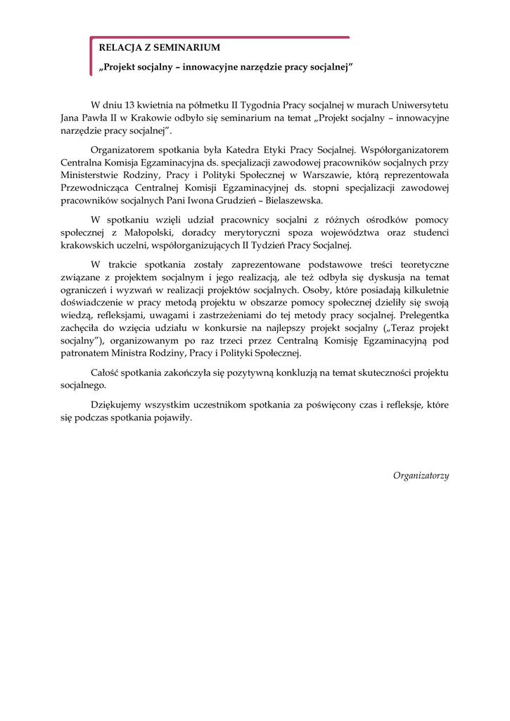 RELACJA Z SEMINARIUM „Projekt socjalny – innowacyjne narzędzie pracy socjalnej” W dniu 13 kwietnia na półmetku II Tygodnia Pracy socjalnej w murach Uniwersytetu Jana Pawła II w Krakowie odbyło się seminarium na temat „Projekt socjalny – innowacyjne narzędzie pracy socjalnej”. Organizatorem spotkania była Katedra Etyki Pracy Socjalnej. Współorganizatorem Centralna Komisja Egzaminacyjna ds. specjalizacji zawodowej pracowników socjalnych przy Ministerstwie Rodziny, Pracy i Polityki Społecznej w Warszawie, którą reprezentowała Przewodnicząca Centralnej Komisji Egzaminacyjnej ds. stopni specjalizacji zawodowej pracowników socjalnych Pani Iwona Grudzień – Bielaszewska. W spotkaniu wzięli udział pracownicy socjalni z różnych ośrodków pomocy społecznej z Małopolski, doradcy merytoryczni spoza województwa oraz studenci krakowskich uczelni, współorganizujących II Tydzień Pracy Socjalnej. W trakcie spotkania zostały zaprezentowane podstawowe treści teoretyczne związane z projektem socjalnym i jego realizacją, ale też odbyła się dyskusja na temat ograniczeń i wyzwań w realizacji projektów socjalnych. Osoby, które posiadają kilkuletnie doświadczenie w pracy metodą projektu w obszarze pomocy społecznej dzieliły się swoją wiedzą, refleksjami, uwagami i zastrzeżeniami do tej metody pracy socjalnej. Prelegentka zachęciła do wzięcia udziału w konkursie na najlepszy projekt socjalny („Teraz projekt socjalny”), organizowanym po raz trzeci przez Centralną Komisję Egzaminacyjną pod patronatem Ministra Rodziny, Pracy i Polityki Społecznej. Całość spotkania zakończyła się pozytywną konkluzją na temat skuteczności projektu socjalnego. Dziękujemy wszystkim uczestnikom spotkania za poświęcony czas i refleksje, które się podczas spotkania pojawiły. Organizatorzy