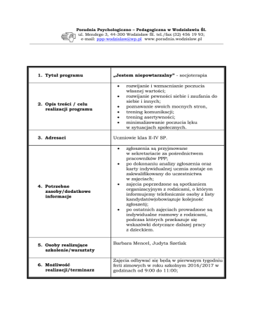 Poradnia Psychologiczno – Pedagogiczna w Wodzisławiu Śl. ul. Mendego 3, 44-300 Wodzisław Śl. tel./fax (32) 456 19 93; e-mail: [email protected] www.poradnia.wodzislaw.pl 1. Tytuł programu „Jestem niepowtarzalny” - socjoterapia 2. Opis treści / celu realizacji programu 3. Adresaci Uczniowie klas II-IV SP. 4. Potrzebne zasoby/dodatkowe informacje 5. Osoby realizujące szkolenie/warsztaty 6. Możliwość realizacji/terminarz rozwijanie i wzmacnianie poczucia własnej wartości; rozwijanie pewności siebie i zaufania do siebie i innych; poznawanie swoich mocnych stron, trening komunikacji; trening asertywności; minimalizowanie poczucia lęku w sytuacjach społecznych. zgłoszenia są przyjmowane w sekretariacie za pośrednictwem pracowników PPP; po dokonaniu analizy zgłoszenia oraz karty indywidualnej ucznia zostaje on zakwalifikowany do uczestnictwa w zajęciach; zajęcia poprzedzone są spotkaniem organizacyjnym z rodzicami, o którym informujemy telefonicznie osoby z listy kandydatów(obowiązuje kolejność zgłoszeń); po ostatnich zajęciach prowadzone są indywidualne rozmowy z rodzicami, podczas których przekazuje się wskazówki dotyczące dalszej pracy z dzieckiem. Barbara Mencel, Judyta Szetlak Zajęcia odbywać się będą w pierwszym tygodniu ferii zimowych w roku szkolnym 2016/2017 w godzinach od 9:00 do 11:00;