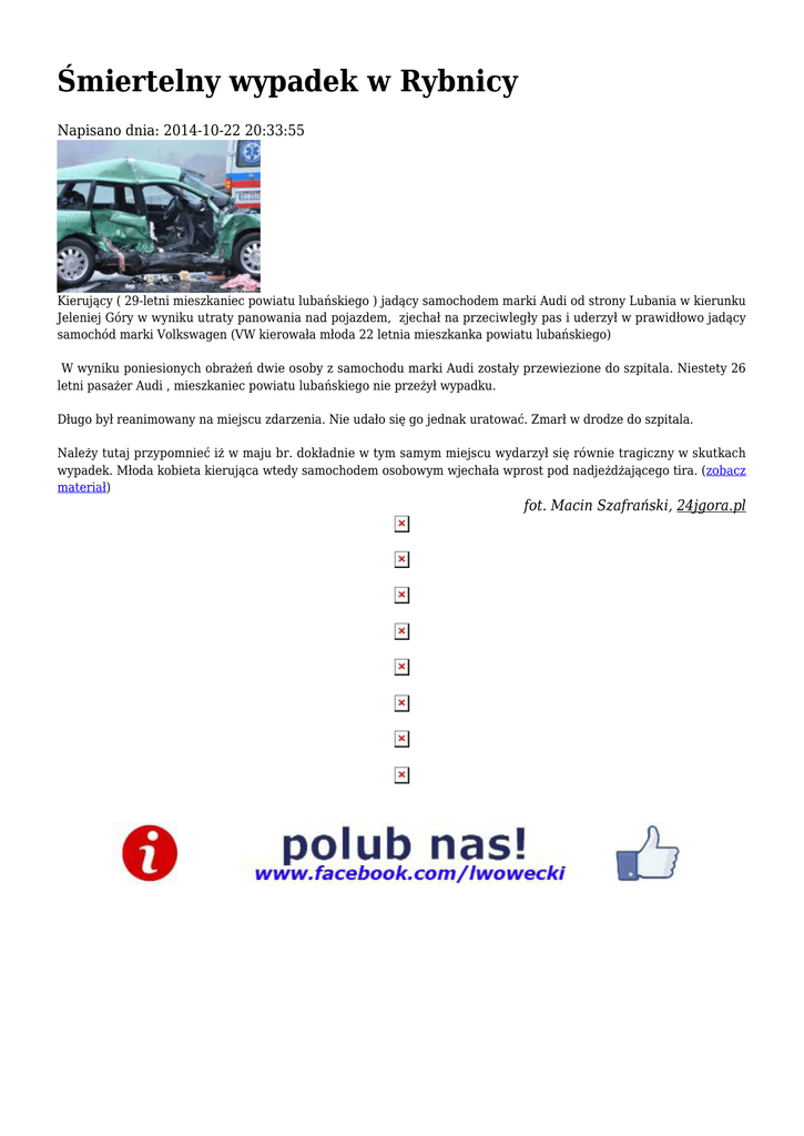 Śmiertelny wypadek w Rybnicy Napisano dnia: 2014-10-22 20:33:55 Kierujący ( 29-letni mieszkaniec powiatu lubańskiego ) jadący samochodem marki Audi od strony Lubania w kierunku Jeleniej Góry w wyniku utraty panowania nad pojazdem, zjechał na przeciwległy pas i uderzył w prawidłowo jadący samochód marki Volkswagen (VW kierowała młoda 22 letnia mieszkanka powiatu lubańskiego) W wyniku poniesionych obrażeń dwie osoby z samochodu marki Audi zostały przewiezione do szpitala. Niestety 26 letni pasażer Audi , mieszkaniec powiatu lubańskiego nie przeżył wypadku. Długo był reanimowany na miejscu zdarzenia. Nie udało się go jednak uratować. Zmarł w drodze do szpitala. Należy tutaj przypomnieć iż w maju br. dokładnie w tym samym miejscu wydarzył się równie tragiczny w skutkach wypadek. Młoda kobieta kierująca wtedy samochodem osobowym wjechała wprost pod nadjeżdżającego tira. (zobacz materiał) fot. Macin Szafrański, 24jgora.pl