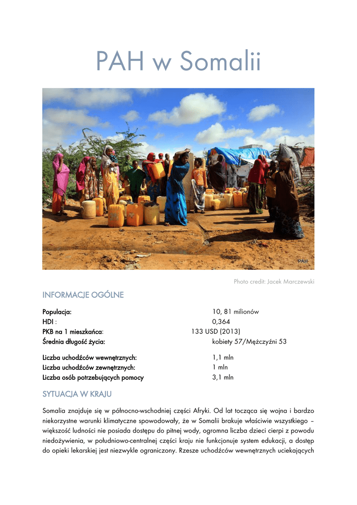 PAH w Somalii Photo credit: Jacek Marczewski INFORMACJE OGÓLNE Populacja: HDI : PKB na 1 mieszkańca: Średnia długość życia: Liczba uchodźców wewnętrznych: Liczba uchodźców zewnętrznych: Liczba osób potrzebujących pomocy 10, 81 milionów 0,364 133 USD (2013) kobiety 57/Mężczyźni 53 1,1 mln 1 mln 3,1 mln SYTUACJA W KRAJU Somalia znajduje się w północno-wschodniej części Afryki. Od lat tocząca się wojna i bardzo niekorzystne warunki klimatyczne spowodowały, że w Somalii brakuje właściwie wszystkiego – większość ludności nie posiada dostępu do pitnej wody, ogromna liczba dzieci cierpi z powodu niedożywienia, w południowo-centralnej części kraju nie funkcjonuje system edukacji, a dostęp do opieki lekarskiej jest niezwykle ograniczony. Rzesze uchodźców wewnętrznych uciekających przed toczącą się wojną gromadzą się w obozach przy większych ośrodkach miejskich, gdzie mieszkając w ogromnym zatłoczeniu, w warunkach poniżej jakichkolwiek przyjętych standardów mieszkaniowych i sanitarnych. Powszechne są w Somalii choroby takie jak malaria i cholera, a dzieci umierają z powodu braku dostępu do podstawowych szczepień. POMOC HUMANITARNA UDZIELANA PRZEZ PAH Misja Polskiej Akcji Humanitarnej w Somalii działa od października 2011r. Założenie Misji było reakcją na jeden z największych kryzysów humanitarnych XXI wieku – klęskę suszy i głodu w Rogu Afryki. W 2012 roku PAH zaczął realizację projektów wodno - sanitarnych w Puntlandzie oraz projektu dożywiania w Mogadiszu. Od połowy 2014 roku PAH przeniósł swoją misję do Mogadiszu, gdzie kontynuuje działalność w sektorze wodno – sanitarnym. Od jej założenia, misja PAH w Somalii pomogła ok. 110 tysiącom osób. PROGRAM WODNO-SANITARNY projekt rewitalizacji źródła w Ceel Madobe (2012) We współpracy z organizacją Muslim Aid, PAH wsparła swoim projektem 2500 mieszkańców wioski. Projekt polegał na połączeniu wioski ze znajdującym się w głębokim kanionie źródłem. Wybudowaliśmy w Ceel Madobe wieżę ciśnień, punkty czerpań dla ludzi, poidła dla zwierząt, pomieszczenie na generator, wyposażyliśmy skonstruowany system w niezbędny sprzęt i przeszkoliliśmy grupę mieszkańców na operatorów i mechaników. Przeprowadzone zostały również szkolenia z higieny. projekt poprawy zdrowia uczniów i nauczycieli 8 szkół podstawowych w Somalii (2013) Projekt realizowany poprzez zwiększenie dostępu do wody, sanitariatów i żywności bogatej w minerały i witaminy, a także podniesienie świadomości o zasadach higieny Projekt umożliwił budowę siedmiu berkad (tradycyjnych zbiorników wodnych), stworzenie ogródków, budowę sanitariatów oraz punktów mycia rąk w siedmiu szkołach podstawowych (3047 dzieci). Dzięki dotacji nauczyciele zostali przeszkoleni z zakresu higieny, którzy będą promować odpowiednie praktyki higieniczne w poszczególnych szkołach. Ponadto szkoły zostały wyposażone w zapasy środków czystości i produktów higienicznych, które pozwolą na prawidłowe zastosowanie zasad higieny przez uczniów. bieżąca woda w placówce medycznej w obozie Jowle, Garowe (2013) W ramach projektu sala zabiegowa w placówce dla przyszłych matek w obozie Jowle w Puntlandzie została wyposażona w krany z bieżącą wodą. Celem projektu było zmniejszenie skali występowania zakażeń i powikłań, do których dochodziło po zabiegach przeprowadzanych w placówce medycznej. projekt ECHO - Pomoc w obozach w Garowe i Mogadiszu (2013/2014) Projekt zapewnił dostęp do czystej wody 20 000 uchodźcom wewnętrznym, poprzez budowę 11 płytkich studni w obozie Jowle w Garowe, a także rehabilitację studni wraz z zapewnieniem systemu doprowadzającego wodę w obozach dla uchodźców wewnętrznych w Mogadiszu, naprawę i budowę sanitariatów, dystrybucję wody, zestawów higienicznych, budowę stacji składowania śmieci, sprzątania obozów, szkolenia dla inżynierów oraz promocję higieny. projekt ECHO – Pomoc w obozach dla uchodźców wewnętrznych w Garowe i w Mogadiszu (2014/2015) W ramach projektu zapewniliśmy dostęp do czystej wody oraz sanitariatów ponad 55 000 osobom. Odnowiliśmy 12 płytkich studni w obozie w Jowle oraz stworzyliśmy system wodociągowy i wybudowaliśmy kiosk wodny wyposażony w 16 kranów w obozie w Mogadiszu. Dostarczyliśmy zestawy higieniczne do ok. 3000 gospodarstw domowych w częściach obozów o najtrudniejszych warunkach bytowych. Projekt obejmował również działania edukacyjne związane z odpowiednimi praktykami higienicznymi oraz gospodarowaniem odpadami w obozach. projekt ECHO – Pomoc w obozach dla uchodźców wewnętrznych w Mogadiszu (2015/2016) Działania projektowe zapewnią dostęp do wody uchodźcom i uchodźczyniom z trudno dostępnych obozów w Lower i Middle Shabelle oraz z Mogadiszu. Dzięki odnowieniu 8 płytkich studni oraz 1 studni głębinowej poprawiła 21 000 osób posiada lepszy dostęp wody, co oznacza, że skrócił się dystans do najbliższego jej źródła i czas oczekiwania w kolejce. Dodatkowo przeszkoliliśmy 20 mechaników i mechaniczek pomp, którzy odpowiedzialni będą za utrzymanie studzien w dobrym stanie technicznym.1000 gospodarstw domowych o najcięższej sytuacji objętych zostało trzymiesięcznym programem bezpośredniego dostarczania wody. Zbudowaliśmy też 100 latryn w Mogadiszu, w miejscach gdzie wcześniej nie było dostępu do sanitariatów, ograniczając rozprzestrzenianie chorób kolejnych 100 w Jowhar w regionie Middle Shabelle. W ramach projektu rehabilitujemy również jeszcze jedną studnię głębinową. Naszym działaniom towarzyszą kampanie promujące odpowiednie praktyki higieniczne, zachęcamy też gospodarstwa domowy aby inwestowały w regularne opróżnianie latryn, przedłużając tym samym ich żywotność. Szkolimy też przedstawicielki i przedstawicieli społeczności lokalnych ze sposobów przeciwdziałania skutkom kryzysów (tzw. Disas