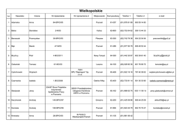 Wielkopolskie Lp. Nazwisko Imiona Miejscowość Kod pocztowy Telefon 1 Telefon 2 84-BPiO/95 Poznań 61-057 (61) 876 81 89 600 59 14 80 2-N/93 Kalisz 62-800 (62) 753 04 62 509 13 44 33 35-BPiO/93 Pleszew 63-300 (62) 742 76 38 504 22 04 84 47-N/93 Poznań 61-286 (61) 877 60 78 606 49 52 44 Nr Uprawnienia Nr Uprawnienia 2 e-mail 1 Adamska Anna 2 Bałos Stanisław 3 Banaszak Przemysław 4 Bąk Marek 5 Brychcy Piotr 4-BO/2011 Nowy Tomysl 64-300 (61) 442 30 87 602 39 61 40 [email protected] 6 Ciekański Tomasz 61-BO/03 Leszno 64-100 (65) 529 92 35 601 76 95 72 ł[email protected] 7 Cybichowski Wojciech Poznań 60-468 (61) 822 16 16 797 40 36 62 [email protected] 8 Czarnecka Izabela Ostrów Wlkp. 63-400 (62) 733 91 14 501 30 33 90 [email protected] Poznan 60-162 (61) 868 02 75 603 11 58 14 [email protected] 9 Gładysiak Jerzy 70/91 BPU "Baprogum" Sp. z o.o. 1-BO/2008 204/87 Biuro Projektów Inżynierska Spółdzielnia Pracy w Poznaniu 395/91 Przedsiębiorstwo Usługowo-Handlowe ARPA w Poznaniu [email protected] 10 Kaczmarek Andrzej 145-BPiO/97 Gniezno 62-200 (61) 425 09 86 606 44 25 09 [email protected] 11 Korduba Andrzej 106-BPiO/95 Poznań 61-894 (61) 823 40 79 602 70 75 47 [email protected] 12 Krotoska Anna 28-BPiO/93 Poznań 61-135 (61) 861 06 42 B.P-B.B.O. Miastoprojekt-Poznań 13 Kryszak- Majewska Halina 209-BPiO/04 Baranów 63-604 (62) 791 62 49 603 93 68 43 [email protected] 14-N/93 Konin 62-502 (63) 240 80 05 605 69 55 40 [email protected] 104-BPiO/95 Środa Wlkp. 63-100 (61) 285 42 22 16-N/93 Poznań 60-513 (61) 843 43 85 605 62 43 13 anna [email protected] 14 Łabuda Katarzyna 15 Machajewski Janusz 16 Marczak Anna 17 Maziarz Mirosława 62-BPiO/94 Poznań 61-698 (61)820 67 30 18 Moś Jacek 166-BPiO/00 Witaszyce 62-230 (61) 740 11 26 606 68 98 35 [email protected] 19 Nowacka Kazimiera 50-N/93 Piła 64-920 (67) 351 14 99 602 66 67 42 [email protected] 20 Popiel Ewa 193-BPiO/01 Międzychód 64-400 (95) 748 55 04 608 30 36 31 [email protected] 21 Reimann Elżbieta 94-BPiO/95 Poznań 60-559 (61)847 67 70 604 50 28 85 22 Rogalka Barbara 195-BPiO/01 Leszno 64-100 (65) 526 29 01 609 95 95 05 23 Rothe Anna 100-BPiO/95 Poznań 61-738 (61) 851 58 03 601 35 21 56 24 Silski Walerian 148-BPiO/97 Nowy Tomyśl 64-300 25 Skubel Henryk 30-BP/95 Poznań 61-426 (61) 830 00 18 26 Skrzypczyński Zenon 66-BPiO/94 Szamotuły 64-400 (61) 292 03 19 [email protected] 600 24 72 31 [email protected] [email protected] 27 Słowińska Wanda 67-BPiO/94 Konin 62-510 (63) 245 00 65 600 98 43 51 28 Sobczak Aurelia 15-BPiO/2008 Zbiersk 62-830 (62) 752 05 88 606 98 81 05 [email protected] 29 Sobkowiak Andrzej 8-BOS/2010 Poznań 60-104 (61) 830 61 37 50235 69 51 [email protected] 30 Sobkowiak Ryszard 4-N/06 Leszno 64-100 (65)520 18 24 605 69 31 77 [email protected] 31 Stelmach Piotr 1-BO/2013 Pakosław 63-920 603 94 98 20 32 Suseł Andrzej 46-BPiO/93 Leszno 64-100 605 36 63 15 33 Ścierska Ewa 165-BPiO/00 Ostrzeszów 63-500 (62) 586 10 08 600 07 35 06 34 Tarczykowski Edmund 69-BPiO/94 Wyrzysk 89-300 (67) 286 23 38 605 31 05 15 35 Zielińska Elżbieta 28-N/93 Poznań 61-245 (61) 876 91 19 602 63 96 46 [email protected] 36 Żabierek Magdalena 15-BO/2010 Konin 62-502 664 01 48 62 [email protected] 36 Żmudziński Janusz 29-N/93 Poznań 60-645 (61) 823 39 30 513 03 40 77 [email protected]
