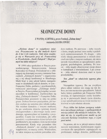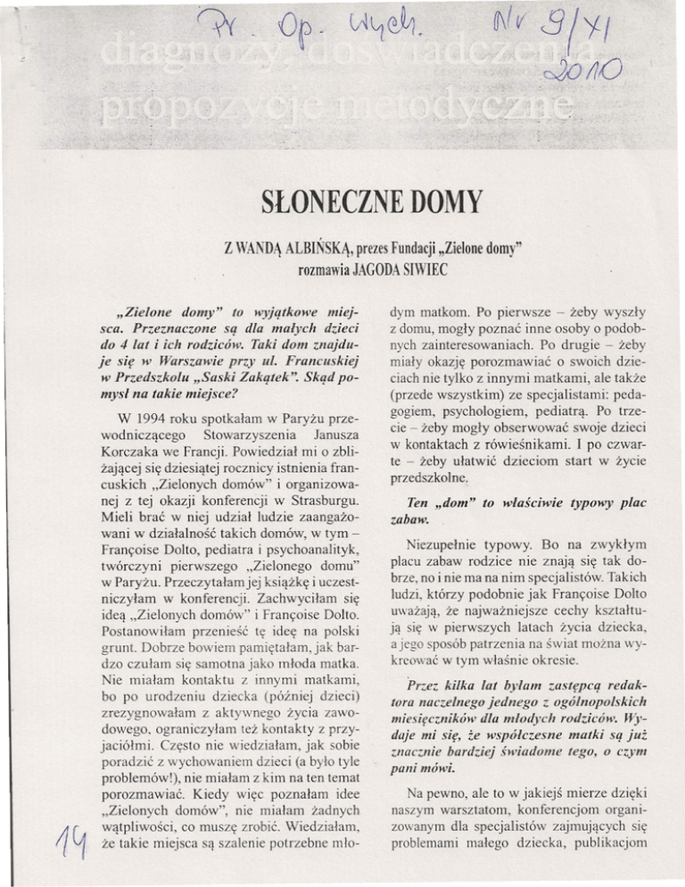 .' SŁONECZNE DOMY Z WANDĄ ALBIŃSKĄ, prezes Fundacji "Zielone domy" rozmawia JAGODA SIWIEC "Zielone domy" to wyjqtkowe miejsca. Przeznaczone sq dla małych dzieci do 4 lat i ich rodziców. Taki dom znajduje się w Warszawie przy ul. Francuskiej w Przedszkolu "Saski Zakątek". Skąd pomysł na takie miejsce? W 1994 roku spotkałam w Paryżu przewodniczącego Stowarzyszenia Janusza Korczaka we Francji. Powiedział mi o zbliżającej się dziesiątej rocznicy istnienia francuskich "Zielonych domów" i organizowanej z tej okazji konferencji w Strasburgu. Mieli brać w niej udział ludzie zaangażowani w działalność takich domów, w tym Francoise Dolto, pediatra i psychoanalityk, twórczyni pierwszego "Zielonego domu" w Paryżu. Przeczytałam jej książkę i uczestniczyłam w konferencji. Zachwyciłam się ideą "Zielonych domów" i Francoise Dolto. Postanowiłam przenieść tę ideę na polski grunt. Dobrze bowiem pamiętałam, jak bardzo czułam się samotna jako młoda matka. Nie miałam kontaktu z innymi matkami, bo po urodzeniu dziecka (później dzieci) zrezygnowałam z aktywnego życia zawodowego. ograniczyłam też kontakty z przyjaciółmi. Często nie wiedziałam, jak sobie poradzić z wychowaniem dzieci (a było tyle problemów!), nie miałam z kim na ten temat porozmawiać. Kiedy więc poznałam idee "Zielonych domów", nie miałam żadnych wątpliwości, co muszę zrobić. Wiedziałam, że takie miejsca są szalenie potrzebne mło- dym matkom. Po pierwsze - żeby wyszły z domu, mogły poznać inne osoby o podobnych zainteresowaniach. Po drugie - żeby miały okazję porozmawiać o swoich dzieciach nie tylko z innymi matkami, ale także (przede wszystkim) ze specjalistami: pedagogiem, psychologiem, pediatrą. Po trzecie - żeby mogły obserwować swoje dzieci w kontaktach z rówieśnikami. I po czwarte - żeby ułatwić dzieciom start w życie przedszkolne. Ten "dom" to właściwie typowy plac zabaw. Niezupełnie typowy. Bo na zwykłym placu zabaw rodzice nie znają się tak dobrze, no i nie ma na nim specjalistów. Takich ludzi, którzy podobnie jak Francoise Dolto uważają, że najważniejsze cechy kształtują się w pierwszych latach życia dziecka, a jego sposób patrzenia na świat można wykreować w tym właśnie okresie. Pr-;.ezkilka lat byłam zastępcą redaktora naczelnego jednego Z ogólnopolskich miesięczników dla młodych rodziców. Wydaje mi się, że współczesne matki są już znacznie bardziej świadome tego, o czym pani mówi. a pewno, ale to w jakiejś mierze dzięki naszym warsztatom, konferencjom organizowanym dla specjalistów zajmujących się problemami małego dziecka, publikacjom