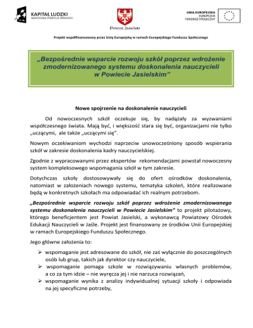 Projekt współfinansowany przez Unię Europejską w ramach Europejskiego Funduszu Społecznego „Bezpośrednie wsparcie rozwoju szkół poprzez wdrożenie zmodernizowanego systemu doskonalenia nauczycieli w Powiecie Jasielskim” Nowe spojrzenie na doskonalenie nauczycieli Od nowoczesnych szkół oczekuje się, by nadążały za wyzwaniami współczesnego świata. Mają być, i większość stara się być, organizacjami nie tylko „uczącymi, ale także „uczącymi się”. Nowym oczekiwaniom wychodzi naprzeciw unowocześniony sposób wspierania szkół w zakresie doskonalenia kadry nauczycielskiej. Zgodnie z wypracowanymi przez ekspertów rekomendacjami powstał nowoczesny system kompleksowego wspomagania szkół w tym zakresie. Dotychczas szkoły dostosowywały się do ofert ośrodków doskonalenia, natomiast w założeniach nowego systemu, tematyka szkoleń, które realizowane będą w konkretnych szkołach ma odpowiadać ich realnym potrzebom. „Bezpośrednie wsparcie rozwoju szkół poprzez wdrożenie zmodernizowanego systemu doskonalenia nauczycieli w Powiecie Jasielskim” to projekt pilotażowy, którego beneficjentem jest Powiat Jasielski, a wykonawcą Powiatowy Ośrodek Edukacji Nauczycieli w Jaśle. Projekt jest finansowany ze środków Unii Europejskiej w ramach Europejskiego Funduszu Społecznego. Jego główne założenia to: wspomaganie jest adresowane do szkół, nie zaś wyłącznie do poszczególnych osób lub grup, takich jak dyrektor czy nauczyciele, wspomaganie pomaga szkole w rozwiązywaniu własnych problemów, a co za tym idzie – nie wyręcza jej i nie narzuca rozwiązań, wspomaganie wynika z analizy indywidualnej sytuacji szkoły i odpowiada na jej specyficzne potrzeby, wspomaganie jest procesem, czyli odchodzi od pojedynczych, samodzielnych form doskonalenia. W ramach projektu wspomaganiem objętych jest 19 Szkół Podstawowych, 26 Gimnazja, 6 Licea Ogólnokształcące, 6 Technika, 3 Przedszkola. W Gminie Skołyszyn do projektu przystąpili nauczyciele Szkoły Podstawowej w Kunowej, Szkoły Podstawowej w Skołyszynie, Szkoły Podstawowej w Lisowie, Gimnazjum w Kunowej, Gimnazjum w Bączalu Dolnym, Gimnazjum w Święcanach. Informacje o projekcie: Tytuł: „Bezpośrednie wsparcie rozwoju szkół poprzez wdrożenie zmodernizowanego systemu doskonalenia nauczycieli w Powiecie Jasielskim” Cel główny: Podniesienie jakości funkcjonowania systemu doskonalenia nauczycieli spójnego z potrzebami nauczycieli spójnego z potrzebami 57 szkół i 3 przedszkoli w Powiecie Jasielskim Priorytet: III Wysoka jakość systemu oświaty Działanie: 3.5. Kompleksowe wspomaganie rozwoju szkół Okres realizacji: 01.09.2013 – 31.08.2015 Obszar realizacji: Powiat Jasielski Projektodawca: Powiat Jasielski Biuro projektu: Powiatowy Ośrodek Edukacji Nauczycieli w Jaśle Jasło ul. Sokoła 6 tel. 13 446 24 26 [email protected]