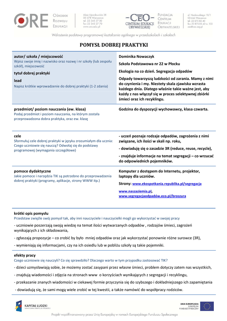 POMYSŁ DOBREJ PRAKTYKI autor/ szkoła / miejscowość Dominika Nowaczyk Wpisz swoje imię i nazwisko oraz nazwę i nr szkoły (lub zespołu szkół), miejscowość Szkoła Podstawowa nr 22 w Płocku tytuł dobrej praktyki Ekologia na co dzień. Segregacja odpadów lead Odpady towarzyszą ludzkości od zarania. Mamy z nimi do czynienia i my. Niestety skala zjawiska wzrasta każdego dnia. Dlatego właśnie takie ważne jest, aby każdy z nas włączył się w proces selektywnej zbiórki śmieci oraz ich recyklingu. Napisz krótkie wprowadzenie do dobrej praktyki (1-2 zdania) przedmiot/ poziom nauczania (ew. klasa) Godzina do dyspozycji wychowawcy, klasa czwarta. Podaj przedmiot i poziom nauczania, na którym została przeprowadzona dobra praktyka, oraz ew. klasę cele Sformułuj cele dobrej praktyki w języku zrozumiałym dla ucznia: Czego uczniowie się nauczą? Odwołaj się do podstawy programowej (wymagania szczegółowe) - uczeń poznaje rodzaje odpadów, zagrożenia z nimi związane, ich ilości w skali np. roku, - dowiaduję się o zasadzie 3R (reduce, reuse, recycle), - znajduje informacje na temat segregacji – co wrzucać do odpowiednich pojemników. pomoce dydaktyczne Jakie pomoce i narzędzia TIK są potrzebne do przeprowadzenia dobrej praktyki (programy, aplikacje, strony WWW itp.) Komputer z dostępem do Internetu, projektor, laptopy dla uczniów. Strony: www.ekospotkania.republika.pl/segregacja www.naszaziemia.pl, www.segregacjaodpadów.eco.pl/broszura krótki opis pomysłu Przedstaw zwięźle swój pomysł tak, aby inni nauczyciele i nauczycielki mogli go wykorzystać w swojej pracy - uczniowie poszerzają swoją wiedzę na temat ilości wytwarzanych odpadów , rodzajów śmieci, zagrożeń wynikających z ich składowania, - zgłaszają propozycje – co zrobić by było mniej odpadów oraz jak wykorzystać ponownie różne surowce (3R), - wymieniają się informacjami, czy na ich osiedlu lub w pobliżu szkoły są takie pojemniki. efekty pracy Czego uczniowie się nauczyli? Co się sprawdziło? Dlaczego warto w tym przypadku zastosować TIK? - dzieci uzmysławiają sobie, że możemy zostać zasypani przez własne śmieci, problem dotyczy zatem nas wszystkich, - znajdują wiadomości i zdjęcia na stronach www o korzyściach wynikających z segregacji i recyklingu, - przekazanie znanych wiadomości w ciekawej formie przyczynia się do szybszego i dokładniejszego ich zapamiętania - dowiadują się, że sami mogą wiele zrobić w tej kwestii, a także namówić do współpracy rodziców. uwagi Jakie działania planujesz w przyszłości? Czy zamierzasz zmienić lub rozwinąć swój pomysł? Przed czym chcesz przestrzec naśladowców dobrej praktyki? załączniki Materiały przygotowane przez nauczyciela (np. karty pracy, krzyżówki, quizy) oraz strona WWW, na której znajduje się dobra praktyka (prace uczniów stworzone w jej ramach) - uczniowie mogą w grupach zaprojektować pojemnik (zabawny, intrygujący) zachęcający do wrzucania tam odpadów
