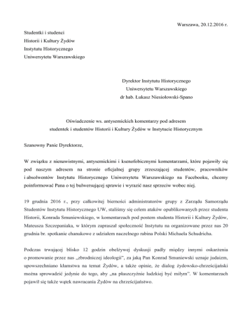 Warszawa, 20.12.2016 r. Studentki i studenci Historii i Kultury Żydów Instytutu Historycznego Uniwersytetu Warszawskiego Dyrektor Instytutu Historycznego Uniwersytetu Warszawskiego dr hab. Łukasz Niesiołowski-Spano Oświadczenie ws. antysemickich komentarzy pod adresem studentek i studentów Historii i Kultury Żydów w Instytucie Historycznym Szanowny Panie Dyrektorze, W związku z nienawistnymi, antysemickimi i ksenofobicznymi komentarzami, które pojawiły się pod naszym adresem na stronie oficjalnej grupy zrzeszającej studentów, pracowników i absolwentów Instytutu Historycznego Uniwersytetu Warszawskiego na Facebooku, chcemy poinformować Pana o tej bulwersującej sprawie i wyrazić nasz sprzeciw wobec niej. 19 grudnia 2016 r., przy całkowitej bierności administratorów grupy z Zarządu Samorządu Studentów Instytutu Historycznego UW, staliśmy się celem ataków opublikowanych przez studenta Historii, Konrada Smuniewskiego, w komentarzach pod postem studenta Historii i Kultury Żydów, Mateusza Szczepaniaka, w którym zapraszał społeczność Instytutu na organizowane przez nas 20 grudnia br. spotkanie chanukowe z udziałem naczelnego rabina Polski Michaela Schudricha. Podczas trwającej blisko 12 godzin obelżywej dyskusji padły między innymi oskarżenia o promowanie przez nas „zbrodniczej ideologii”, za jaką Pan Konrad Smuniewski uznaje judaizm, upowszechniano kłamstwa na temat Żydów, a także opinie, że dialog żydowsko-chrześcijański można sprowadzić jedynie do tego, aby „na płaszczyźnie ludzkiej być miłym”. W komentarzach pojawił się także wątek nawracania Żydów na chrześcijaństwo. Konto Pana Smuniewskiego zostało ostatecznie zablokowane przez administratorów grupy, wówczas jednak została z niej wykluczona również ta część z nas, która starała się bronić dobrego imienia Judaistyki. Zapowiedź administratorów o przeprowadzeniu „czystki” poprzez całkowitą weryfikację członków grupy pod kątem ich statusu akademickiego wywołała powszechne oburzenie wśród wszystkich studentów Instytutu. Uważamy, że takie działania są krzywdzące dla członków Instytutu – studentów, pracowników i absolwentów – oraz kompromituje Instytut w środowisku akademickim. Niestety zablokowanie po wielu godzinach konta Pana Smuniewskiego nie zakończyło bulwersującej sprawy. Równie obelżywe komentarze, tym razem spersonalizowane, skierowane bezpośrednio w naszym kierunku, pojawiły się na Twitterze na koncie należącym do Pana Konrada Smuniewskiego. Określenie studentów Judaistyki jako „bolszewików”, insynuowanie, że jesteśmy członkami jednej z lewicowych partii politycznych, czy wreszcie nazwanie nas „młodą żydokomuną”, uznajemy za niedopuszczalne. Jesteśmy oburzeni, niezwykle poruszeni i nie zgadzamy się na akceptację lub ciche przyzwolenie Zarządu Samorządu Studentów na to, co się stało. Już wcześniej otrzymywaliśmy ze strony studentów Historii różne krzywdzące komentarze na nasz temat, często odczuwaliśmy wykluczenie ze społeczności Instytutu lub traktowanie nas jako studentów gorszej kategorii, lecz tym razem nie możemy milczeć. Tym bardziej, że było to działanie studenta Instytutu Historycznego Uniwersytetu Warszawskiego, którego studenci powinni być w naszej opinii nadzwyczaj wrażliwi na wszelkie przejawy ksenofobii, próby fałszowania przeszłości czy utrwalania niezwykle szkodliwych stereotypów. Powyższe oskarżenia przywołują nam na myśl najgorsze antysemickie hasła wygłaszane przez narodowo-radykalne ugrupowania na Uniwersytecie Warszawskim w drugiej połowie lat 30. XX wieku. Niezwłocznie powiadomiliśmy o tej sprawie dr hab. Annę Michałowską-Mycielską, która następnie zawiadomiła dr. hab. Piotra Węcowskiego, Zastępcę Dyrektora ds. studenckich. Do niniejszego pisma dołączamy materiały dokumentujące dyskusje z udziałem Pana Konrada Smuniewskiego. Słowa te kierujemy do Pana nie tylko jako do Dyrektora Instytutu, lecz także współtwórcy Studiów Judaistycznych i nauczyciela akademickiego, który w przeszłości okazał nam wiele pomocy. Mamy nadzieję, że Dyrekcja Instytutu wyjaśni tę sprawę i wyciągnie konsekwencje wobec Pana Konrada Smuniewskiego oraz administratorów grupy na Facebooku, a my – studentki i studenci Historii i Kultury Żydów – znowu będziemy mogli poczuć się pełnoprawnymi członkami społeczności Instytutu Historycznego, który współtworzymy i którego jesteśmy częścią. Dziś czujemy się zastraszeni. W obliczu tej bulwersującej sprawy chcielibyśmy także ponowić nasze zaproszenie na spotkanie chanukowe, które odbędzie się w Instytucie 20 grudnia 2016 r. o godz. 18.30 w sali nr 17. Będziemy zaszczyceni Pana obecnością. Z wyrazami szacunku Do wiadomości: dr hab. Anna Michałowska-Mycielska dr August Grabski dr Magdalena Kozłowska dr Artur Markowski dr Monika Polit dr Marzena Zawanowska mgr Regina Gromacka