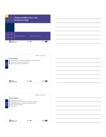 2011 Nieprawidłowości i ich konsekwencje Marek Szwed-Lipiński Warszawa, 1 lipca 2011 r. Warszawa, 1 lipca 2011 r. Cel prezentacji Nieprawidłowość jako zdarzenie niejednolite pod względem prawnym Konsekwencje wystąpienia nieprawidłowości Podejście procesowe do nieprawidłowości Warszawa, 1 lipca 2011 r. Plan prezentacji Definicja nieprawidłowości Problematyka procesów niezwiązanych z odzyskiwaniem kwot Problematyka procesów związanych z odzyskiwaniem kwot Rejestr obciąŜeń na projekcie Raportowanie Warszawa, 1 lipca 2011 r. Plan prezentacji Definicja nieprawidłowości Problematyka procesów niezwiązanych z odzyskiwaniem kwot Problematyka procesów związanych z odzyskiwaniem kwot Rejestr obciąŜeń na projekcie Raportowanie Warszawa, 1 lipca 2011 r. Definicja nieprawidłowości Brak jednolitej definicji nieprawidłowości Rozumienie wąskie – nieprawidłowość w rozumieniu przepisów Rozporządzenia 1083/2006 Rozumienie szerokie – wszelkie zakłócenia normalnego toku postępowania, z którymi wiąŜe się sankcja przewidziana przez przepisy prawa: Naruszenie dyscypliny finansów publicznych Naruszenie przepisów karnych Istotne naruszenie umowy zawartej z PARP Nieprawidłowości w ujęciu art. 211 / 207 ustawy o finansach publicznych Warszawa, 1 lipca 2011 r. Konsekwencje związane z definicją nieprawidłowości RóŜnice w podejściu do zjawiska RóŜnice w akcentowaniu poszczególnych aspektów Konieczność kompleksowej oceny zdarzenia na poziomie instytucji stwierdzającej nieprawidłowość Warszawa, 1 lipca 2011 r. Plan prezentacji Definicja nieprawidłowości Problematyka procesów niezwiązanych z odzyskiwaniem kwot Problematyka procesów związanych z odzyskiwaniem kwot Rejestr obciąŜeń na projekcie Raportowanie Warszawa, 1 lipca 2011 r. Procesy niezwiązane z odzyskiwaniem kwot Zawiadomienie o podejrzeniu popełnienia przestępstwa / wykroczenia Zawiadomienie o ujawnionych okolicznościach wskazujących na naruszenie dyscypliny finansów publicznych Umieszczenie w wykazie podmiotów niewywiązujących się ze zobowiązań Wstrzymanie płatności Zawiadomienie Instytucji Zarządzającej o wystąpieniu nieprawidłowości Warszawa, 1 lipca 2011 r. Zawiadomienie o podejrzeniu popełnienia czynu zabronionego Obowiązek wynika z art. 304 § 2 KPK Zawiadomienie kierowane jest do Prokuratury bądź Policji Najczęstsze Przestępstwa: Art. 271 KK - fałszerstwo Art. 297 KK – oszustwo kapitałowe Art. 62 KKS – posłuŜenie się wadliwą bądź nierzetelną fakturą Warszawa, 1 lipca 2011 r. Zawiadomienie o naruszeniu dyscypliny finansów publicznych Składane na podstawie art. 93 ustawy o odpowiedzialności za naruszenie dyscypliny finansów publicznych w związku z czynem określonym w art. 13 pkt 3 Zawiadomienie kierowane do Rzecznika Dyscypliny Finansów Publicznych właściwego dla Instytucji Zarządzającej Warszawa, 1 lipca 2011 r. Umieszczenie w wykazie Polega na wykluczeniu z moŜliwości otrzymania dofinansowania bądź poŜyczki Okres wykluczenia – 3 lata od rozwiązania umowy Podstawa wykluczenie – art. 6b ust. 3 pkt 3 lit c ustawy o utworzeniu Polskiej Agencji Rozwoju Przedsiębiorczości Wykluczenie nie jest toŜsame z wykluczeniem na podstawie przepisów o finansach publicznych Warszawa, 1 lipca 2011 r. Plan prezentacji Definicja nieprawidłowości Problematyka procesów niezwiązanych z odzyskiwaniem kwot Problematyka procesów związanych z odzyskiwaniem kwot Rejestr obciąŜeń na projekcie Raportowanie Warszawa, 1 lipca 2011 r. Przebieg procesu Stwierdzenie nieprawidłowości ze skutkami finansowymi Wezwanie do zwrotu bądź wyraŜenia zgody na potrącenie W przypadku negatywnego wyniku – wszczęcie postępowania administracyjnego i wydanie decyzji W przypadku złoŜenia odwołania – przekazanie go do Instytucji Zarządzającej W przypadku braku spłaty naleŜności – wydanie postanowienia o potrąceniu bądź wszczęcie postępowania egzekucyjnego w administracji Wykluczenie z moŜliwości otrzymania dofinansowania na podstawie przepisów ustawy o finansach publicznych Warszawa, 1 lipca 2011 r. Wezwanie do zwrotu Na podstawie umowy dofinansowania bądź art. 207 uFP Formy: Zwrot dofinansowania WyraŜenie zgody na potrącenie z kolejnej płatności Potrącenie na podstawie art. 207 ust. 8 uFP tylko za zgodą beneficjenta Termin 14 dni od dnia doręczenia wezwania Rygor wszczęcia postępowania administracyjnego Warszawa, 1 lipca 2011 r. Postępowanie administracyjne Wszczynane z urzędu po upływie terminu do zwrotu bądź wyraŜenia zgody na potrącenie MoŜliwość przeglądania akt, sporządzania notatek i odpisów MoŜliwość ustanowienia pełnomocnika W przypadku spłaty naleŜności przed wydaniem decyzji Wydanie decyzji administracyjnej Warszawa, 1 lipca 2011 r. Odwołania od decyzji Wnoszone w terminie 14 dni od dnia doręczenia decyzji Kierowane do Instytucji Zarządzającej za pośrednictwem Instytucji Pośredniczącej Samokontrola decyzji Warszawa, 1 lipca 2011 r. Egzekucja administracyjna Stosowane w przypadku braku (pełnej) spłaty bądź braku moŜliwości potrącenia naleŜności na podstawie art. 62 uFP Na podstawie ostatecznej decyzji bądź decyzji nieostatecznej, której nadano rygor natychmiastowej wykonalności Nie stosuje się upomnień Właściwym organem jest właściwy miejscowo Naczelnik Urzędu Skarbowego W przypadku bezskuteczności – powrót do postępowania administracyjnego i wydanie decyzji o odpowiedzialności osób trzecich Warszawa, 1 lipca 2011 r. Stosowanie ulg Na podstawie art. 64 uFP odsyłającego do art. 55 uFP: Umorzenie RozłoŜenie na raty Odroczenie terminu spłaty Stosowanie w przypadku niemoŜliwości odzyskania naleŜności? Warszawa, 1 lipca 2011 r. Wykluczenie z moŜliwości otrzymania dofinansowania (1/2) Odmienne przesłanki w poszczególnych ustawach o finansach publicznych Przesłanki – wykorzystanie środków w sposób, o którym mowa w art. 207 ust. 1 uFP i: otrzy