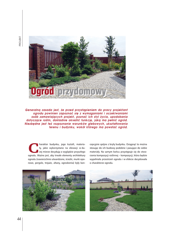 PROJEKT Ogród przydomowy Generalną zasada jest, że przed przystąpieniem do pracy projektant ogrodu powinien zapoznać się z wymaganiami i oczekiwaniami osób zamawiających projekt, poznać ich styl życia, upodobania dotyczące roślin, dokładnie określić funkcję, jaką ma pełnić ogród. Niezbędne jest też rozpoznanie warunków glebowych, ukształtowania terenu i budynku, wokół którego ma powstać ogród. C 44 harakter budynku, jego kształt, materia- cepcyjnie spójne z bryłą budynku. Osiągnąć to można ły, jakie wykorzystano na elewacji w du- stosując do ich budowy podobne i pasujące do siebie żej mierze decydują o wyglądzie przyszłego materiały. Na samym końcu przystępuje się do stwo- ogrodu. Ważne jest, aby trwałe elementy architektury rzenia kompozycji roślinnej – kompozycji, która będzie ogrodu (nawierzchnie utwardzone, ścieżki, murki opo- wypełniała przestrzeń ogrodu i w efekcie decydowała rowe, pergole, trejaże, altany, ogrodzenia) były kon- o charakterze ogrodu. 45 PROJEKT klinkierowej i elementów drewnianych. Ogrodzenie PROJEKT Klinkier w ogrodzeniu i na elewacji to było już gotowe przed czynnościami projektowymi ogrodu, więc wraz z domem w oczywisty sposób Prezentowany ogród powstał wokół piętrowego domu, determinowało już na samym wstępie formę i kształt którego elewację tworzy żółty tynk połączony z cegłą tworzonego ogrodu. klinkierową. Dom jest usytuowany na działce w ten sposób, że do zagospodarowania pozostała przestrzeń od Zachować umiar frontu, z tyłu oraz wąskie pasy z dwóch boków domu. Front miał pełnić funkcję reprezentacyjną, natomiast Cegłę klinkierową zastosowano zarówno na elewa- część ogrodu położona z tyłu domu miała stać się miej- cji domu, jak i w ogrodzeniu, przez co stała się stała scem wypoczynku. Tam też znajduje się taras, będący się elementem wiążącym, jednak jej zastosowa- podstawowym miejscem wypoczynku mieszkańców. nie przy budowie innych, nowych elementów ogro- Właścicielom zależało jednak na stworzeniu dodat- du mogłoby już sprawić wrażenie pewnego przesytu. kowego miejsca, nieco oddalonego od domu, gdzie Wykorzystano za to inne materiały dobrze komponu- można by było wypocząć bezpośrednio wśród zieleni. jące się z cegłą. Do budowy nawierzchni użyto kostki W ogrodzie miało się również znaleźć miejsce do zaba- granitowej w dwóch odcieniach, szarym i żółtym, płyt wy dla dzieci w postaci piaskownicy. kamiennych oraz grysu. Naturalny charakter zastosowa- Boczne fragmenty ogrodu miały łączyć front z tyłem, nych materiałów oraz ich szlachetność dobrze wpisały a dodatkowo należało wydzielić z boku miejsce do par- się w klimat wytworzony przez cegłę. Ścieżka wykona- kowania samochodów. Działka o powierzchni ok. 800 na z kostki granitowej otacza budynek i jest podstawo- m kw. jest otoczona ogrodzeniem wykonanym z cegły wym ciągiem komunikacyjnym ogrodu. Aby urozmaicić jej formę, wpisano w nią żółto-szare okręgi. Motyw ten został powtórzony w trzech miejscach ogrodu, przed wejściem do domu, z boku budynku oraz w tylnej części ogrodu. Okrąg znajdujący się z tyłu budynku stał się obok tarasu miejscem wypoczynku, natomiast ten usytuowany z boku ogrodu urozmaicił miejsce parkingowe. Ścieżki wykonane z płyt kamiennych i grysu pełnią głównie funkcję ozdobną. Ścieżka usypana z grysu złamała płaszczyznę trawnika, utworzyła miejsce, w którym można posadzić kwitnące byliny. Płyty kamienne połączyły „formalną” granitową ścieżkę z miejscem przeznaczonym na wypoczynek. Zastosowane materiały dobrze ze sobą harmonizują, odpowiednie ich zestawienie oraz otoczenie prawidłowo dobranymi roślinami pozwala osiągnąć zamierzony efekt, czyli spójną kompozycję. Iwona Hładyszewska-Pawłowicz Autorka prowadzi własną pracownię projektowania ogrodów, jest m.in. projektantką ogrodu pokazanego w artykule 46