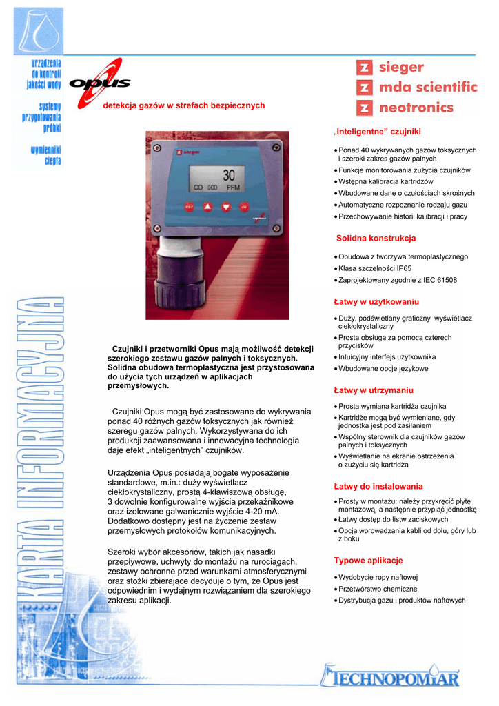 detekcja gazów w strefach bezpiecznych „Inteligentne” czujniki • Ponad 40 wykrywanych gazów toksycznych i szeroki zakres gazów palnych • Funkcje monitorowania zużycia czujników • Wstępna kalibracja kartridżów • Wbudowane dane o czułościach skrośnych • Automatyczne rozpoznanie rodzaju gazu • Przechowywanie historii kalibracji i pracy Solidna konstrukcja • Obudowa z tworzywa termoplastycznego • Klasa szczelności IP65 • Zaprojektowany zgodnie z IEC 61508 Łatwy w użytkowaniu • Duży, podświetlany graficzny wyświetlacz ciekłokrystaliczny Czujniki i przetworniki Opus mają możliwość detekcji szerokiego zestawu gazów palnych i toksycznych. Solidna obudowa termoplastyczna jest przystosowana do użycia tych urządzeń w aplikacjach przemysłowych. Czujniki Opus mogą być zastosowane do wykrywania ponad 40 różnych gazów toksycznych jak również szeregu gazów palnych. Wykorzystywana do ich produkcji zaawansowana i innowacyjna technologia daje efekt „inteligentnych” czujników. Urządzenia Opus posiadają bogate wyposażenie standardowe, m.in.: duży wyświetlacz ciekłokrystaliczny, prostą 4-klawiszową obsługę, 3 dowolnie konfigurowalne wyjścia przekaźnikowe oraz izolowane galwanicznie wyjście 4-20 mA. Dodatkowo dostępny jest na życzenie zestaw przemysłowych protokołów komunikacyjnych. Szeroki wybór akcesoriów, takich jak nasadki przepływowe, uchwyty do montażu na rurociągach, zestawy ochronne przed warunkami atmosferycznymi oraz stożki zbierające decyduje o tym, że Opus jest odpowiednim i wydajnym rozwiązaniem dla szerokiego zakresu aplikacji. • Prosta obsługa za pomocą czterech przycisków • Intuicyjny interfejs użytkownika • Wbudowane opcje językowe Łatwy w utrzymaniu • Prosta wymiana kartridża czujnika • Kartridże mogą być wymieniane, gdy jednostka jest pod zasilaniem • Wspólny sterownik dla czujników gazów palnych i toksycznych • Wyświetlanie na ekranie ostrzeżenia o zużyciu się kartridża Łatwy do instalowania • Prosty w montażu: należy przykręcić płytę montażową, a następnie przypiąć jednostkę • Łatwy dostęp do listw zaciskowych • Opcja wprowadzania kabli od dołu, góry lub z boku Typowe aplikacje • Wydobycie ropy naftowej • Przetwórstwo chemiczne • Dystrybucja gazu i produktów naftowych DANE TECHNICZNE Zasilanie 24 Vdc nominalnie (18-32 Vdc) Pobór mocy 1,5 W dla czujników toksycznych 2 W dla czujników katalitycznych 2 W dla czujników półprzewodnikowych Wyjścia wyjścia przekaźnikowe A1,A2 oraz Fault – obciążalność 2A, 30 Vdc, normalnie zwarte lub otwarte, normalnie zasilane lub nie zasilane 4-20 mA wyjście typu „sink”, typu „source” lub izolowane Materiał wykonania, masa Tworzywo termoplastyczne; 0,5 kg Dokładność Bazowa ±3%, przy 50% FSD ±4% Powtarzalność ±2% przy 50% FSD Liniowość <5% FSD Czas odpowiedzi (typowy) Czujnik katalityczny: T50<5s, T90<10s Czujniki gazów toksycznych: T50<12s, T90<30s Stabilność (typowa) <±3% FSD / rok (zero), <±4% FSD / rok (zakres) Temp. pracy -25 do +55°C (dla czujników gazów toksycznych zakres zależny od danej celki) Wilgotność 0-99% (brak kondensacji) Stopień ochrony IP65 (Nema 4) Poziom bezpieczeństwa Urządzenie zgodne z IEC 61508 (SIL Level 2) Zgodność EMC / elektryczna EN50270 / UL3101 Normy operacyjne EN61779, EN45544, EN50104, CSA C22.2 No.152 Dostępne gazy i zakresy (w przypadku innych gazów należy kontaktować się z firmą Technopomiar) Gaz Wzór Zakres Typ celki Gaz Wzór Zakres Typ celki Arsenowodór Boroetan Trójchlorek borowy Trójfluorek borowy Brom Tlenek etylenu Chlorek winylu Tlenek propylenu Tetrahydrotiofen Chlor AsH3 B2H6 BCl3 BF3 Br2 CH2-CH2-O CH2=CHCl C3H6O C4H8S Cl2 0-0,2ppm 0-0,4ppm 0-6ppm 0-4ppm 0-0,4ppm 0-4ppm 0-4ppm 0-80ppm 0-40ppm 0-2ppm; 0-5ppm; 0-15ppm ECC ECC ECC ECC ECC ECC ECC ECC ECC ECC Bromowodór Chlorowodór Cyjanowodór Fluorowodór Trójfluorek azotu Amoniak HBr HCl HCN HF NF3 NH3 0-12ppm 0-20ppm 0-20ppm 0-12ppm 0-40ppm 0-50ppm; 0-100ppm; 0-400ppm; 0-1000ppm ECC ECC ECC ECC ECC ECC/TF Trójfluorek chloru Dwutlenek chloru Tlenek węgla ClF3 ClO2 CO ECC ECC ECC NO NO2 O2 O3 PH3 SF6 Si2H6 0-100ppm 0-12ppm 0-21% V/V 0-0,4ppm 0-1,2ppm 0-4000ppm 0-20ppm ECC ECC ECC ECC/TF ECC ECC ECC Dwutlenek węgla CO2 ECC Dwuchlorosilan SiH2Cl2 0-10ppm ECC Fosgen Fluor COCl2 F2 0-0,4ppm 0-0,4ppm 0-100ppm; 0-200pmm; 0-500ppm 0-3000ppm; 0-2%V/V 0-0,4ppm 0-4ppm Tlenek azotu Dwutlenek azotu Tlen Ozon Fosfina Sześciofluorek siarki Sześciowodorek krzemu ECC ECC SiH4 Si(OCH2CH3)4 0-20ppm 0-40ppm ECC ECC Germanowodór GeH4 0-0,8ppm ECC Silan Ortokrzemian czteroetylu (TEOS) Dwutlenek siarki SO2 ECC Wodór Siarkowodór H2 H2S ECC ECC/TF CFC Lotne związki organiczne różne różne Selenek wodoru H2Se 0-1000ppm 0-20ppm; 0-50ppm; 0-100ppm 0-0,2ppm 0-8ppm; 0-15ppm różne różne ECC Gazy palne różne 0-100% LEL CAT/TF do ustalenia do ustalenia CAT- cz. elektrokatalityczny, ECC- cz. elektrochemiczny, TF- cz. półprzewodnikowy ul. Buforowa 4C, 52-131 Wrocław tel. +4871 332 98 00, faks +4871 332 98 30 www.technopomiar.pl; [email protected]