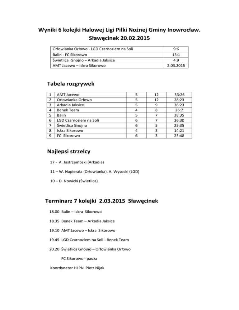 Wyniki 6 kolejki Halowej Ligi Piłki Nożnej Gminy Inowrocław. Sławęcinek 20.02.2015 Orłowianka Orłowo - LGD Czarnoziem na Soli Balin - FC Sikorowo Świetlica Gnojno – Arkadia Jaksice AMT Jacewo – Iskra Sikorowo 9:6 13:1 4:9 2.03.2015 Tabela rozgrywek 1 2 3 4 5 6 7 8 9 AMT Jacewo Orłowianka Orłowo Arkadia Jaksice Benek Team Balin LGD Czarnoziem na Soli Świetlica Gnojno Iskra Sikorowo FC Sikorowo 5 5 5 4 5 6 6 4 6 12 12 9 8 7 7 5 3 3 Najlepsi strzelcy 17 - A. Jastrzembski (Arkadia) 11 – W. Napierała (Orłowianka), A. Wysocki (LGD) 10 – D. Nowicki (Świetlica) Terminarz 7 kolejki 2.03.2015 Sławęcinek 18.00 Balin – Iskra Sikorowo 18.35 Benek Team – Arkadia Jaksice 19.10 AMT Jacewo – Iskra Sikorowo 19.45 LGD Czarnoziem na Soli - Benek Team 20.20 Świetlica Gnojno – Orłowianka Orłowo FC Sikorowo - pauza Koordynator HLPN Piotr Nijak 33:26 28:23 36:23 26:7 38:35 26:30 25:35 14:21 23:48
