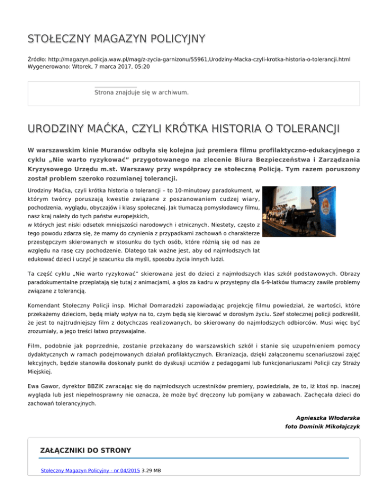 STOŁECZNY MAGAZYN POLICYJNY Źródło: http://magazyn.policja.waw.pl/mag/z-zycia-garnizonu/55961,Urodziny-Macka-czyli-krotka-historia-o-tolerancji.html Wygenerowano: Wtorek, 7 marca 2017, 05:20 Strona znajduje się w archiwum. URODZINY MAĆKA, CZYLI KRÓTKA HISTORIA O TOLERANCJI W warszawskim kinie Muranów odbyła się kolejna już premiera filmu profilaktyczno-edukacyjnego z cyklu „Nie warto ryzykować” przygotowanego na zlecenie Biura Bezpieczeństwa i Zarządzania Kryzysowego Urzędu m.st. Warszawy przy współpracy ze stołeczną Policją. Tym razem poruszony został problem szeroko rozumianej tolerancji. Urodziny Maćka, czyli krótka historia o tolerancji – to 10-minutowy paradokument, w którym twórcy poruszają kwestie związane z poszanowaniem cudzej wiary, pochodzenia, wyglądu, obyczajów i klasy społecznej. Jak tłumaczą pomysłodawcy filmu, nasz kraj należy do tych państw europejskich, w których jest niski odsetek mniejszości narodowych i etnicznych. Niestety, często z tego powodu zdarza się, że mamy do czynienia z przypadkami zachowań o charakterze przestępczym skierowanych w stosunku do tych osób, które różnią się od nas ze względu na rasę czy pochodzenie. Dlatego tak ważne jest, aby od najmłodszych lat edukować dzieci i uczyć je szacunku dla myśli, sposobu życia innych ludzi. Ta część cyklu „Nie warto ryzykować” skierowana jest do dzieci z najmłodszych klas szkół podstawowych. Obrazy paradokumentalne przeplatają się tutaj z animacjami, a głos za kadru w przystępny dla 6-9-latków tłumaczy zawiłe problemy związane z tolerancją. Komendant Stołeczny Policji insp. Michał Domaradzki zapowiadając projekcję filmu powiedział, że wartości, które przekażemy dzieciom, będą miały wpływ na to, czym będą się kierować w dorosłym życiu. Szef stołecznej policji podkreślił, że jest to najtrudniejszy film z dotychczas realizowanych, bo skierowany do najmłodszych odbiorców. Musi więc być zrozumiały, a jego treści łatwo przyswajalne. Film, podobnie jak poprzednie, zostanie przekazany do warszawskich szkół i stanie się uzupełnieniem pomocy dydaktycznych w ramach podejmowanych działań profilaktycznych. Ekranizacja, dzięki załączonemu scenariuszowi zajęć lekcyjnych, będzie stanowiła doskonały punkt do dyskusji uczniów z pedagogami lub funkcjonariuszami Policji czy Straży Miejskiej. Ewa Gawor, dyrektor BBZiK zwracając się do najmłodszych uczestników premiery, powiedziała, że to, iż ktoś np. inaczej wygląda lub jest niepełnosprawny nie oznacza, że może być dręczony lub pomijany w zabawach. Zachęcała dzieci do zachowań tolerancyjnych. Agnieszka Włodarska foto Dominik Mikołajczyk ZAŁĄCZNIKI DO STRONY Stołeczny Magazyn Policyjny - nr 04/2015 3.29 MB Ocena: 0/5 (0) Tweetnij