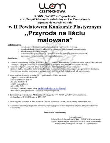 RODN „WOM” w Częstochowie oraz Zespół Szkolno-Przedszkolny nr 1 w Częstochowie zaprasza do wzięcia udziału w II Powiatowym Konkursie Plastycznym „Przyroda na liściu malowana” Cele konkursu: rozwijanie wyobraźni, wrażliwości , ekspresji i aktywności twórczej, rozwijanie kreatywności i odwagi w wyrażaniu własnych uczuć poprzez sztukę, kształtowanie poczucia estetyki, stworzenie okazji do integracji i poznania uczniów z innych środowisk szkolnych, prezentacja i popularyzacja twórczości plastycznej. Regulamin 1. Konkurs adresowany jest do uczniów klas I–VI szkoły podstawowej. Placówka może zgłosić do konkursu 3 osoby w kategorii wiekowej I–III oraz 3 osoby w kategorii wiekowej IV–VI (łącznie 6 osób). 2. Uczestnicy będą wykonywali prace indywidualnie na miejscu bez pomocy opiekunów. Konkurs będzie polegał na malowaniu obrazu na zasuszonym liściu, który zapewnią organizatorzy konkursu. Uczestników prosimy o zabranie ze sobą cienkich pędzli oraz farb plakatowych lub temperowych. 3. Kartę zgłoszenia należy przesłać do 17 października 2016 r. na adres: Zespół Szkolno-Przedszkolny nr 1 Szkoła Podstawowa nr 40 Al. Jana Pawła II 95 42-217 Częstochowa tel. 34 324 53 34 lub drogą elektroniczną na adres: [email protected] Ilość miejsc jest ograniczona – decyduje kolejność zgłoszeń. 4. Termin i miejsce konkursu: 9 listopada 2016 r., godz. 1100, RODN „WOM” w Częstochowie, al. Jana Pawła II 126/130, sala nr 236 i 237 5. Rozstrzygnięcie nastąpi w dniu konkursu i będzie połączone z otwarciem wystawy powstałych prac. 6. Uczestnicy akceptując regulamin konkursu, wyrażają zgodę na wykorzystanie ich prac, danych osobowych i wizerunku. Serdecznie zapraszamy Organizatorzy: Sylwia Kurcab, konsultant RODN „WOM” w Częstochowie Agata Filipiuk-Mojsa, nauczyciel ZS-P nr 1 w Częstochowie Ilona Nawrot, nauczyciel ZS-P nr 1 w Częstochowie Karta zgłoszenia do II Powiatowego Konkursu Plastycznego „Przyroda na liściu malowana” Dane placówki: - nazwa - adres - telefon - adres e-mail Imiona i nazwiska uczniów 1. ........................................................ kl. ….................... 2. ........................................................ kl. ….................... 3. ........................................................ kl. ….................... 4. ........................................................ kl. …................... 5. ........................................................ kl. …................... 6. ........................................................ kl. …................... Imię i nazwisko opiekuna / opiekunów
