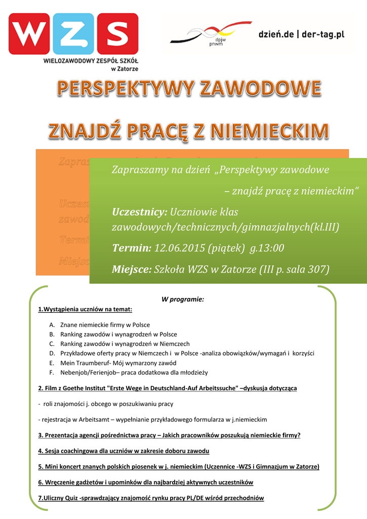 Zapraszamy na dzień „Perspektywy zawodowe – znajdź pracę z niemieckim“ Uczestnicy: Uczniowie klas zawodowych/technicznych/gimnazjalnych(kl.III) Termin: 12.06.2015 (piątek) g.13:00 Miejsce: Szkoła WZS w Zatorze (III p. sala 307) W programie: 1.Wystąpienia uczniów na temat: A. B. C. D. E. F. Znane niemieckie firmy w Polsce Ranking zawodów i wynagrodzeń w Polsce Ranking zawodów i wynagrodzeń w Niemczech Przykładowe oferty pracy w Niemczech i w Polsce -analiza obowiązków/wymagań i korzyści Mein Traumberuf- Mój wymarzony zawód Nebenjob/Ferienjob– praca dodatkowa dla młodzieży 2. Film z Goethe Institut "Erste Wege in Deutschland-Auf Arbeitssuche" –dyskusja dotycząca - roli znajomości j. obcego w poszukiwaniu pracy - rejestracja w Arbeitsamt – wypełnianie przykładowego formularza w j.niemieckim 3. Prezentacja agencji pośrednictwa pracy – Jakich pracowników poszukują niemieckie firmy? 4. Sesja coachingowa dla uczniów w zakresie doboru zawodu 5. Mini koncert znanych polskich piosenek w j. niemieckim (Uczennice -WZS i Gimnazjum w Zatorze) 6. Wręczenie gadżetów i upominków dla najbardziej aktywnych uczestników 7.Uliczny Quiz -sprawdzający znajomość rynku pracy PL/DE wśród przechodniów