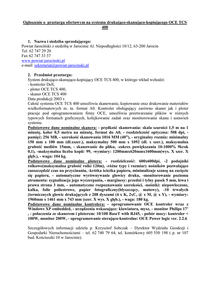 Ogłoszenie o przetargu ofertowym na systemu drukująco-skanująco-kopiującego OCE TCS 400 1. Nazwa i siedziba sprzedającego: Powiat Jarociński z siedzibą w Jarocinie Al. Niepodległości 10/12, 63-200 Jarocin Tel. 62 747 29 20 Fax 62 747 33 37 www.powiat-jarocinski.pl e-mail: [email protected] 2. Przedmiot przetargu: System drukująco-skanująco-kopiujący OCE TCS 400, w którego wkład wchodzi: - kontroler Dell, - ploter OCE TCS 400, - skaner OCE TCS 400 Data produkcji 2003 r. Całość systemu OCE TCS 400 umoŜliwia skanowanie, kopiowanie oraz drukowanie materiałów wielkoformatowych m. in. format A0. Kontroler obsługujący zarówno skaner jak i ploter pracuje pod oprogramowaniem firmy OCE, umoŜliwia przetwarzanie plików w róŜnych typowych formatach graficznych, kolejkowanie zadań oraz monitorowanie skanu i ustawień systemu. Podstawowe dane nominalne skanera: - prędkość skanowania: skala szarości 1,5 m na 1 minutę, kolor 0,5 metra na minutę, format do A0, - rozdzielczość optyczna: 508 dpi, pamięć; 256 MB, - szerokość skanowania 1016 MM (40”), - oryginalny rozmia: minimalny 150 mm x 100 mm (dł.xszer.), maksymalny 500 mm x 1092 (dł. x szer.), maksymalna grubość mediów 15mm, - skanowanie do pliku, -zakres powiększania 10-1000% 9krok 0,1), -maksymalna liczba kopii: 99, -wymiary: 1200mmx620mmx1600mm(wys. X szer. X głęb.), - waga: 104 kg. Podstawowe dane nominalne plotera: - rozdzielczość: 600x600dpi, -2 podajniki rolkowe(maksymalna grubość rolki 120m), -róŜne typy i rozmiary nośników pozwalające zaoszczędzić czas na przycinaniu, -krótka ścieŜka papieru, minimalizuje szansę na zacięcie się papieru, - automatyczne wyrównywanie głowicy druku, -monitorowanie poziomu atramentu: sygnalizacja jego wyczerpania, - marginesy: przedni i tylny pasek 5 mm, lewa i prawa strona 3 mm, - automatyczne rozpoznawanie szerokości, -nośniki: niepowleczone, kalka, folie poliestrowe, papier fotograficzny(błyszczący, matowy), -10 trwałych (termicznych głowic drukujących z 208 dyszami (4 x K, 2xC, @ x M, @ x Y), - wymiary: 1960mm x 1461 mm x 743 mm (szer. X wys. X głęb.), - waga: 180 kg. Podstawowe dane nominalne kontrolera: - oprogramowanie OCE kontroler wraz z Windows XP embedded, - urządzenia wskazujące: klawiatura, mysz, - monitor Philips 17’ , - połaczenia ze skanerem i ploterem: 10/100 BaseT with RJ45, - pobór mocy: kontroler < 100W, monitor 200W, - oprogramowanie sterująco-kontrolne: OCE Power logic ver. 2.2.6 Szczegółowych informacji udziela p. Krzysztof Sobczak – Dyrektor Wydziału Geodezji i Gospodarki Nieruchomościami – tel. 62 740 79 64, tel. komórkowy 605 550 198 ( p. nr 107 bud. Kościuszki 10 w Jarocinie). 3. Tryb przetargu Pisemny przetarg ofertowy. Oferta pod rygorem niewaŜności, powinna być sporządzona w formie pisemnej i musi zawierać następujące dane oferenta: 1) imię i nazwisko lub nazwę firmy, 2) adres siedziby oferenta, 3) numer telefonu, 4) numer PESEL i NIP oraz w przypadku firm numer REGON, 5) datę sporządzenia oferty, 6) oferowaną cenę brutto, która nie moŜe być niŜsza niŜ wycena wartości rynkowej tj. 12 800,00 zł. 7) podpis oferenta, 1. Wartość rynkowa przedmiotu sprzedaŜy Wartość urządzenia, będącego przedmiotem sprzedaŜy ustalono w wysokości 12 800,00 zł. (słownie: dwanaście tysięcy osiemset złotych 00/100). 2. Termin, miejsce i tryb złoŜenia oferty: Ofertę naleŜy złoŜyć w zamkniętej kopercie, adresowanej według wzoru: Starostwo Powiatowe w Jarocinie Al. Niepodległości 10 63-200 Jarocin „Oferta na zakup systemu skanuj-drukuj OCE TCS 400” Ofertę naleŜy przesłać pod wskazany adres lub złoŜyć w Starostwie Powiatowym w Jarocinie Al. Niepodległości 10, 63-200 Jarocin pokój nr 4 parter (Biuro Obsługi Klienta). Ostateczny termin składania ofert ustala się na 31 maja 2011 roku do godziny 11.00 Oferty, które wpłyną do Sprzedającego po wyznaczonej dacie nie będą rozpatrywane. 3. Miejsce i termin przeprowadzenia przetargu: Otwarcie ofert nastąpi przez komisję przetargową w dniu 31 maja 2011 roku o godz. 12.00 ., w pokoju nr 30 sala posiedzeń, w Starostwie Powiatowym w Jarocinie, l. Niepodległości 10. Termin związania ofertą sprzedający określa na 14 dni. 4. Organizatorowi przetargu przysługuje prawo zamknięcia przetargu bez wybrania którejkolwiek z ofert. 5. Inne informacje: 1) Komisja przetargowa wybierze oferenta, który zaoferuje najwyŜsza cenę na system będący przedmiotem przetargu. 2) Data podpisania umowy kupna-sprzedaŜy zostanie wyznaczona niezwłocznie po pozytywnym zakończeniu przetargu. 3) Nabywca jest zobowiązany zapłacić cenę nabycia pojazdu przed podpisaniem umowy kupnasprzedaŜy. 4) Wydanie przedmiotu sprzedaŜy nabywcy nastąpi niezwłocznie po podpisaniu umowy kupnasprzedaŜy. Załączone dokumenty – pliki do pobrania: Treść ogłoszenia na sprzedaŜ systemu OCE TCS 400. Załącznik nr 1 – oferta
