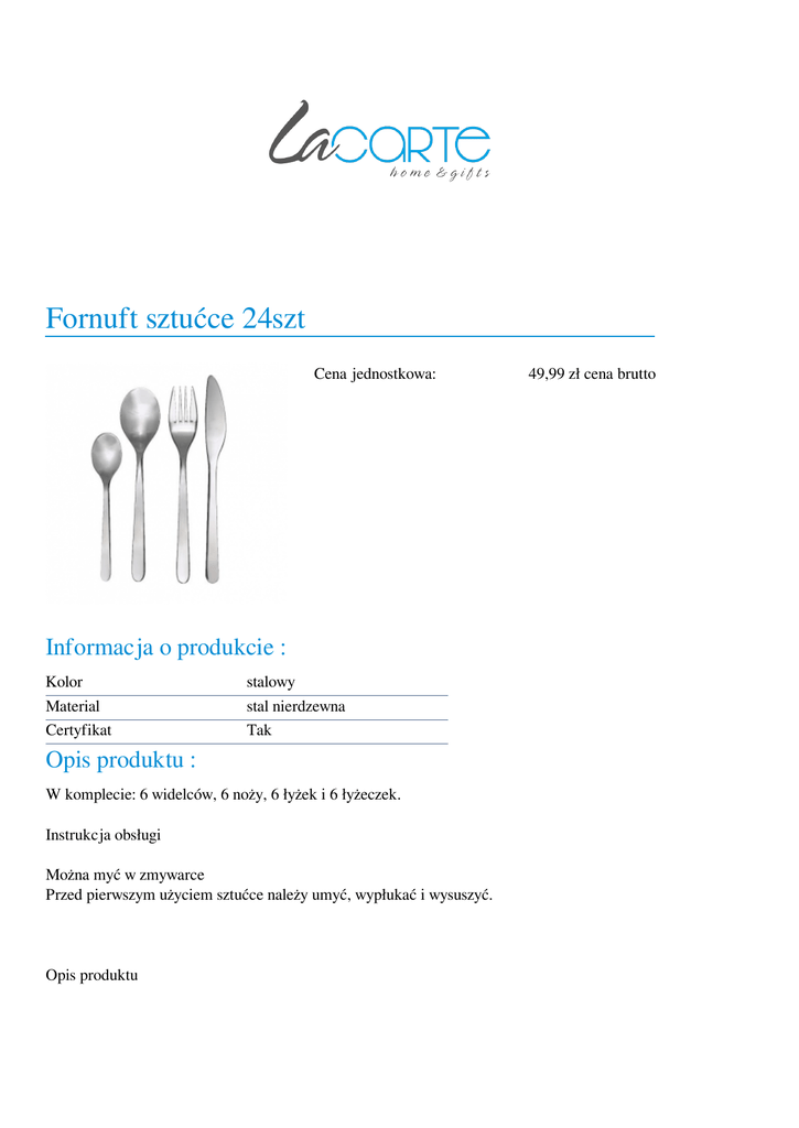 Fornuft sztućce 24szt Cena jednostkowa: Informacja o produkcie : Kolor Material Certyfikat stalowy stal nierdzewna Tak Opis produktu : W komplecie: 6 widelców, 6 noży, 6 łyżek i 6 łyżeczek. Instrukcja obsługi Można myć w zmywarce Przed pierwszym użyciem sztućce należy umyć, wypłukać i wysuszyć. Opis produktu 49,99 zł cena brutto Widelec/ Łyżka/ Łyżeczka: stal nierdzewna Nóż: stal nierdzewna, stal nierdzewna Wymiary Szerokość: 14 cm Wysokość: 4 cm Długość: 22 cm Waga: 0.90 kg Powered by TCPDF (www.tcpdf.org)