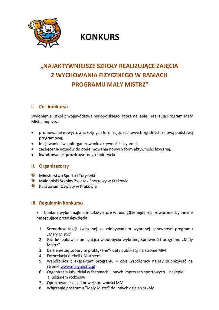 KONKURS „NAJAKTYWNIEJSZE SZKOŁY REALIZUJĄCE ZAJĘCIA Z WYCHOWANIA FIZYCZNEGO W RAMACH PROGRAMU MAŁY MISTRZ” I. Cel konkursu Wyłonienie szkół z województwa małopolskiego które najlepiej realizują Program Mały Mistrz poprzez: promowanie nowych, atrakcyjnych form zajęć ruchowych zgodnych z nową podstawą programową, inicjowanie i współorganizowanie aktywności fizycznej, zachęcenie uczniów do podejmowania nowych form aktywności fizycznej, kształtowanie prozdrowotnego stylu życia. II. Organizatorzy Ministerstwo Sportu i Turystyki Małopolski Szkolny Związek Sportowy w Krakowie Kuratorium Oświaty w Krakowie III. Regulamin konkursu Konkurs wyłoni najlepsze szkoły które w roku 2016 będą realizować miedzy innymi następujące przedsięwzięcia : 1. 2. 3. 4. 5. 6. 7. 8. Scenariusz lekcji związanej ze zdobywaniem wybranej sprawności programu „Mały Mistrz” Gra lub zabawa pomagająca w zdobyciu wybranej sprawności programu „Mały Mistrz” Dzielenie się „dobrymi praktykami”- daty publikacji na stronie MM Fotorelacja z lekcji z Mistrzem Współpraca z ekspertem programu – opis współpracy należy publikować na stronie www.malymistrz.pl Organizacja lub udział w festynach i innych imprezach sportowych – najlepiej z udziałem rodziców Opracowanie zasad nowej sprawności MM Włączanie programu "Mały Mistrz" do innych działań szkoły Dokumentację w/w przedsięwzięć należy przesyłać na adres mailowy do swoich ekspertów w terminie do 25.11.2016r IV. Etapy konkursu Konkurs trwa od 01.04.2016 do 20.11.2016r Do 25.11.2016 zbieranie materiałów i informacji przez ekspertów programu 26.11-05.12.2016 weryfikacja i ocena szkół przez Komisję Konkursową złożoną z przedstawicieli Organizatorów i ekspertów. 30.12.2016 ogłoszenie wyników konkursu V. Uczestnicy W konkursie mogą uczestniczyć szkoły z I i II edycji oraz III edycji realizujące program Mały Mistrz w województwie małopolskim. VI. Nagrody Przewidujemy nagrodzenie 5 najlepszych szkół w Małopolsce zestawami piłek edukacyjnych EDUBAL.