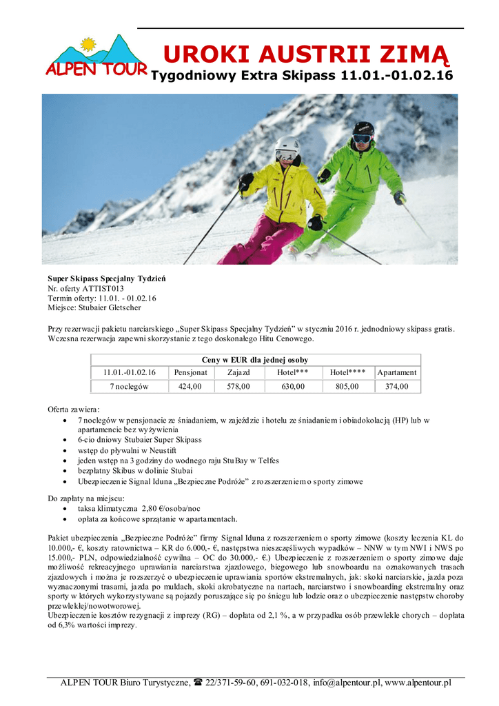 UROKI AUSTRII ZIMĄ Tygodniowy Extra Skipass 11.01.-01.02.16 Super Skipass Specjalny Tydzień Nr. oferty ATTIST013 Termin oferty: 11.01. - 01.02.16 Miejsce: Stubaier Gletscher Przy rezerwacji pakietu narciarskiego „Super Skipass Specjalny Tydzień” w styczniu 2016 r. jednodniowy skipass gratis. Wczesna rezerwacja zapewni skorzystanie z tego doskonałego Hitu Cenowego. Ceny w EUR dla jednej osoby 11.01.-01.02.16 Pensjonat Zajazd Hotel*** Hotel**** Apartament 7 noclegów 424,00 578,00 630,00 805,00 374,00 Oferta zawiera: 7 noclegów w pensjonacie ze śniadaniem, w zajeźd zie i hotelu ze śniadaniem i obiadokolacją (HP) lub w apartamencie bez wy żywienia 6-cio dniowy Stubaier Super Skipass wstęp do pływalni w Neustift jeden wstęp na 3 godziny do wodnego raju Stu Bay w Telfes bezpłatny Skibus w dolinie Stubai Ubezp ieczen ie Signal Iduna „Bezpieczne Podróże” z ro zszerzen iem o sporty zimowe Do zapłaty na miejscu: taksa klimatyczna 2,80 €/osoba/noc opłata za końcowe sprzątanie w apartamentach. Pakiet ubezpieczenia „Bezpieczne Podró że” firmy Signal Iduna z rozszerzeniem o sporty zimowe (koszty leczenia KL do 10.000,- €, koszty ratownictwa – KR do 6.000,- €, następstwa nieszczęśliwych wypadków – NNW w ty m NWI i NWS po 15.000,- PLN, odpowiedzialność cywilna – OC do 30.000,- €.) Ubezp ieczen ie z rozszerzeniem o sporty zimo we daje mo żliwość rekreacyjnego uprawian ia narciarstwa zjazdowego, biegowego lub snowboardu na oznakowanych trasach zjazdowych i mo żna je ro zszerzyć o ubezp ieczen ie uprawiania sportów ekstremalnych, jak: sko ki narciarskie, jazda poza wyznaczonymi trasami, jazda po muldach, skoki akrobatyczne na nartach, narciarstwo i snowboarding ekstremalny oraz sporty w których wyko rzystywane są pojazdy poruszające się po śniegu lub lodzie oraz o ubezpieczenie następstw choroby przewlekłej/nowotworowej. Ubezp ieczen ie kosztów rezygnacji z imp rezy (RG) – dopłata od 2,1 %, a w przypadku osób przewlekle chorych – dopłata od 6,3% wartości imp rezy. ALPEN TOUR Biuro Turystyczne, 22/371-59-60, 691-032-018, [email protected], www.alpentour.pl