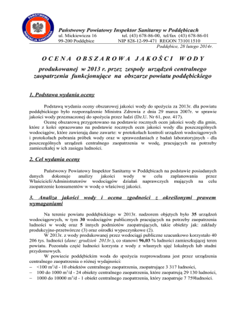 Państwowy Powiatowy Inspektor Sanitarny w Poddębicach ul. Mickiewicza 16 99-200 Poddębice tel. (43) 678-86-00, tel/fax (43) 678-86-01 NIP 828-12-99-471 REGON 731011510 Poddębice, 28 lutego 2014r. OCENA OBSZAROWA JAKOŚCI WODY produkowanej w 2013 r. przez zespoły urządzeń centralnego zaopatrzenia funkcjonujące na obszarze powiatu poddębickiego 1. Podstawa wydania oceny Podstawą wydania oceny obszarowej jakości wody do spożycia za 2013r. dla powiatu poddębickiego było rozporządzenie Ministra Zdrowia z dnia 29 marca 2007r. w sprawie jakości wody przeznaczonej do spożycia przez ludzi (Dz.U. Nr 61, poz. 417). Ocenę obszarową przygotowano na podstawie rocznych ocen jakości wody dla gmin, które z kolei opracowano na podstawie rocznych ocen jakości wody dla poszczególnych wodociągów, które zawierają dane zawarte: w protokołach kontroli urządzeń wodociągowych i protokołach pobrania próbek wody oraz w sprawozdaniach z badań laboratoryjnych - dla poszczególnych urządzeń centralnego zaopatrzenia w wodę, pracujących na potrzeby zamieszkałej w ich zasięgu ludności. 2. Cel wydania oceny Państwowy Powiatowy Inspektor Sanitarny w Poddębicach na podstawie posiadanych danych dokonuje analizy jakości wody w celu zaplanowania przez Właścicieli/Administratorów wodociągów działań naprawczych mających na celu zaopatrzenie konsumentów w wodę o właściwej jakości. 3. Analiza jakości wody i ocena zgodności z określonymi prawem wymaganiami Na terenie powiatu poddębickiego w 2013r. nadzorem objętych było 35 urządzeń wodociągowych, w tym 30 wodociągów publicznych pracujących na potrzeby zaopatrzenia ludności w wodę oraz 5 innych podmiotów zaopatrujących, takie obiekty jak: zakłady produkcyjno-przetwórcze (3) oraz ośrodki wypoczynkowe (2). W 2013r. z wody produkowanej przez wodociągi publiczne szacunkowo korzystało 40 206 tys. ludności (dane: grudzień 2013r.), co stanowi 96,03 % ludności zamieszkującej teren powiatu. Pozostała część ludności korzysta z wody z własnych ujęć lokalnych lub studni przydomowych. W powiecie poddębickim woda do spożycia rozprowadzana jest przez urządzenia centralnego zaopatrzenia o różnej wydajności: <100 m3/d - 10 obiektów centralnego zaopatrzenia, zaopatrujące 3 317 ludności, 100 do 1000 m3/d - 24 obiekty centralnego zaopatrzenia, które zaopatrują 29 130 ludności, 1000 do 10000 m3/d - 1 obiekt centralnego zaopatrzenia, który zaopatruje 7 759ludności. W 2013r. przeprowadzono 34 kontrole stanu sanitarnego urządzeń wodociągowych oraz pobrano i oceniono laboratoryjnie – 161 próbek wody, w tym 124 próbki wody w zakresie monitoringu kontrolnego i 37 próbek wody w zakresie monitoringu przeglądowego. Badania laboratoryjne realizowane były zgodnie z rozporządzeniem Ministra Zdrowia z dnia 22 marca 2010r. w sprawie wykazu stacji sanitarno-epidemiologicznych wykonujących badania laboratoryjne i pomiary ze wskazaniem obszaru, które cytowane jest w Zarządzeniu Nr 8/2013 Państwowego Wojewódzkiego Inspektora Sanitarnego w Łodzi z dnia 30 września 2013r. przez: Oddział Laboratoryjny Powiatowej Stacji Sanitarno-Epidemiologicznej w Zduńskiej Woli, ul. Łaska 13, Dział Laboratoryjny Wojewódzkiej Stacji Sanitarno-Epidemiologicznej w Łodzi, ul. Wodna 40. Na podstawie badań laboratoryjnych stwierdzono, że w 2013r.: 27 urządzeń centralnego zaopatrzenia w wodę oraz 3 wodociągi lokalne produkowały - w minionym roku wodę, której skład odpowiadał wymaganiom sanitarnym, 3 urządzenia centralnego zaopatrzenia w wodę oraz 2 wodociągi lokalne produkowały wodę, której skład okresowo bądź stale nie odpowiadał wymaganiom sanitarnym. 4. Stan techniczny obiektów i urządzeń. Ocena przydatności wody do spożycia. Niezbędne procesy naprawcze. Ryzyko zdrowotne. Biorąc pod uwagę wyniki kontroli obiektów centralnego zaopatrzenia w wodę oraz wyniki badań próbek wody należy stwierdzić, iż: ok. 93,59% ogółu mieszkańców powiatu, do których docierała sieć wodociągowa, miała dostęp do wody, która – w analizowanym zakresie – oceniona była jako przydatna do spożycia, ok. 6,41% ogółu mieszkańców powiatu, do których docierała sieć wodociągowa, miała dostęp do wody, która – w analizowanym zakresie – oceniona była jako warunkowo przydatna do spożycia, stan sanitarno-techniczny obiektów produkujących wodę na potrzeby ludności powiatu poddębickiego nie budził poważniejszych zastrzeżeń. Główną przyczyną warunkowej oceny przydatności wody do spożycia była ponadnormatywna zawartość związków żelaza i manganu oraz przekroczenie dopuszczalnych wartości mętności i barwy, co mogło wynikać z nieskutecznego procesu uzdatniania wody lub jego braku. Konsumenci wody, do których docierała woda zawierająca ponadnormatywne ilości związków żelaza i manganu, mogli odczuwać okresowo uciążliwości natury higienicznej, wynikające z pogorszonych cech organoleptycznych. Ponadto byli oni narażeni na ryzyko zdrowotne, czyli mogły wystąpić u nich negatywne skutki zdrowotne spowodowane bezpośrednio lub pośrednio – spożywaniem wody zawierającej określony ksenobiotyk. Ludność zamieszkująca teren zaopatrywany przez następujące wodociągi: 1. Wodociąg sieciowy w Porczynach, gm. Poddębice – Borzewisko, Dzierżązna, Gibaszew, Izabela, Leśnik, Ewelinów, Krępa, Ksawercin, Nowa Wieś, Truskawiec, Wylazłów, Antonina, Busina, Borki Lipkowskie, Lipki, Malenie, Porczyny, 2. Wodociąg sieciowy w Wartkowicach, gm. Wartkowice – Wartkowice, Spędoszyn, Zawada, Ner, Ner-Parcel, Ner-Kolonia, Dzierżawy, 3. Wodociąg sieciowy w Budzynku, gm. Dalików - Budzynek, Woźniki, Idzikowice, 4. Wodociąg lokalny w Ośrodku wczasowym „Pod akacjami” w Księżych Młynach, 5. Wodociąg lokalny w Ośrodku wczasowym „Vantur” w Księżych Młynach w 2013r. używała wody warunkowo przydatnej do spożycia, z uwagi na brak innych źródeł zao