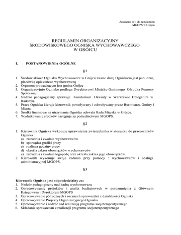 Załącznik nr 1 do regulaminu MGOPS w Grójcu REGULAMIN ORGANIZACYJNY ŚRODOWISKOWEGO OGNISKA WYCHOWAWCZEGO W GRÓJCU I. POSTANOWIENIA OGÓLNE §1 1. Środowiskowe Ognisko Wychowawcze w Grójcu zwane dalej Ogniskiem jest publiczną placówką opiekuńczo wychowawczą 2. Organem prowadzącym jest gmina Grójec 3. Organizacyjnie Ognisko podlega Dyrektorowi Miejsko Gminnego Ośrodka Pomocy Społecznej. 4. Nadzór pedagogiczny sprawuje Kuratorium Oświaty w Warszawie Delegatura w Radomiu. 5. Pracą Ogniska kieruje kierownik powoływany i odwoływany przez Burmistrza Gminy i Miasta. 6. Środki finansowe na utrzymanie Ogniska uchwala Rada Miejska w Grójcu. 7. Wydatkowanie środków następuje za pośrednictwem MGOPS. §2 1. Kierownik Ogniska wykonuje uprawnienia zwierzchnika w stosunku do pracowników Ogniska : a) zatrudnia i zwalnia wychowawców b) sporządza grafiki pracy c) rozlicza godziny pracy d) określa zakres obowiązków wychowawców e) zatrudnia i zwalnia logopedę oraz określa zakres jego obowiązków. 2. Kierownik wykonuje swoje zadania przy pomocy : wychowawców i obsługi administracyjnej MGOPS. §3 Kierownik Ogniska jest odpowiedzialny za: 1. Nadzór pedagogiczny nad kadrą wychowawczą 2. Opracowywanie projektów i analiz budżetowych w porozumienia z Głównym Księgowym i Dyrektorem MGOPS 3. Opracowywanie półrocznych i rocznych sprawozdań z działalności Ogniska 4. Opracowywanie Projekty Organizacyjnego Ogniska 5. Opracowywanie i nadzór nad realizacją programu socjoterapeutycznego 6. Składanie sprawozdań z realizacji programu socjoterapeutycznego 7. Dysponowanie środkami finansowymi Ogniska w uzgodnieniu z głównym księgowym i Dyrektorem MGOPS 8. Współpracę z rodzinami, opiekunami, nauczycielami wychowanków oraz pracownikami Socjalnymi MGOPS 9. Prowadzenie zajęć grupowych i indywidualnych z dziećmi 10. Realizację indywidualnych programów rozwoju dziecka 11. Przestrzeganie przez wychowawców realizacji zadań zgodnych z godzinowym rozkładem dnia w szczególności: czasu odrabiania lekcji 12. Stan techniczny, sanitarny i wyposażenie Ogniska §4 Pracownicy Ogniska : I. Zadania wychowawców 1. Sporządzanie diagnozy indywidualnej dziecka i jego rodziny 2. Prowadzenie zajęć socjoterapeutycznych zgodnie z programem przygotowanym dla danej grupy i diagnozą indywidualna dzieci i składanie sprawozdań z jego realizacji. 3. Praca ze stałymi grupami dzieci - maksymalnie 12 dzieci w grupie. 4. Praca z dziećmi w kontakcie indywidualnym. 5. Przygotowywanie i realizacja indywidualnych programów rozwojowo terapeutycznych dla dzieci. 6. Prowadzenie dokumentacji pracy z dzieckiem , zgodnej z charakterem placówki ( dokumentacja diagnozy, planów i realizacji indywidualnych i grupowych zajęć z dziećmi wraz z osiągnięciami). 7. Utrzymywanie kontaktów z rodziną dziecka w celu : - diagnozy sytuacji rodzinnej, rozwiązywania problemów rodziny ( np. : motywowanie osoby uzależnionej lub współuzależnionej do podjęcia terapii), 8. Współpraca z instytucjami ( Miejsko Gminnym Ośrodkiem Pomocy Społecznej, szkołą, Sądem , Powiatowym Centrum Pomocy Rodzinie ), które mogą pomóc rodzinie w rozwiązywaniu jej problemów. 9. Przygotowywanie i realizacja imprez okolicznościowych zgodnie z Kalendarzem imprez - odpowiedzialny wychowawca wyznaczony każdorazowo. 10. Organizowanie indywidualnych i zespołowych zajęć dla dzieci: odrabianie lekcji - sportowo - rekreacyjnych świetlicowych - kulturalno - rozrywkowych krajoznawczych związanych z pracami na rzecz Ogniska 11. Zadania logopedy: 1. Dokonywanie diagnozy wad wymowy wszystkich wychowanków 2. Prowadzenie indywidualnych zajęć logopedycznych z wychowankami z wadami. §5 Czas pracy Ogniska. 1. Ognisko jest czynne 6 dni w tygodniu przez 6 godzin dziennie 2. W czasie roku szkolnego od poniedziałku do piątku w godzinach od 13 do 19, w soboty od 8 do 14. 3. W ferie , wakacje i dni wolne od zajęć lekcyjnych w godzinach od 8 do 14 4. Dzienny rozkład zajęć : a) dni szkolne 13 - 14 - zajęcia socjoterapeutyczne grupowe 14 - 16 - odrabianie lekcji 16 - 17 - podwieczorek 17-19- zajęcia świetlicowe, indywidualne , sportowe, porządkowe b) dni wolne od nauki 8 - 14 - zajęcia świetlicowe, indywidualne i sportowe 5. Każdorazowe zmiany godzin pracy Ogniska ustala kierownik z Burmistrzem Gminy i Miasta oraz Dyrektorem MGOPS III. POSTANOWIENIA KOŃCOWE §6 Schemat organizacyjny Środowiskowego Ogniska Wychowawczego określa załącznik nr 1 niniejszego regulaminu. i