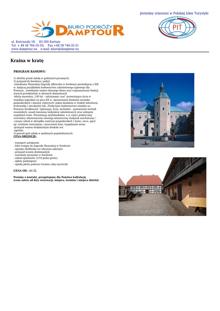 Jesteśmy zrzeszeni w Polskiej Izbie Turystyki ul. Kościuszki 18, 83-300 Kartuzy Tel. + 48 58 764-35-50; Fax +48 58 746-35-51 www.damptour.eu e-mail: [email protected] Kraina w kratę PROGRAM RAMOWY: 1) zbiórka przed szkołą w godzinach porannych, 2) przyjazd do Swołowa i pobyt: -zwiedzanie Muzealnej Zagrody Albrechta w Swołowie pochodzącej z XIX w. będącej przykładem budownictwa szkieletowego typowego dla Pomorza , zwiedzanie wnętrz dawnego domu oraz rozpoznawanie funkcji starych przedmiotów w dawnych domostwach -lekcja muzealna „100 lat – zatrzymany czas” prezentująca życie w wiejskiej zagrodzie na pocz.XX w. (poznawanie działania narzędzi gospodarskich i maszyn rolniczych- pokaz działania w stodole młockarni, śrutownika i sieczkarni) lub „Tradycyjne budownictwo wiejskie na Pomorzu Środkowym” (gimnazja, licea, technika) – poznawanie technik ciesielskich, zasad stawiania budynków szkieletowych oraz rodzajów wypełnień ścian. Prezentacja multimedialna, a w części praktycznej uczestnicy własnoręcznie stawiają miniaturowy budynek szachulcowy ! -czynny udział w obrządku zwierząt gospodarskich ( konie, owce, gęsi) np. ścielenie zwierzętom, czyszczenie koni, wypędzanie owiec -przejazd wozem drabiniastym dookoła wsi -ognisko 3) powrót pod szkołę w godzinach popołudniowych CENA OBEJMUJE: - transport autokarem - bilet wstępu do Zagrody Muzealnej w Swołowie - ognisko (kiełbaska we własnym zakresie) - przejazd wozem drabiniastym - warsztaty muzealne w Swołowie - udział opiekunów (1/10 pełne gratis) - opłaty parkingowe - opiekę pilota podczas trwania całej wycieczki CENA OD : 60 ZŁ Prosimy o kontakt, przygotujemy dla Państwa kalkulację (cena zależy od daty rezerwacji, miejsca, terminu i miejsca zbiórki)