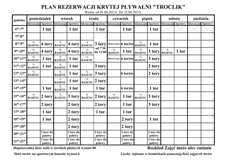 PLAN REZERWACJI KRYTEJ PŁYWALNI "TROCLIK" Ważny od 01.06.2011r. Do 22.06.2011r. godziny poniedziałek wtorek środa czwartek piątek sobota niedziela Rekreacyjny Sportowy Rekreacyjny Sportowy Rekreacyjny Sportowy Rekreacyjny Sportowy Rekreacyjny Sportowy Rekreacyjny Sportowy Rekreacyjny Sportowy 1 tor 600-700 1 tor 1 tor 1 tor 1 tor 700-800 800-900 ½ BASENU 4 tory ½ BASENU 4 tory 900-1000 ½ BASENU 4 tory ½ BASENU 4 tory 1000-1100 ½ BASENU 1 tor ½ BASENU 1 tor 1100-1200 ½ BASENU 1 tor ½ BASENU 1 tor 1200-1300 ½ BASENU ½ BASENU 1 tor ½ BASENU 3 tory ½ BASENU 1 tor ½ BASENU 2 tory 1 tor ½ BASENU 1 tor 2 tory ½ BASENU 3 tory 1300-1400 1400-1500 1500-1600 ½ BASENU ½ BASENU 3 tory Rezerwacja od 7'30 ½ ½ do 11'00 BASENU BASENU ½ BASENU Rezerwacja 6 torów ½ BASENU 1 tor 1 tor ½ BASENU 3 tory 6 torów ½ BASENU 3 tory 3 tory 2 tory ½ BASENU 6 torów 2 tory 6 torów 1 tor 1 tor 1600-1700 2 tory 2 tory 2 tory 1 tor 1700-1800 1 tor 2 tory 1 tor 1 tor 1800-1900 1 tor 2 tory 2 tory 2 tory 2 tory 1900-2000 2000-2100 2100-2200 2 tory do połowy 2 tory do połowy 2 tory do połowy 2 tory do połowy 2 tory do połowy 2 tory do połowy Dopuszczalna ilość osób w strefach płatnych wynosi 80 Ilość torów na sportowym basenie wynosi 6 1 tor 2 tory 1 tor ½ BASENU ½ BASENU 2 tory do połowy 2 tory do połowy ½ BASENU 3 tory 3 tory 1 tor 2 tory do połowy 2 tory do połowy Rozkład Zajęć może ulec zmianie Liczby wpisane w komórkach oznaczają ilość zajętych torów