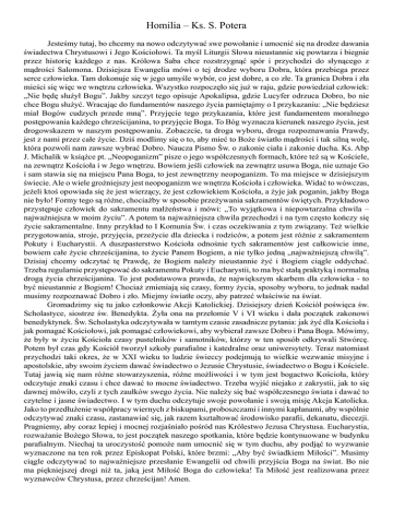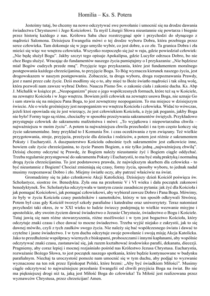 Homilia – Ks. S. Potera Jesteśmy tutaj, bo chcemy na nowo odczytywać swe powołanie i umocnić się na drodze dawania świadectwa Chrystusowi i Jego Kościołowi. Ta myśl Liturgii Słowa nieustannie się powtarza i biegnie przez historię każdego z nas. Królowa Saba chce rozstrzygnąć spór i przychodzi do słynącego z mądrości Salomona. Dzisiejsza Ewangelia mówi o tej drodze wyboru Dobra, która przebiega przez serce człowieka. Tam dokonuje się w jego umyśle wybór, co jest dobre, a co złe. Ta granica Dobra i zła mieści się więc we wnętrzu człowieka. Wszystko rozpoczęło się już w raju, gdzie powiedział człowiek: „Nie będę służył Bogu”. Jakby szczyt tego opisuje Apokalipsa, gdzie Lucyfer odrzuca Dobro, bo nie chce Bogu służyć. Wracając do fundamentów naszego życia pamiętajmy o I przykazaniu: „Nie będziesz miał Bogów cudzych przede mną”. Przyjęcie tego przykazania, które jest fundamentem moralnego postępowania każdego chrześcijanina, to przyjęcie Boga. To Bóg wyznacza kierunek naszego życia, jest drogowskazem w naszym postępowaniu. Zobaczcie, ta droga wyboru, droga rozpoznawania Prawdy, jest z nami przez całe życie. Dziś modlimy się o to, aby mieć to Boże światło mądrości i tak silną wolę, która pozwoli nam zawsze wybrać Dobro. Naucza Pismo Św. o zakonie ciała i zakonie ducha. Ks. Abp J. Michalik w książce pt. „Neopoganizm” pisze o jego współczesnych formach, które też są w Kościele, na zewnątrz Kościoła i w Jego wnętrzu. Bowiem jeśli człowiek na zewnątrz usuwa Boga, nie uznaje Go i sam stawia się na miejscu Pana Boga, to jest zewnętrzny neopoganizm. To ma miejsce w dzisiejszym świecie. Ale o wiele groźniejszy jest neopoganizm we wnętrzu Kościoła i człowieka. Widać to wówczas, jeżeli ktoś opowiada się że jest wierzący, że jest człowiekiem Kościoła, a żyje jak poganin, jakby Boga nie było! Formy tego są różne, chociażby w sposobie przeżywania sakramentów świętych. Przykładowo przystępuje człowiek do sakramentu małżeństwa i mówi: „To wyjątkowa i niepowtarzalna chwila – najważniejsza w moim życiu”. A potem ta najważniejsza chwila przechodzi i na tym często kończy się życie sakramentalne. Inny przykład to I Komunia Św. i czas oczekiwania z tym związany. Też wielkie przygotowania, stroje, przyjęcia, przeżycie dla dziecka i rodziców, a potem jest różnie z sakramentem Pokuty i Eucharystii. A duszpasterstwo Kościoła odnośnie tych sakramentów jest całkowicie inne, bowiem całe życie chrześcijanina, to życie Panem Bogiem, a nie tylko jedną „najważniejszą chwilą”. Dzisiaj chcemy odczytać tę Prawdę, że Bogiem należy nieustannie żyć i Bogiem ciągle oddychać. Trzeba regularnie przystępować do sakramentu Pokuty i Eucharystii, to ma być stałą praktyką i normalną drogą życia chrześcijanina. To jest podstawowa prawda, że największym skarbem dla człowieka - to być nieustannie z Bogiem! Chociaż zmieniają się czasy, formy życia, sposoby wyboru, to jednak nadal musimy rozpoznawać Dobro i zło. Miejmy światłe oczy, aby patrzeć właściwie na świat. Gromadzimy się tu jako członkowie Akcji Katolickiej. Dzisiejszy dzień Kościół poświęca św. Scholastyce, siostrze św. Benedykta. Żyła ona na przełomie V i VI wieku i dała początek zakonowi benedyktynek. Św. Scholastyka odczytywała w tamtym czasie zasadnicze pytania: jak żyć dla Kościoła i jak pomagać Kościołowi, jak pomagać człowiekowi, aby wybierał zawsze Dobro i Pana Boga. Mówimy, że były w życiu Kościoła czasy pustelników i samotników, którzy w ten sposób odkrywali Stwórcę. Potem był czas gdy Kościół tworzył szkoły parafialne i katedralne oraz uniwersytety. Teraz natomiast przychodzi taki okres, że w XXI wieku to ludzie świeccy podejmują to wielkie wezwanie misyjne i apostolskie, aby swoim życiem dawać świadectwo o Jezusie Chrystusie, świadectwo o Bogu i Kościele. Tutaj jawią się nam różne stowarzyszenia, różne możliwości i w tym jest bogactwo Kościoła, który odczytuje znaki czasu i chce dawać to mocne świadectwo. Trzeba wyjść niejako z zakrystii, jak to się dawnej mówiło, czyli z tych zaułków swego życia. Nie należy się bać współczesnego świata i dawać to czytelne i jasne świadectwo. I w tym duchu odczytuje swoje powołanie i swoją misję Akcja Katolicka. Jako to przedłużenie współpracy wiernych z biskupami, proboszczami i innymi kapłanami, aby wspólnie odczytywać znaki czasu, zastanawiać się, jak razem kształtować środowisko parafii, dekanatu, diecezji. Pragniemy, aby coraz lepiej i mocnej rozjaśniało pośród nas Królestwo Jezusa Chrystusa. Eucharystia, rozważanie Bożego Słowa, to jest początek naszego spotkania, które będzie kontynuowane w budynku parafialnym. Niechaj ta uroczystość pomoże nam umocnić się w tym duchu, aby podjąć to wyzwanie wyznaczone na ten rok przez Episkopat Polski, które brzmi: „Aby być świadkiem Miłości”. Musimy ciągle odczytywać to najważniejsze przesłanie Ewangelii od chwili przyjścia Boga na świat. Bo nie ma piękniejszej drogi niż ta, jaką jest Miłość Boga do człowieka! Ta Miłość jest realizowana przez wyznawców Chrystusa, przez chrześcijan! Amen.