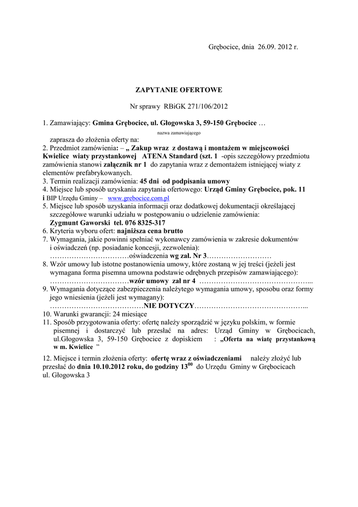 Grębocice, dnia 26.09. 2012 r. ZAPYTANIE OFERTOWE Nr sprawy RBiGK 271/106/2012 1. Zamawiający: Gmina Grębocice, ul. Głogowska 3, 59-150 Grębocice … nazwa zamawiającego zaprasza do złożenia oferty na: 2. Przedmiot zamówienia: – „ Zakup wraz z dostawą i montażem w miejscowości Kwielice wiaty przystankowej ATENA Standard (szt. 1 -opis szczegółowy przedmiotu zamówienia stanowi załącznik nr 1 do zapytania wraz z demontażem istniejącej wiaty z elementów prefabrykowanych. 3. Termin realizacji zamówienia: 45 dni od podpisania umowy 4. Miejsce lub sposób uzyskania zapytania ofertowego: Urząd Gminy Grębocice, pok. 11 i BIP Urzędu Gminy – www.grebocice.com.pl 5. Miejsce lub sposób uzyskania informacji oraz dodatkowej dokumentacji określającej szczegółowe warunki udziału w postępowaniu o udzielenie zamówienia: Zygmunt Gaworski tel. 076 8325-317 6. Kryteria wyboru ofert: najniższa cena brutto 7. Wymagania, jakie powinni spełniać wykonawcy zamówienia w zakresie dokumentów i oświadczeń (np. posiadanie koncesji, zezwolenia): ……………………………oświadczenia wg zał. Nr 3……………………… 8. Wzór umowy lub istotne postanowienia umowy, które zostaną w jej treści (jeżeli jest wymagana forma pisemna umowna podstawie odrębnych przepisów zamawiającego): ……………………………wzór umowy zał nr 4 ………………………………………... 9. Wymagania dotyczące zabezpieczenia należytego wymagania umowy, sposobu oraz formy jego wniesienia (jeżeli jest wymagany): …………………………………NIE DOTYCZY………………………………………... 10. Warunki gwarancji: 24 miesiące 11. Sposób przygotowania oferty: ofertę należy sporządzić w języku polskim, w formie pisemnej i dostarczyć lub przesłać na adres: Urząd Gminy w Grębocicach, ul.Głogowska 3, 59-150 Grębocice z dopiskiem : „Oferta na wiatę przystankową w m. Kwielice ” 12. Miejsce i termin złożenia oferty: ofertę wraz z oświadczeniami należy złożyć lub przesłać do dnia 10.10.2012 roku, do godziny 1300 do Urzędu Gminy w Grębocicach ul. Głogowska 3 Załącznik nr 1 do zapytania ofertowego nr RBiGK 271/106/2012 Opis przedmiotu zamówienia 1.Przedmiotem zamówienia jest zakup wraz z dostawą i montażem (przy istniejącej nowej zatoce autobusowej) w miejscowości Kwielice wiaty przystankowej ATENA Standard (szt. 1) oraz ułożenie kostki betonowej gr 8cm pol- bruk ( na powierzchni 450 cmx 140 cm wraz z podbudową) Przed montażem należy wykonać stopy fundamentowe ( szt. 5) 30 x30 cm na głębokość min. 60 cm. - rozmieszczenie wg zaleceń producenta Opis wiat (szt.1) : model ATENA Standard ( 310 cm x 130cm x 240cm) Ściany : Cała konstrukcja wykonana z blachy ocynkowanej lakierowanej, z wbudowaną ( w bocznej ścianie) szybą hartowaną o gr. 8 mm ; Dach : płaski wykonany z blachy ocynkowanej, Wyposażenie : ławka , tabliczka na rozkład jazdy Należy dodatkowo wyposażyć w kosz na śmieci i zamontować przy wiacie 2.Dokonać demontażu istniejącej wiaty przystankowej z elementów prefabrykowanych /tj.5 słupków prefabrykowanych , dwoje ścian bocznych z płyt prefabrykowanych gr 5cm , dach pokryty blachą ocynkowaną trapezową 5,0x 3,50, rozbiórka posadzki betonowej gr 10cm o wym. 5,0x 3,50 wraz z wywozem gruzu ,w miejsce posadzki uzupełnienie humusem. 3.Dokonać wizji lokalnej w terenie. Sporządził Zygmunt Gaworski Załącznik nr 2 FORMULARZ OFERTOWY Strona z ogólnej liczby stron (pieczęć Wykonawcy) FORMULARZ OFERTOWY REALIZACJI ZADANIA PN: „Zakup wraz z dostawą i montażem w miejscowości Kwielice wiaty przystankowej ATENA Standard (szt. 1 )” wraz z demontażem istniejącej wiaty z elementów prefabrykowanych. dla GMINY GRĘBOCICE 59-150 Grębocice, ul. Głogowska 3 Oferent: 1. Zarejestrowana nazwa Przedsiębiorstwa: .................................................................................................................................................................... 2. Zarejestrowany adres Przedsiębiorstwa: .................................................................................................................................................................... 3. Numer telefonu:...................................................................................................................................... 4. Numer faksu:........................................................................................................................................... 5. Numer konta bankowego: ..................................................................................................................... 6. Cena brutto za realizację przedmiotu zamówienia wynosi :....................................zł (słownie brutto:......................................................................................................................................) W tym netto…………zł ,podatek VAT ….% kwota …………….zł 7. Termin wykonania- 45 dni od podpisania umowy Upełnomocniony przedstawiciel .......................................... (podpis, pieczęć) Data: ....................................... Załącznik nr 3 OŚWIADCZENIE WYKONAWCY Wyrażamy chęć uczestnictwa w postępowaniu prowadzonym w trybie zapytania ofertowego organizowanym przez Gminę Grębocice, ul. Głogowska 3, 59-150 Grębocice na zadanie p.n. : Zakup wraz z dostawą i montażem w miejscowości Kwielice wiaty przystankowej ATENA Standard (szt. 1) wraz z demontażem istniejącej wiaty przystankowej z elementów prefabrykowanych. w terminach i na warunkach określonych w zapytaniu ofertowym. 1. Oświadczam, że podmiot, który reprezentuję spełnia warunki udziału w zakresie posiadania uprawnień do wykonania prac lub czynności, posiadania niezbędnej wiedzy i doświadczenie, dysponowania odpowiednim potencjałem technicznym oraz osobami zdolnymi do wykonania zamówienia, sytuacji ekono