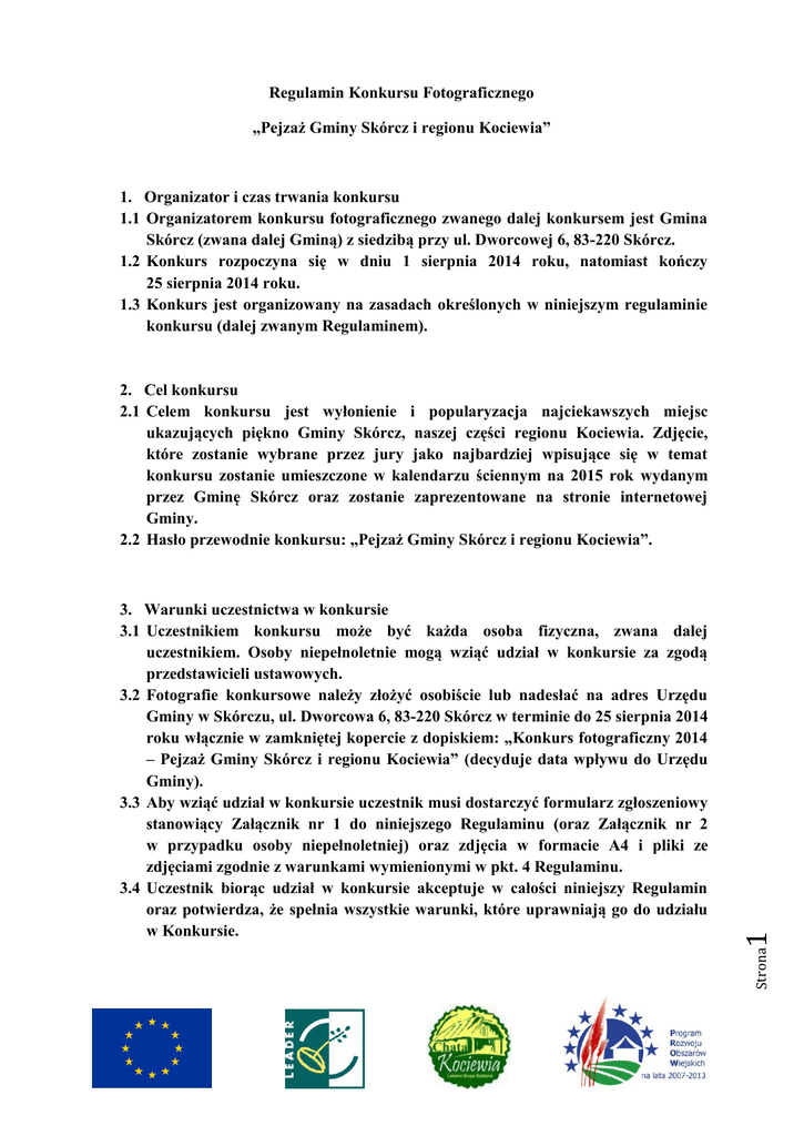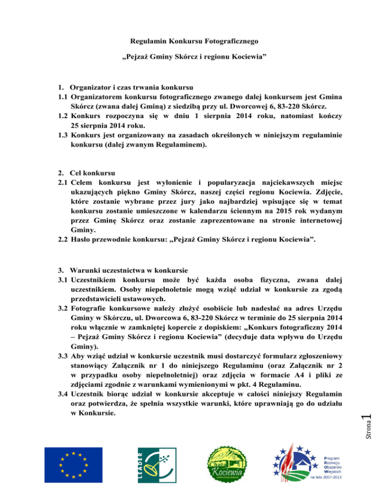 Regulamin Konkursu Fotograficznego „Pejzaż Gminy Skórcz i regionu Kociewia” 1. Organizator i czas trwania konkursu 1.1 Organizatorem konkursu fotograficznego zwanego dalej konkursem jest Gmina Skórcz (zwana dalej Gminą) z siedzibą przy ul. Dworcowej 6, 83-220 Skórcz. 1.2 Konkurs rozpoczyna się w dniu 1 sierpnia 2014 roku, natomiast kończy 25 sierpnia 2014 roku. 1.3 Konkurs jest organizowany na zasadach określonych w niniejszym regulaminie konkursu (dalej zwanym Regulaminem). Strona 3. Warunki uczestnictwa w konkursie 3.1 Uczestnikiem konkursu może być każda osoba fizyczna, zwana dalej uczestnikiem. Osoby niepełnoletnie mogą wziąć udział w konkursie za zgodą przedstawicieli ustawowych. 3.2 Fotografie konkursowe należy złożyć osobiście lub nadesłać na adres Urzędu Gminy w Skórczu, ul. Dworcowa 6, 83-220 Skórcz w terminie do 25 sierpnia 2014 roku włącznie w zamkniętej kopercie z dopiskiem: „Konkurs fotograficzny 2014 – Pejzaż Gminy Skórcz i regionu Kociewia” (decyduje data wpływu do Urzędu Gminy). 3.3 Aby wziąć udział w konkursie uczestnik musi dostarczyć formularz zgłoszeniowy stanowiący Załącznik nr 1 do niniejszego Regulaminu (oraz Załącznik nr 2 w przypadku osoby niepełnoletniej) oraz zdjęcia w formacie A4 i pliki ze zdjęciami zgodnie z warunkami wymienionymi w pkt. 4 Regulaminu. 3.4 Uczestnik biorąc udział w konkursie akceptuje w całości niniejszy Regulamin oraz potwierdza, że spełnia wszystkie warunki, które uprawniają go do udziału w Konkursie. 1 2. Cel konkursu 2.1 Celem konkursu jest wyłonienie i popularyzacja najciekawszych miejsc ukazujących piękno Gminy Skórcz, naszej części regionu Kociewia. Zdjęcie, które zostanie wybrane przez jury jako najbardziej wpisujące się w temat konkursu zostanie umieszczone w kalendarzu ściennym na 2015 rok wydanym przez Gminę Skórcz oraz zostanie zaprezentowane na stronie internetowej Gminy. 2.2 Hasło przewodnie konkursu: „Pejzaż Gminy Skórcz i regionu Kociewia”. 3.5 Uczestnik zgłaszając udział w konkursie oświadcza, że: a) posiada pełnię praw autorskich do fotografii i przenosi je na Organizatora w zakresie niezbędnym do jego publikacji i/lub innego rozpowszechniania, b) przenosi nieodpłatnie autorskie prawa majątkowe na rzecz Organizatora bez ograniczeń czasowych i terytorialnych, na polach eksploatacji wskazanych w art. 50 Ustawy o prawie autorskim i prawach pokrewnych z dnia 4 lutego 1994 roku (tj. Dz. U. z 2006 roku Nr 90 poz. 631 z późn. zm.), w tym w szczególności w zakresie wykorzystywania techniką drukarską i cyfrową, wystawiania, udostępniania na stronach internetowych Organizatora oraz we wszelkich materiałach promocyjnych i reklamowych, bez względu na sposób ich zwielokrotniania i wprowadzania do obrotu; c) zdjęcia nie były uprzednio nigdzie publikowane, przy czym zastrzeżenie to nie obejmuje prywatnych galerii zgłaszającego, w tym galerii internetowych. d) wyraża zgodę na przetwarzanie i udostępnianie swoich danych osobowych: imię, nazwisko, adres zamieszkania, numer telefonu - Ustawa o ochronie danych osobowych z dn. 29 sierpnia 1997 roku, tj. z 2002 roku Nr 101 poz. 926, z późniejszymi zmianami. 3.6 Organizatorzy zastrzegają sobie prawo do nieodpłatnego wykorzystania wszystkich nadesłanych fotografii w publikacjach związanych z konkursem oraz w innych celach promocyjno-reklamowych. 3.7 Organizatorzy nie ponoszą odpowiedzialności za ewentualne kwestie sporne powstałe z przyczyn leżących po stronie osób trzecich. 3.8 Organizatorzy zastrzegą sobie prawo zmiany postanowień Regulaminu w przypadku zmian przepisów prawnych lub innych istotnych zdarzeń mających wpływ na organizowanie konkursu. Strona 2 4. Przedmiot konkursu 4.1 Przedmiotem konkursu są fotografie wykonane samodzielnie przez uczestników konkursu. 4.2 Fotografie powinny przedstawiać krajobraz, widok natury lub otoczenia przedstawiające miejsca warte uwagi znajdujące się na terenie Gminy Skórcz ukazujące piękno przyrody oraz wyjątkowy charakter naszej Gminy, Kociewia. 4.3 Każdy uczestnik do konkursu może zgłosić maksymalnie 3 fotografie, które nie brały wcześniej udziału w innych konkursach fotograficznych. 4.4 Zdjęcia zgłaszane przez uczestników muszą zostać dostarczone w formie wydruku A4 oraz na nośniku CD lub DVD w formacie wymienionym w pkt. 4.5. 4.5 Zdjęcia zgłaszane przez uczestników muszą być zgłoszone w formacie jpg, png lub tiff. Minimalna rozdzielczość to 1684x1488 pikseli, minimalna rozdzielczość rastra powinna wynosić 350 dpi. Wymagane aby wszystkie pliki były w skali 1:1. 5. Zasady konkursu 5.1 Oceny prac nadesłanych na konkurs dokona Jury powołane przez Organizatorów, biorąc pod uwagę m.in. ich jakość, wyjątkowość oraz zgodność z hasłem przewodnim. 5.2 Komisja dokona wyboru zwycięskich prac w drodze zamkniętych obrad. 5.3 Wyniki konkursu zostaną ogłoszone podczas „Święta plonów – Dożynek Gminy Skórcz”, które odbędą się dnia 30 sierpnia 2014 roku w Wolentalu oraz po ogłoszeniu wyników na stronie internetowej www.gminaskorcz.pl. 5.4 Po rozstrzygnięciu konkursu i ogłoszeniu wyników zgłoszone zdjęcia zostaną wystawione do publicznej prezentacji w formie wystawy w Urzędzie Gminy w Skórczu. 5.5 Organizator nie ponosi odpowiedzialności za ewentualne uszkodzenia, zagubienie czy niedoręczenie w przypadku przesyłki pocztowej. 5.6 Materiały przesłane na Konkurs nie będą zwracane Strona 3 6. Nagrody 6.1 Spośród wszystkich fotografii nagrodzone zostaną 3 najciekawsze oraz najbardziej zgodne z hasłem przewodnim. 6.2 Nie będzie możliwości wymiany wygranych nagród rzeczowych na inne. 6.3 Zakup nagród został dofinansowany ze środków Europejskiego Funduszu Rolnego na rzecz Rozwoju obszarów Wiejskich w ramach projektu „Święto plonów – Dożynki Gminy Skórcz”, działanie 413 „Wdrażanie lokalnych strategii rozwoju” w zakresie małych projekt