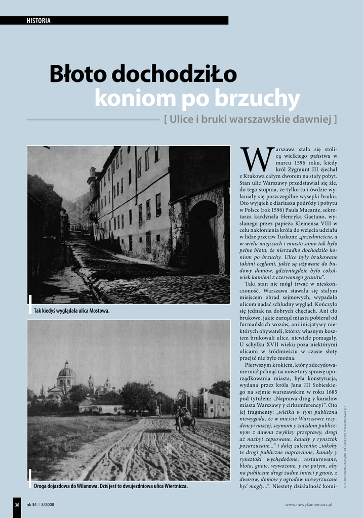 Historia PŁYTY Błoto dochodziŁo koniom po brzuchy [ Ulice i bruki warszawskie dawniej ] Tak kiedyś wyglądała ulica Mostowa. Droga dojazdowa do Wilanowa. Dziś jest to dwujezdniowa ulica Wiertnicza. 36 nk 34 I 5/2008 www.nowykamieniarz.pl Fot: Archiwum Zarządu dróg miejskich w Warszawie (2) W arszawa stała się stolicą wielkiego państwa w marcu 1596 roku, kiedy król Zygmunt III zjechał z Krakowa całym dworem na stały pobyt. Stan ulic Warszawy przedstawiał się źle, do tego stopnia, że tylko tu i ówdzie wyłaniały się poszczególne wysepki bruku. Oto wyjątek z diariusza podróży i pobytu w Polsce (rok 1596) Paula Mucante, sekretarza kardynała Henryka Gaetano, wysłanego przez papieża Klemensa VIII w celu nakłonienia króla do wzięcia udziału w lidze przeciw Turkom: „przedmieścia, a w wielu miejscach i miasto samo tak było pełne błota, że nierzadko dochodziło koniom po brzuchy. Ulice były brukowane takimi cegłami, jakie są używane do budowy domów, gdzieniegdzie było cokolwiek kamieni z czerwonego granitu”. Taki stan nie mógł trwać w nieskończoność. Warszawa stawała się stałym miejscem obrad sejmowych, wypadało ulicom nadać schludny wygląd. Kończyło się jednak na dobrych chęciach. Ani cło brukowe, jakie zarząd miasta pobierał od furmańskich wozów, ani inicjatywy niektórych obywateli, którzy własnym kosztem brukowali ulice, niewiele pomagały. U schyłku XVII wieku poza niektórymi ulicami w śródmieściu w czasie słoty przejść nie było można. Pierwszym krokiem, który zdecydowanie miał pchnąć na nowe tory sprawę uporządkowania miasta, była konstytucja, wydana przez króla Jana III Sobieskiego na sejmie warszawskim w roku 1685 pod tytułem: „Naprawa drog y kanałow miasta Warszawy y cirkumferencyi”. Oto jej fragmenty: „wielka w tym publiczna niewygoda, że w mieście Warszawie rezydencyi naszej, seymom y ziazdom publicznym z dawna zwykłey przeprawy, drogi aż nazbyt zepsowane, kanały y rynsztok pozarzucane...” i dalej zalecenia: „iakoby te drogi publiczne naprawione, kanały y rynsztoki wychędożone, restaurowane, błota, gnoie, wywożone, y na potym, aby na publiczne drogi żadne śmieci y gnoie, z dworow, domow y ogrodow niewyrzucane być mogły...”. Niestety działalność komi- Historia Nieugięty charakter marszałka Bielińskiego Czas na zmiany był już najwyższy. Władysław Łubieński pisał („Świat na wszystkich swoich częściach”, Wrocław 1740, s. 396): „Samo zaś Miasto murem opasane nie wielkie nad Wisłą, ale zawsze czyste, na Przedmieściach zaś całe bruki zalane błotami osobliwie podczas iesieni, y na łokieć nad brukiem”. Komisja rozpoczęła czynności w roku 1742. Na jej czele stanął marszałek wielki koronny Franciszek z Bielina Bieliński, znany z nieugiętego charakteru, gorąco oddany sprawie doprowadzenia ulic stolicy do należytego stanu. Po wielu latach niezmordowanej pracy mógł się poszczycić niepospolitymi rezultatami. O ówczesnym wyglądzie ulic dowiadujemy się z opracowania samej komisji pod tytułem: Planta Kommissyi do Wychędożenia y Reperacyi Brukow y Kanałow Miasta Starey y Nowey Warszawy Constt. Anni 1685, naznaczoney, ex Rescriptio Nayiaśnieyszych MOnarchow Polskich toties reassumowaney y teraz agituiący się in Anno 1743. Oto fragment opisu stanu ulic: „gnoiow y błota po wszystkich ulicach pełno, tak, że iuż trudność spra- Franciszek Bieliński herbu Junosza (1683 – 1766), syn Kazimierza Ludwika Bielińskiego, marszałka wielkiego koronnego i Ludwiki Marii z Morsztynów, podskarbianki koronnej. Ożenił się z podskarbianką Dorotą z Przebendowskich, wdową po Janie Mikołaju Radziwille. Zmarł bezpotomnie. Starosta kowalewski, brodnicki i garwoliński, od 1714 marszałek ziem pruskich, od 1725 wojewoda chełmiński, od 1732 marszałek nadworny koronny, od 1742 marszałek wielki koronny, także kierujący od tego roku Komisją Brukową. Dzięki staraniom marszałka wybrukowano 38 nk 34 I 5/2008 wuią przeieżdżaiącym. Bruki na wielu ulicach popsowane, na wielu zaś cale ich niemasz, co ustawicznie czyni nieochędostwo, y na inne mieysca brukowane błota przypuszcza. Z innych podobnie mieysc iedne drogi gnoiami cale zawalone, inne częścią gnoiami, częścią nie maiąc od wieku żadney naprawy continuo concursu iadących zepssowane”. Wówczas tylko dwie ulice prowadziły z Krakowskiego Przedmieścia do Wisły, jednakże według komisji znajdowały się w stanie zupełnie niezdatnym do użytku: „teraz zaś cale przez zawalenie gnoiami są niedostępne”. Komisja zdawała sobie sprawę z ogromu zadań i ilości niezbędnych funduszy. Dochód z opłaty łokciowego był niewielki, co więcej, starano się wszystkimi sposobami uchylać od płacenia. W niechęci i niezrozumieniu rzeczy przodowali niestety najmajętniejsi. Ogłaszano drukiem „czarne listy” niepłacących, lecz i to nie pomagało. Sam marszałek Bieliński z własnej kieszeni łożył na umiłowane przez siebie dzieło, wynajdywał różne źródła dochodów, zwracał się do króla i senatu o subsydia. Egzekwowanie podatku natrafiało na niesłychane trudności. Marszałek skarżył się: „iż gdy Łokciowe nayubożsi wypłacają znayduje się tych retentów naywięcey u znacznieyszych i dostatnich Ludzi, mimo wzgląd na zawstydzenie in Publico, i mimo delikatność Sumnienia, i gdy ci więcey potrzebuią i więcey zażywają ochędostwa Publicznego, i bardziey Bruki ruynuią”. większość warszawskich ulic. Pamiątką jest nazwa ulicy Marszałkowskiej, stosowana na cześć Bielińskiego od roku 1770. Oto ,co pisze o marszałku Ignacy Baranowski w roku 1919: ...syn Kościoła i Ojczyzny, życzliwy dla Rzeczypospolitej nienaruszonej, sędzia najwyższej instancji dla przyjaciela i nieprzyjaciela, dla najbogatszego i najuboższego. Ideałem jego była Warszawa czysta, świetna, nie ustępująca zagranicznym rezydencjom, godna wielkiego państwa,