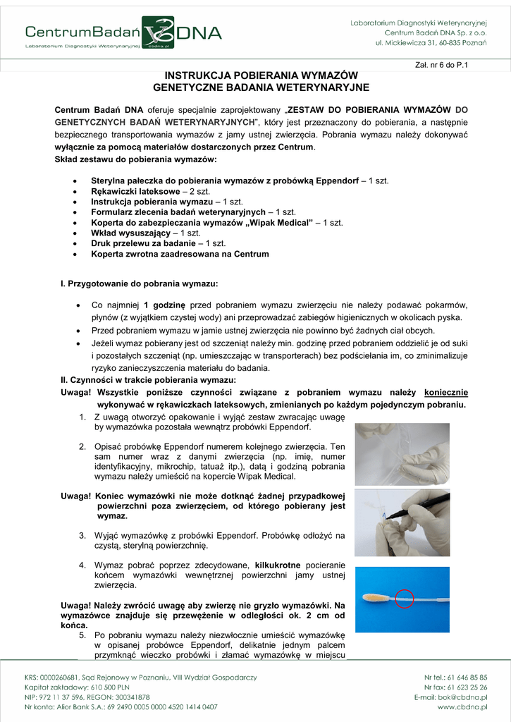 Zał. nr 6 do P.1 INSTRUKCJA POBIERANIA WYMAZÓW GENETYCZNE BADANIA WETERYNARYJNE Centrum Badań DNA oferuje specjalnie zaprojektowany „ZESTAW DO POBIERANIA WYMAZÓW DO GENETYCZNYCH BADAŃ WETERYNARYJNYCH”, który jest przeznaczony do pobierania, a następnie bezpiecznego transportowania wymazów z jamy ustnej zwierzęcia. Pobrania wymazu należy dokonywać wyłącznie za pomocą materiałów dostarczonych przez Centrum. Skład zestawu do pobierania wymazów: Sterylna pałeczka do pobierania wymazów z probówką Eppendorf – 1 szt. Rękawiczki lateksowe – 2 szt. Instrukcja pobierania wymazu – 1 szt. Formularz zlecenia badań weterynaryjnych – 1 szt. Koperta do zabezpieczania wymazów „Wipak Medical” – 1 szt. Wkład wysuszający – 1 szt. Druk przelewu za badanie – 1 szt. Koperta zwrotna zaadresowana na Centrum I. Przygotowanie do pobrania wymazu: Co najmniej 1 godzinę przed pobraniem wymazu zwierzęciu nie należy podawać pokarmów, płynów (z wyjątkiem czystej wody) ani przeprowadzać zabiegów higienicznych w okolicach pyska. Przed pobraniem wymazu w jamie ustnej zwierzęcia nie powinno być żadnych ciał obcych. Jeżeli wymaz pobierany jest od szczeniąt należy min. godzinę przed pobraniem oddzielić je od suki i pozostałych szczeniąt (np. umieszczając w transporterach) bez podściełania im, co zminimalizuje ryzyko zanieczyszczenia materiału do badania. II. Czynności w trakcie pobierania wymazu: Uwaga! Wszystkie poniższe czynności związane z pobraniem wymazu należy koniecznie wykonywać w rękawiczkach lateksowych, zmienianych po każdym pojedynczym pobraniu. 1. Z uwagą otworzyć opakowanie i wyjąć zestaw zwracając uwagę by wymazówka pozostała wewnątrz probówki Eppendorf. 2. Opisać probówkę Eppendorf numerem kolejnego zwierzęcia. Ten sam numer wraz z danymi zwierzęcia (np. imię, numer identyfikacyjny, mikrochip, tatuaż itp.), datą i godziną pobrania wymazu należy umieścić na kopercie Wipak Medical. Uwaga! Koniec wymazówki nie może dotknąć żadnej przypadkowej powierzchni poza zwierzęciem, od którego pobierany jest wymaz. 3. Wyjąć wymazówkę z probówki Eppendorf. Probówkę odłożyć na czystą, sterylną powierzchnię. 4. Wymaz pobrać poprzez zdecydowane, kilkukrotne pocieranie końcem wymazówki wewnętrznej powierzchni jamy ustnej zwierzęcia. Uwaga! Należy zwrócić uwagę aby zwierzę nie gryzło wymazówki. Na wymazówce znajduje się przewężenie w odległości ok. 2 cm od końca. 5. Po pobraniu wymazu należy niezwłocznie umieścić wymazówkę w opisanej probówce Eppendorf, delikatnie jednym palcem przymknąć wieczko probówki i złamać wymazówkę w miejscu przewężenia. Po złamaniu wymazówki szczelnie zamknąć probówkę. 6. Zabezpieczoną wymazówkę w probówce Eppendorf należy następnie umieścić w opisanej kopercie „WipakMedical”. W przypadku zlecania badań większej liczby osobnikówpowyższą procedurę należy powtórzyć z pozostałymi wymazówkami. Każdą wymazówkę należy umieścić w oddzielnej kopercie. 7. Umieścić koperty „WipakMedical” z pobranymi uprzednio wymazami w kopercie zwrotnej. 8. Umieścić w kopercie wkład wysuszający. 9. Wypełnić „FORMULARZ ZLECENIA BADAŃ WETERYNARYJNYCH”: podać we właściwych miejscach niezbędne do przyjęcia zlecenia informacje dot. zlecającego, właściciela, zwierzęcia, próbki etc. wybrać zlecane badania genetyczne zaznaczając czytelnie odpowiednie pola (prosimy zapoznać się z załączonym do Zestawu cennikiem). uwaga: podpis osoby zlecającej jest niezbędny do przyjęcia zlecenia na wykonanie badań. 10. Zabezpieczone w kopertach WipakMedical i opisane wymazówki, wkład wysuszający oraz wypełniony Formularz zlecenia badań genetycznych umieścić w zaadresowanej zwrotnie kopercie. Materiał do badań proszę wysłać kurierem, ewentualnie Pocztą Polską listem poleconym priorytetowym ( rekomendowane jest nadanie do godz. 15). Wysyłka powinna odbyć się tak aby materiał biologiczny przed weekendem dotarł do laboratorium. Materiał Biologiczny proszę wysłać na adres: Centrum Badań DNA Ul. Mickiewicza 31 60-835 Poznań