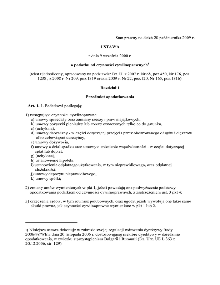 Stan prawny na dzień 20 października 2009 r. USTAWA z dnia 9 września 2000 r. o podatku od czynności cywilnoprawnych1 (tekst ujednolicony, opracowany na podstawie: Dz. U. z 2007 r. Nr 68, poz.450, Nr 176, poz. 1238 , z 2008 r. Nr 209, poz.1319 oraz z 2009 r. Nr 22, poz.120, Nr 165, poz.1316). Rozdział 1 Przedmiot opodatkowania Art. 1. 1. Podatkowi podlegają: 1) następujące czynności cywilnoprawne: a) umowy sprzedaŜy oraz zamiany rzeczy i praw majątkowych, b) umowy poŜyczki pieniędzy lub rzeczy oznaczonych tylko co do gatunku, c) (uchylona), d) umowy darowizny - w części dotyczącej przejęcia przez obdarowanego długów i cięŜarów albo zobowiązań darczyńcy, e) umowy doŜywocia, f) umowy o dział spadku oraz umowy o zniesienie współwłasności - w części dotyczącej spłat lub dopłat, g) (uchylona), h) ustanowienie hipoteki, i) ustanowienie odpłatnego uŜytkowania, w tym nieprawidłowego, oraz odpłatnej słuŜebności, j) umowy depozytu nieprawidłowego, k) umowy spółki; 2) zmiany umów wymienionych w pkt 1, jeŜeli powodują one podwyŜszenie podstawy opodatkowania podatkiem od czynności cywilnoprawnych, z zastrzeŜeniem ust. 3 pkt 4; 3) orzeczenia sądów, w tym równieŜ polubownych, oraz ugody, jeŜeli wywołują one takie same skutki prawne, jak czynności cywilnoprawne wymienione w pkt 1 lub 2. 1) Niniejsza ustawa dokonuje w zakresie swojej regulacji wdroŜenia dyrektywy Rady 2006/98/WE z dnia 20 listopada 2006 r. dostosowującej niektóre dyrektywy w dziedzinie opodatkowania, w związku z przystąpieniem Bułgarii i Rumunii (Dz. Urz. UE L 363 z 20.12.2006, str. 129). 2. Przepisy ustawy o: 1) umowie spółki i jej zmianie – stosuje się odpowiednio do aktów załoŜycielskich spółek, statutów spółek i ich zmiany; 2) czynnościach cywilnoprawnych – stosuje się odpowiednio do przedmiotów opodatkowania określonych w ust. 1 pkt 2 i 3. 3. W przypadku umowy spółki za zmianę umowy uwaŜa się: 1) przy spółce osobowej – wniesienie lub podwyŜszenie wkładu, którego wartość powoduje zwiększenie majątku spółki albo podwyŜszenie kapitału zakładowego, poŜyczkę udzieloną spółce przez wspólnika, dopłaty oraz oddanie przez wspólnika spółce rzeczy lub praw majątkowych do nieodpłatnego uŜywania; 2) przy spółce kapitałowej – podwyŜszenie kapitału zakładowego z wkładów lub ze środków spółki oraz dopłaty; 3) przekształcenie lub łączenie spółek, jeŜeli ich wynikiem jest zwiększenie majątku spółki osobowej lub podwyŜszenie kapitału zakładowego; 4) przeniesienie na terytorium Rzeczypospolitej Polskiej z terytorium państwa niebędącego państwem członkowskim: a) rzeczywistego ośrodka zarządzania spółki kapitałowej, jeŜeli jej siedziba nie znajduje się na terytorium państwa członkowskiego, b) siedziby spółki kapitałowej, jeŜeli jej rzeczywisty ośrodek zarządzania nie znajduje się na terytorium państwa członkowskiego – takŜe wtedy, gdy czynność ta nie powoduje podwyŜszenia kapitału zakładowego. 4. Czynności cywilnoprawne podlegają podatkowi, z zastrzeŜeniem ust. 5, jeŜeli ich przedmiotem są: 1) rzeczy znajdujące się na terytorium Rzeczypospolitej Polskiej lub prawa majątkowe wykonywane na terytorium Rzeczypospolitej Polskiej; 2) rzeczy znajdujące się za granicą lub prawa majątkowe wykonywane za granicą, w przypadku gdy nabywca ma miejsce zamieszkania lub siedzibę na terytorium Rzeczypospolitej Polskiej i czynność cywilnoprawna została dokonana na terytorium Rzeczypospolitej Polskiej. 5. Umowa spółki oraz jej zmiana podlega podatkowi, jeŜeli w chwili dokonania czynności na terytorium Rzeczypospolitej Polskiej znajduje się: 1) w przypadku spółki osobowej - siedziba tej spółki; 2 2) w przypadku spółki kapitałowej: a) rzeczywisty ośrodek zarządzania albo b) siedziba tej spółki - jeŜeli jej rzeczywisty ośrodek zarządzania nie znajduje się na terytorium innego państwa członkowskiego. 6. (uchylony). 7. (uchylony). 8. (uchylony). Art. 1a. UŜyte w ustawie określenia oznaczają: 1) spółka osobowa - spółkę: cywilną, jawną, partnerską, komandytową lub komandytowoakcyjną; 2) spółka kapitałowa - spółkę: z ograniczoną odpowiedzialnością, akcyjną lub europejską; 3) siedziba spółki - siedzibę spółki określoną w umowie spółki; 4) rzeczywisty ośrodek zarządzania - miejscowość, w której ma siedzibę organ zarządzający spółki kapitałowej; 5) państwo członkowskie – państwo członkowskie Unii Europejskiej lub państwo członkowskie Europejskiego Porozumienia o Wolnym Handlu (EFTA) – strona umowy o Europejskim Obszarze Gospodarczym; 6) (uchylony); 7) podatek od towarów i usług – podatek od towarów i usług w rozumieniu ustawy z dnia 11 marca 2004 r. o podatku od towarów i usług (Dz. U. Nr 54, poz. 535, z późn. zm.) lub podatek od wartości dodanej pobierany na podstawie przepisów obowiązujących w państwach członkowskich. Art. 2. Nie podlegają podatkowi: 1) czynności cywilnoprawne w sprawach: a) alimentacyjnych, opieki, kurateli i przysposobienia, b) ubezpieczenia społecznego, ubezpieczenia zdrowotnego, opieki społecznej, ulg określonych w przepisach szczególnych dla Ŝołnierzy niezawodowych i osób odbywających słuŜbę zastępczą oraz ich rodzin, a takŜe uprawnień dla osób niepełnosprawnych i osób objętych przepisami o szczególnych uprawnieniach dla kombatantów, c) wyboru Prezydenta Rzeczypospolitej Polskiej, wyborów do Sejmu, Senatu i organów samorządu terytorialnego oraz referendum, d) powszechnego obowiązku obrony, 3 e) zatrudnienia, świadczeń socjalnych i wynagrodzeń za pracę, f) nauki, szkolnictwa i oświaty pozaszkolnej oraz zdrowia, g) podlegających przepisom o gospodarce nieruchomościami lub przepisom o autostradach płatnych, h) podlegających przepisom o szczególnych zasadach przygotowania i realizacji inwestycji w zakresie dróg krajowych, i) (uchylona); 2) umowy 