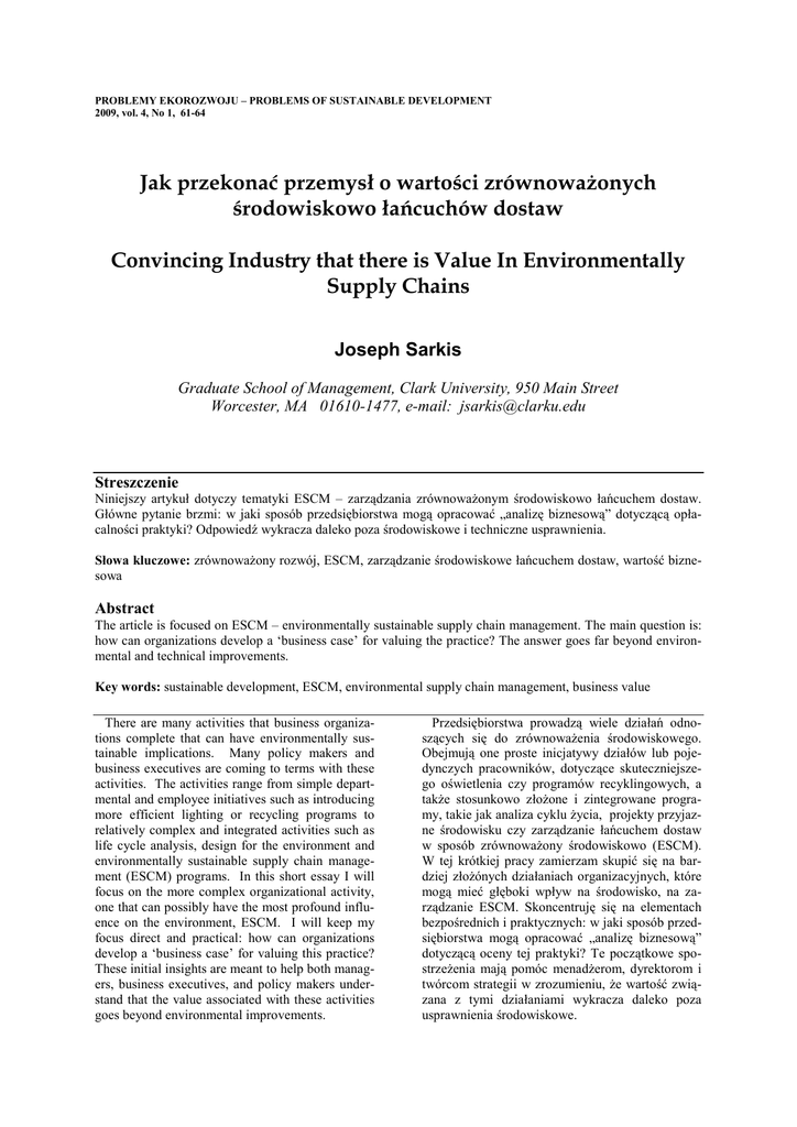 PROBLEMY EKOROZWOJU – PROBLEMS OF SUSTAINABLE DEVELOPMENT 2009, vol. 4, No 1, 61-64 Jak przekonać przemysł o wartości zrównoważonych środowiskowo łańcuchów dostaw Convincing Industry that there is Value In Environmentally Supply Chains Joseph Sarkis Graduate School of Management, Clark University, 950 Main Street Worcester, MA 01610-1477, e-mail: [email protected] Streszczenie Niniejszy artykuł dotyczy tematyki ESCM – zarządzania zrównoważonym środowiskowo łańcuchem dostaw. Główne pytanie brzmi: w jaki sposób przedsiębiorstwa mogą opracować „analizę biznesową” dotyczącą opłacalności praktyki? Odpowiedź wykracza daleko poza środowiskowe i techniczne usprawnienia. Słowa kluczowe: zrównoważony rozwój, ESCM, zarządzanie środowiskowe łańcuchem dostaw, wartość biznesowa Abstract The article is focused on ESCM – environmentally sustainable supply chain management. The main question is: how can organizations develop a ‘business case’ for valuing the practice? The answer goes far beyond environmental and technical improvements. Key words: sustainable development, ESCM, environmental supply chain management, business value There are many activities that business organizations complete that can have environmentally sustainable implications. Many policy makers and business executives are coming to terms with these activities. The activities range from simple departmental and employee initiatives such as introducing more efficient lighting or recycling programs to relatively complex and integrated activities such as life cycle analysis, design for the environment and environmentally sustainable supply chain management (ESCM) programs. In this short essay I will focus on the more complex organizational activity, one that can possibly have the most profound influence on the environment, ESCM. I will keep my focus direct and practical: how can organizations develop a ‘business case’ for valuing this practice? These initial insights are meant to help both managers, business executives, and policy makers understand that the value associated with these activities goes beyond environmental improvements. Przedsiębiorstwa prowadzą wiele działań odnoszących się do zrównoważenia środowiskowego. Obejmują one proste inicjatywy działów lub pojedynczych pracowników, dotyczące skuteczniejszego oświetlenia czy programów recyklingowych, a także stosunkowo złożone i zintegrowane programy, takie jak analiza cyklu życia, projekty przyjazne środowisku czy zarządzanie łańcuchem dostaw w sposób zrównoważony środowiskowo (ESCM). W tej krótkiej pracy zamierzam skupić się na bardziej złożónych działaniach organizacyjnych, które mogą mieć głęboki wpływ na środowisko, na zarządzanie ESCM. Skoncentruję się na elementach bezpośrednich i praktycznych: w jaki sposób przedsiębiorstwa mogą opracować „analizę biznesową” dotyczącą oceny tej praktyki? Te początkowe spostrzeżenia mają pomóc menadżerom, dyrektorom i twórcom strategii w zrozumieniu, że wartość związana z tymi działaniami wykracza daleko poza usprawnienia środowiskowe. 62 Joseph Sarkis/Problemy Ekorozwoju/Problems of Sustainable Development 1/2009, 61-64 Unlike many other activities ESCM may not only be a complex internal activity but also requires the initiatives and collaboration of external organizational collaborators. These programs are not simple and typically require significant resources for their design, implementation and management. Not only are they multi-organizational, but multi-functional. For example, it will require the efforts of marketing, engineering, procurement, logistics, and operations managers, in addition to the environmental management groups to manage the supply capacity of an organization. Thus, not only is it a complex issue to manage for practitioners, but researchers in these fields also need to be understanding of theories and models from a number of disciplines. Business value, as I define it, means improving the organization’s short-term and long-term profitability. I will focus on four ways that organizations can gain business value from ESCM. These are: 1) Reduction of costs in the supply chain, 2) Business continuity 3) New revenue streams, and 4) Further strengthening the ‘right to do business’. I will briefly go over each of these and provide some examples. The purpose is only to provide a general set of value-adding factors, they are not meant to be exhaustive and critical thinkers can define numerous other means for gaining value. Reduction of costs occurs from the elimination of wastes. Porter and Van der Linde (1995) in their seminal article essentially point to the fact that any pollution essentially means there is inefficiency and increased costs. This idea also flows through the supply chain. If supply chains produce wastes they increase their costs. Eliminating waste streams will reduce costs, very tangible costs such as waste disposal costs and intangible costs such as the quality of life of its employs. When taken across the supply chain and across organizations these costs may be substantial. Indirect costs to society, which may be internalized through taxes, fines and penalties, would also be lessened. Business continuity essentially means having the resources to continue to remain in business and delivering products or services to customers. If organizational supply chains are unsustainable, they may use up their resources and materials may not be as easily available or their costs can dramatically increase. By managing supply chains in a sustainable way (e.g. sustainable forestry and sustainable fisheries) the supply of these resources may be guaranteed more effectively and the supply chain will continue to thrive. Another business continuity issue is the concern that some of your suppliers may be forced to cease operations by authorities due to poor environmental performance, causing furth