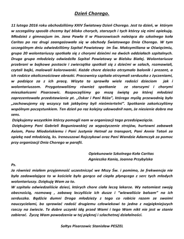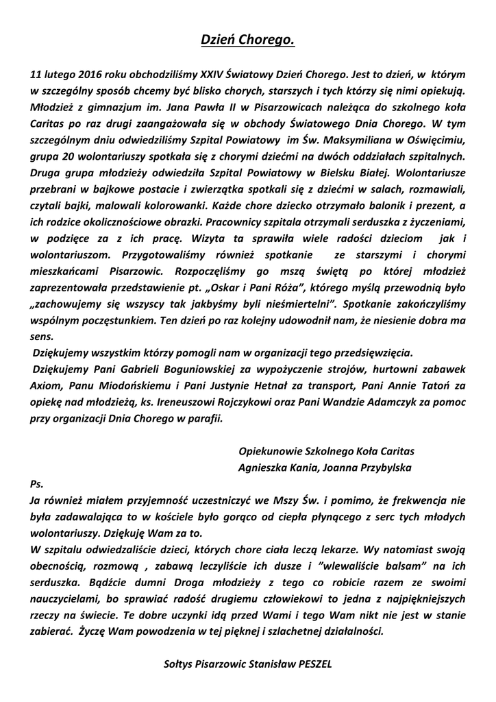 Dzień Chorego. 11 lutego 2016 roku obchodziliśmy XXIV Światowy Dzień Chorego. Jest to dzień, w którym w szczególny sposób chcemy być blisko chorych, starszych i tych którzy się nimi opiekują. Młodzież z gimnazjum im. Jana Pawła II w Pisarzowicach należąca do szkolnego koła Caritas po raz drugi zaangażowała się w obchody Światowego Dnia Chorego. W tym szczególnym dniu odwiedziliśmy Szpital Powiatowy im Św. Maksymiliana w Oświęcimiu, grupa 20 wolontariuszy spotkała się z chorymi dziećmi na dwóch oddziałach szpitalnych. Druga grupa młodzieży odwiedziła Szpital Powiatowy w Bielsku Białej. Wolontariusze przebrani w bajkowe postacie i zwierzątka spotkali się z dziećmi w salach, rozmawiali, czytali bajki, malowali kolorowanki. Każde chore dziecko otrzymało balonik i prezent, a ich rodzice okolicznościowe obrazki. Pracownicy szpitala otrzymali serduszka z życzeniami, w podzięce za z ich pracę. Wizyta ta sprawiła wiele radości dzieciom jak i wolontariuszom. Przygotowaliśmy również spotkanie ze starszymi i chorymi mieszkańcami Pisarzowic. Rozpoczęliśmy go mszą świętą po której młodzież zaprezentowała przedstawienie pt. „Oskar i Pani Róża”, którego myślą przewodnią było „zachowujemy się wszyscy tak jakbyśmy byli nieśmiertelni”. Spotkanie zakończyliśmy wspólnym poczęstunkiem. Ten dzień po raz kolejny udowodnił nam, że niesienie dobra ma sens. Dziękujemy wszystkim którzy pomogli nam w organizacji tego przedsięwzięcia. Dziękujemy Pani Gabrieli Boguniowskiej za wypożyczenie strojów, hurtowni zabawek Axiom, Panu Miodońskiemu i Pani Justynie Hetnał za transport, Pani Annie Tatoń za opiekę nad młodzieżą, ks. Ireneuszowi Rojczykowi oraz Pani Wandzie Adamczyk za pomoc przy organizacji Dnia Chorego w parafii. Opiekunowie Szkolnego Koła Caritas Agnieszka Kania, Joanna Przybylska Ps. Ja również miałem przyjemność uczestniczyć we Mszy Św. i pomimo, że frekwencja nie była zadawalająca to w kościele było gorąco od ciepła płynącego z serc tych młodych wolontariuszy. Dziękuję Wam za to. W szpitalu odwiedzaliście dzieci, których chore ciała leczą lekarze. Wy natomiast swoją obecnością, rozmową , zabawą leczyliście ich dusze i ”wlewaliście balsam” na ich serduszka. Bądźcie dumni Droga młodzieży z tego co robicie razem ze swoimi nauczycielami, bo sprawiać radość drugiemu człowiekowi to jedna z najpiękniejszych rzeczy na świecie. Te dobre uczynki idą przed Wami i tego Wam nikt nie jest w stanie zabierać. Życzę Wam powodzenia w tej pięknej i szlachetnej działalności. Sołtys Pisarzowic Stanisław PESZEL