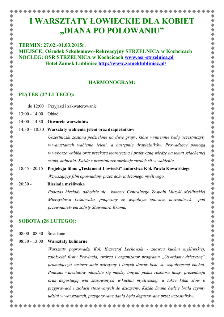 I WARSZTATY ŁOWIECKIE DLA KOBIET „DIANA PO POLOWANIU” TERMIN: 27.02.-01.03.2015r. MIEJSCE: Ośrodek Szkoleniowo-Rekreacyjny STRZELNICA w Kochcicach NOCLEG: OSR STRZELNICA w Kochcicach www.osr-strzelnica.pl Hotel Zamek Lubliniec http://www.zameklubliniec.pl/ HARMONOGRAM: PIĄTEK (27 LUTEGO): do 12:00 Przyjazd i zakwaterowanie 13:00 - 14:00 Obiad 14:00 - 14:30 Otwarcie warsztatów 14:30 – 18:30 Warsztaty wabienia jeleni oraz drapieżników Uczestniczki zostaną podzielone na dwie grupy, które wymiennie będą uczestniczyły w warsztatach wabienia jeleni, a następnie drapieżników. Prowadzący pomogą w wyborze wabika oraz przekażą teoretyczną i praktyczną wiedzę na temat szlachetnej sztuki wabienia. Każda z uczestniczek spróbuje swoich sił w wabieniu. 18:45 - 20:15 Projekcja filmu „Testament Łowiecki” autorstwa Kol. Pawła Kowalskiego Wzruszający film opowiadany przez doświadczonego myśliwego. 20:30 - Biesiada myśliwska Podczas biesiady odbędzie się koncert Centralnego Zespołu Muzyki Myśliwskiej Mieczysława Leśniczaka, połączony ze wspólnym śpiewem uczestniczek pod przewodnictwem solisty Sławomira Krama. SOBOTA (28 LUTEGO): 08:00 - 08:30 Śniadanie 08:30 - 13:00 Warsztaty kulinarne Warsztaty poprowadzi Kol. Krzysztof Lechowski - znawca kuchni myśliwskiej, założyciel firmy Provincja, twórca i organizator programu „Oswajamy dziczyznę” promującego zastosowanie dziczyzny i innych darów lasu we współczesnej kuchni. Podczas warsztatów odbędzie się między innymi pokaz rozbioru tuszy, prezentacja oraz degustacją win stosowanych w kuchni myśliwskiej, a także kilka słów o przyprawach i ziołach stosowanych do dziczyzny. Każda Diana będzie brała czynny udział w warsztatach, przygotowane dania będą degustowane przez uczestników. 13:00 - 14:00 Obiad 14:30 – 17:30 Zawody strzeleckie lub wykłady tematyczne Koleżanki, które zadeklarowały udział w zawodach strzeleckich, będą strzelały skrócony wielobój myśliwski na konkurencjach skeet, trap oraz przeloty. Diany które nie będą brały udziału w zawodach zapraszamy na wykłady z zakresu: konserwacja broni elaboracja amunicji myśliwskiej 18:00 - 19:30 Omówienie strategii Klubu Dian PZŁ 20:00 - Kolacja. NIEDZIELA (01 MARCA): 08:00 - 09:00 Śniadanie 09:00 – 11:00 Warsztaty z zakresu kynologii łowieckiej Prowadzący warsztaty omówi na co zwrócić uwagę przy wyborze szczenięcia z miotu. Szczegółowo przekaże od czego zacząć naukę? Jakie metody zastosować? Teoretyczna wiedza zostanie uzupełniona praktycznym pokazem pracy ze szczeniakiem przez zabawę. 11:00 - 12:30 Pokaz sokolniczy Podczas praktycznego pokazu prowadzący opowie między innymi jak zostać sokolnikiem? Jakie ptaki są wykorzystywane w sokolnictwie? A także od czego rozpocząć pracę z ptakiem łowczym oraz z jakimi problemami można się spotkać? 12:30 - Odjazd uczestników.