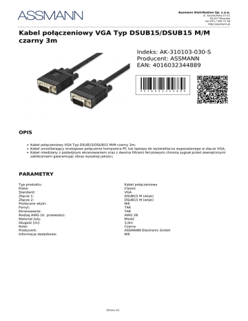 Assmann Distribution Sp. z o.o. ul. Szczecińska 17-21 54-517 Wrocław tel: 071 / 326 71 40 http://assmann.pl Kabel połączeniowy VGA Typ DSUB15/DSUB15 M/M czarny 3m Indeks: AK-310103-030-S Producent: ASSMANN EAN: 4016032344889 4 0 1 6 0 3 2 3 4 4 8 8 9 OPIS Kabel połączeniowy VGA Typ DSUB15/DSUB15 M/M czarny 3m; Kabel umożliwiający analogowe połączenie komputera PC lub laptopa do wyświetlacza wyposażonego w złącze VGA; Kabel miedziany z podwójnym ekranowaniem oraz z dwoma filtrami ferrytowymi chronią sygnał przed zewnętrznymi zakłóceniami gwarantując obraz wysokiej jakości; PARAMETRY Typ produktu: Klasa: Standard: Złącze 1: Złącze 2: Pozłacane wtyki: Ferryt: Ekranowanie: Rodzaj AWG (śr. przewodu): Materiał żyły: Długość [m]: Kolor: Producent: Informacje dodatkowe: Kabel połączeniowy Classic VGA DSUB15 M (wtyk) DSUB15 M (wtyk) NIE TAK TAK AWG 28 Miedź 3,0m Czarny ASSMANN Electronic GmbH NIE Strona 1/1 Powered by TCPDF (www.tcpdf.org)