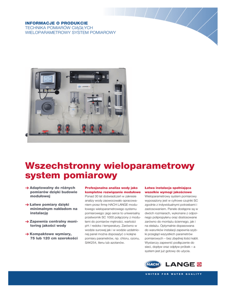 INFORMACJE O PRODUKCIE TECHNIKA POMIARÓW CIĄGŁYCH WIELOPARAMETROWY SYSTEM POMIAROWY Wszechstronny wieloparametrowy system pomiarowy ¾ Adaptowalny do różnych pomiarów dzięki budowie modułowej ¾ Łatwe pomiary dzięki minimalnym nakładom na instalację ¾ Zapewnia centralny monitoring jakości wody ¾ Kompaktowe wymiary, 75 lub 120 cm szerokości Profesjonalna analiza wody jako kompletne rozwiązanie modułowe Ponad 30 lat doświadczeń w zakresie analizy wody zaowocowało opracowaniem przez firmę HACH LANGE modułowego wieloparametrowego systemu pomiarowego: jego serce to uniwersalny przetwornik SC 1000 połączony z modułami do pomiarów mętności, wartości pH / redoks i temperatury. Zarówno w wodzie surowej jak i w wodzie uzdatnionej panel można doposażyć o kolejne pomiary parametrów, np. chloru, ozonu, SAK254, tlenu lub azotanów. Łatwa instalacja spełniająca wszelkie wymogi jakościowe Wieloparametrowy system pomiarowy wyposażony jest w cyfrowe czujniki SC zgodnie z indywidualnymi potrzebami i zastosowaniem. Panele dostępne są w dwóch rozmiarach, wykonane z odpornego polipropylenu oraz dostosowane zarówno do montażu ściennego, jak i na stelażu. Optymalnie dopasowana do warunków instalacji zapewnia szybki przegląd wszystkich parametrów pomiarowych – bez zbędnej ilości kabli. Wystarczy zapewnić podłączenie do sieci, dopływ oraz odpływ próbek – a system jest już gotowy do użycia. WIELOPARAMETROWY SYSTEM POMIAROWY Przykłady konfiguracji Wolny chlor, ClO2, O3 – czujnik 9184 sc Czujnik przewodności 8312 Czujnik tlenu LDO SAK254 – sonda UVAS sc L Z Y 6 0 1 . OPCJE, NUMER ZAMÓWIENIA 1. Zmętnienie Brak ULTRATURB plus sc 1720E sc FILTERTRAK 660 sc 2. Wartość pH / temperatura, redoks, przewodność, tlen Brak Wartość pH / temperatura Redoks Przewodność Tlen (LDO) Wartość pH / temperatura, redoks Wartość pH / temperatura, redoks, przewodność Wartość pH / temperatura, redoks, tlen (LDO) Wartość pH / temperatura, redoks, przewodność, tlen (LDO) Wartość pH / temperatura, przewodność Wartość pH / temperatura, przewodność, tlen (LDO) Wartość pH / temperatura, tlen (LDO) Redoks, przewodność Redoks, tlen (LDO) Redoks, przewodność, tlen (LDO) Przewodność, tlen (LDO) 3. Chlor, dwutlenek chloru, ozon Brak Wolny chlor Całkowity chlor wolny Dwutlenek chloru Ozon 4. Azotany, SAK254 Brak Azotany (sonda NITRATAX sc) SAK254 (sonda UVAS sc) Zastrzegamy prawo do zmian. Elektroda dla wartości pH / redoks, temp. 9 Azotany – sonda NITRATAX plus sc 9 . X X X X 0 1 2 3 0 A B C D E F G H I J K L M N O 1 WIĘCEJ INFORMACJI Przetwornik SC 1000 ULTRATURB plus sc LDO Czujnik 9184 sc Sonda UVAS sc NITRATAX sc NR KAT. DOC033.60.00400 DOC053.60.03217 DOC033.60.03208 DOC063.60.00441 DOC053.52.03256 DOC053.60.03222 Przetwornik SC 1000 musi zostać skonfigurowany i zamówiony oddzielnie. Usługi HACH LANGE Zadzwoń, aby złożyć zamówienie. Informacje i porady: Zadzwoń, aby uzyskać wsparcie techniczne. 0 1 2 3 4 Pomoc techniczna w terenie. 0 1 2 www.hach-lange.pl Aktualne informacje. DOC063.60.30011.Sep09 Czujnik zmętnienia ULTRATURB plus sc