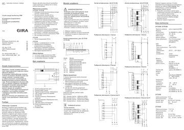 PL Montaż urządzenia Zawsze aktualna baza danych produktów i opisy techniczne znajdują się na naszej stronie internetowej. Instrukcja montażu i obsługi 2173 00 i 2175 00 • Saldujący licznik dwukierunkowy energii czynnej i energii biernej • Dwukierunkowy interfejs D0 do komunikacji na stronie czołowej • Cztery wyjścia łączeniowe (Opto Power MOSFET) do indywidualnego stosowania • Przełączanie taryf (2 wzgl. 4 taryfy) • Wartości progowe do nadzoru różnych parametrów mocy programowane na urządzeniu lub przez ETS • Klasa dokładności B • Zabezpieczenie danych przez EEPROM • Do stosowania w gospodarstwach prywatnych i zakładach przemysłowych • Do montażu na szynie montażowej TH35 • Nie wymaga konserwacji (Z przyłączem bezpośrednim) 2173 00 (Z przyłączem przekładnika) 2175 00 KNX P.O. Box 12 20 42477 Radevormwald Niemcy 2173 00 • Pomiar bezpośredni (75 A) 10861563 05.15 Gira Giersiepen GmbH & Co. KG Systemy instalacji elektrycznych Tel +49 (0) 2195 / 602 - 0 Faks +49 (0) 2195 / 602 - 191 www.gira.de [email protected] NIEBEZPIECZEŃSTWO Dotknięcie części pod napięciem może prowadzić do poważnych szkód rzeczowych lub szkód na zdrowiu lub życiu, np. wskutek pożaru lub porażenia elektrycznego. Przed rozpoczęciem prac przy urządzeniu odłączyć je od napięcia i przykryć części pod napięciem w otoczeniu. Nieprzestrzeganie grozi odpowiedzialnością osobistą za szkody rzeczowe i szkody na zdrowiu lub życiu! N E4 E3 E2 E1 Informacje o systemie Niniejsze urządzenie jest produktem systemu KNX i odpowiada dyrektywom KNX. Wymagana jest szczegółowa wiedza fachowa zdobyta na szkoleniach KNX. Działanie urządzenia jest zależne od oprogramowania. Szczegółowe informacje nt. wersji oprogramowania, odpowiedniego zakresu działania i samego oprogramowania należy zaczerpnąć z bazy danych produktów producenta. Projektowanie, instalacja i uruchomienie urządzenia następują za pomocą oprogramowania certyfikowanego przez KNX. L3 L3 P1 s2 P2 L2 L2 P1 s1 L2 s2 L1 L1 L1 s1 P2 S0 4 S0 3 S0 2 Dane techniczne 2173 00 i 2175 00 6A L1 L2 L3 N L1 N L1 N KNX Medium: Tryb uruchomienia: Napięcie znamionowe: Rodzaj przyłączenia: s2 L3 L3 L3 s1 s2 L2 L2 Zacisk 1/2 1 11 2 3 4 5 6 7 8 9 10 Zaciski przyłączeniowe, góra Przycisk (żółty): Serwis Przycisk programowania i LED (zielona) LED: Energia czynna (10 imp/Wh) Interfejs D0 Przycisk (czerwony): Potwierdzenie/ podpunkt 7 Przycisk (niebieski): Wybór/punkt menu 8 Wyświetlacz 9 LED: Moc bierna (10 imp/varh) 10 Zaciski przyłączeniowe, dół (za osłoną) 11 Przyłącze KNX 3/4 5 6/7 8/9 10 / 13 12 / 13 14 / 15 Obsada Sygnał synchronizacyjny okresu pomiarowego Przełączanie taryf (AC 230 V) Przełączanie taryf (N) Wyjście łączeniowe 1 Wyjście łączeniowe 2 Wyjście łączeniowe 3 Wyjście łączeniowe 4 Rezerwa s1 L1 s2 L1 L1 P2 P1 s1 L1 Pomiar zużycia: N Podłączenie alternatywne: 2-fazowe L1 L2 N L1 L2 N s2 4 wyjścia łączeniowe można stosować następująco: • jako elektroniczne wyjście łączeniowe KNX (konfiguracja przez ETS) • jako wyjście impulsowe S0 według EN 62053-21 (konfiguracja przyciskami urządzenia) • jako łącznik wartości progowych (konfiguracja przez ETS / przyciskami urządzenia) Fabryczna obsada czterech wyjść łączeniowych: L3 L3 s1 L2 s2 L2 L2 P1 s1 L1 s2 L1 L1 s1 L2 i czynna – odbierana (kWh) bierna – odbierana (kvarh) czynna – dostarczana (kWh) bierna – dostarczana (kvarh) P2 P1 6A 6A N L1 L2 L3 Dokładność pomiaru Zakres pomiarowy: Prąd rozruchowy: Zaciski, góra: Zaciski, dół: N s2 Zakres pomiarowy: Prąd rozruchowy: Bezpiecznik zewnętrzny: Zaciski, góra: Zaciski, dół: P2 L2 L2 P1 s1 s2 L1 P2 L1 L1 DC 21 ... 32 V SELV zacisk przyłączeniowy magistrali AC 230 V klasa B (±1%) dla energii czynnej według EN 50470-1,-3 spełnia EN 62056-21 4 Opto Power MOSFET, 5 ... 400 V AC/DC, maks. 90 mA -25 ... +55 °C -5 ... +45 °C IP 20 5 modułów IEC 62056-21 do -23 IEC 62056-42 -46 -53 75 A < 9 mA do 2,5 mm2, 0,5 Nm 0,5 ... 35 mm2, 1,6 Nm 2175 00 P1 s1 L2 TP Tryb S (ETS) P2 L3 L3 3x 230/400 V (± 20%) 50 – 60 Hz < 10 W < 0,6 W/faza B (±1%) dla energii czynnej według EN 50470-1 N Podłączenie alternatywne: 3-fazowe bez N s2 L3 przez magistralę KNX 2173 00 L1 L2 L1 L2 L3 N Proszę pamiętać: W przypadku podłączenia z "1 fazą", "2 fazami" lub "3 fazami bez N" dokładność pomiaru nie odpowiada już klasie dokładności B. Interfejs D0: Wyjścia Liczba: Typ: Temperatura otoczenia Urządzenie : KNX-BCU: Stopień ochrony: Wymiary: Spełnia: P2 Podłączenie alternatywne: 3-fazowe bez N Energia Energia Energia Energia N N L3 1: 2: 3: 4: N L1 Podłączenie alternatywne: 2-fazowe Wyjścia łączeniowe S0 S0 S0 S0 Wejścia Napięcie wejściowe: 6A L1 Napięcie zasilania: Napięcie znamionowe: Częstotliwość: Pobór mocy: Zużycie własne: Klasa dokładności: N N S0 1 L1 L2 L3 N Podłączenie alternatywne: 1-fazowe Podłączenie alternatywne: 1-fazowe L2 • 1x licznik energii komfortowy KNX • 1x zacisk przyłączeniowy magistrali • 1x instrukcja montażu i obsługi Załączyć napięcie sieciowe. Po kilku sekundach fazy inicjalizacji na wyświetlaczu pojawia się najpierw [Test display] (Test wyświetlacza), a potem [Language selection] (Wybór języka). 4. Niebieskim przyciskiem wybrać język użytkownika (niemiecki lub angielski). Po ok. 5 s wybrany język zostaje automatycznie przejęty i pojawia się widok standardowy [Active energy] (Energia czynna). 5. Załączyć napięcie magistralne. P1 6A Zakres dostawy 1 2 3 4 5 6 P2 s1 L3 1 2 3 4 5 6 7 8 9 10 111213 1415 S Funkcja N s2 6A 1. Odłączyć napięcie sieciowe. 2. Nałożyć urządzenie na szynę montażową. 3. Okablować urządzenie odpowiednio do stosowania. Opis urządzenia Zabudowę i montaż urządzeń elektrycznych mogą wykonywać wyłącznie wykwalifikowani elektrycy. W przypadku nieprawidłowego montażu możliwe są poważne obrażenia, pożar lub szko