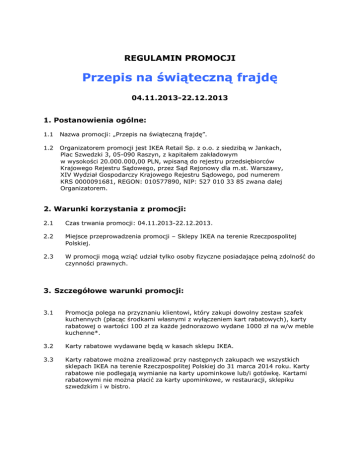 REGULAMIN PROMOCJI Przepis na świąteczną frajdę 04.11.2013-22.12.2013 1. Postanowienia ogólne: 1.1 Nazwa promocji: „Przepis na świąteczną frajdę”. 1.2 Organizatorem promocji jest IKEA Retail Sp. z o.o. z siedzibą w Jankach, Plac Szwedzki 3, 05-090 Raszyn, z kapitałem zakładowym w wysokości 20.000.000,00 PLN, wpisaną do rejestru przedsiębiorców Krajowego Rejestru Sądowego, przez Sąd Rejonowy dla m.st. Warszawy, XIV Wydział Gospodarczy Krajowego Rejestru Sądowego, pod numerem KRS 0000091681, REGON: 010577890, NIP: 527 010 33 85 zwana dalej Organizatorem. 2. Warunki korzystania z promocji: 2.1 Czas trwania promocji: 04.11.2013-22.12.2013. 2.2 Miejsce przeprowadzenia promocji – Sklepy IKEA na terenie Rzeczpospolitej Polskiej. 2.3 W promocji mogą wziąć udział tylko osoby fizyczne posiadające pełną zdolność do czynności prawnych. 3. Szczegółowe warunki promocji: 3.1 Promocja polega na przyznaniu klientowi, który zakupi dowolny zestaw szafek kuchennych (płacąc środkami własnymi z wyłączeniem kart rabatowych), karty rabatowej o wartości 100 zł za każde jednorazowo wydane 1000 zł na w/w meble kuchenne*. 3.2 Karty rabatowe wydawane będą w kasach sklepu IKEA. 3.3 Karty rabatowe można zrealizować przy następnych zakupach we wszystkich sklepach IKEA na terenie Rzeczpospolitej Polskiej do 31 marca 2014 roku. Karty rabatowe nie podlegają wymianie na karty upominkowe lub/i gotówkę. Kartami rabatowymi nie można płacić za karty upominkowe, w restauracji, sklepiku szwedzkim i w bistro. 3.4 Warunki realizacji usługi montażu mebli kuchennych objętych niniejszą promocją odbywają się zgodnie z Ogólnymi Warunkami Świadczenia Usług Montażu Mebli dostępnymi w sklepach IKEA. Maksymalny czas wykonania kompleksowej usługi montażu to 3 tygodnie. Czas realizacji usługi liczony jest od momentu złożenia zamówienia w Punkcie Obsługi Transportowej(złożenie zamówienia musi nastąpić w trakcie trwania promocji „Przepis na świąteczną frajdę”). Klienci zainteresowani realizacją usługi montażu mebli kuchennych, aby kuchnia była zmontowana przed 22 grudnia 2013, muszą zakupić meble kuchenne i złożyć zamówienie na usługę montażu w Punkcie Sprzedaży Usług w wybranym sklepie IKEA najpóźniej do 1 grudnia 2013. Przesunięcie zleconego terminu usługi montażu w okresie promocji może spowodować brak możliwości wykonania usługi w terminie 3 tygodni od ponownego jej zlecenia. 3.5 W przypadku finansowania usług (np. transport, montaż, ect.) kredytem udzielonym przez Ikano Bank wycena dokonana w Punkcie Sprzedaży/Punkcie Obsługi Transportowej jest wyceną szacunkową. Ewentualna dopłata do usługi nastąpi po jej wykonaniu. Dopłata za usługę montażu jest możliwa tylko gotówką (jako potwierdzenie przyjęcia doplaty firma transportowo-montażowa wystawi pokwitowanie). W przypadku, gdy końcowa wartość serwisu jest niższa niż opłacona przez klienta w Kasie IKEA, Klient otrzyma kartę refundacyjną na wartość różnicy w Dziale Obsługi Klienta IKEA. 3.6 Zwrotu artykułów zakupionych w promocji lub artykułów zakupionych wykorzystaniem karty rabatowej oznacza jednocześnie rezygnację z promocji: z a) Karta niewykorzystana - wartość karty musi zostać pomniejszona proporcjonalnie do wartości zwracanych artykułów promocyjnych. W przypadku zwrotu wszystkich artykułów następuje odbiór niewykorzystanej karty rabatowej. b) Karta wykorzystana częściowo - wartość karty musi zostać pomniejszona proporcjonalnie do wartości zwracanych artykułów promocyjnych. W przypadku, gdy wartość środków na karcie jest niewystarczająca brakujące środki zostaną potrącona z wartości zwracanych artykułów promocyjnych. c) Karta wykorzystana w całości - wartość karty zostanie potrącona proporcjonalnie do wartości zwracanych artykułów promocyjnych. 3.7. W przypadku reklamacji artykułów zakupionych w promocji lub artykułów zakupionych z wykorzystaniem karty rabatowej: a) Wymiana reklamowanych artykułów na identyczne oznacza zachowanie praw do promocji i wymianę na produkt identyczny bez ponoszenia dodatkowych kosztów lub potrąceń. b) Wymiana reklamowanych produktów na inne lub zwrot oznacza rezygnację z promocji, a sposób zwrotu przeprowadzony tak samo jak w punkcie 3.6. 3.8 Promocja nie obejmuje mebli kuchennych i artykułów ich wyposażenia zakupionych w Dziale Sprzedaży Okazyjnej oraz z ekspozycji. 4. Inne postanowienia: 4.1 Przystąpienie do promocji jest równoznaczne z potwierdzeniem zapoznania się klienta z treścią niniejszego Regulaminu i jego akceptacją. 4.2 Wszelkie reklamacje dotyczące promocji należy składać w formie pisemnej W terminie 14 dni od dnia uczestnictwa w promocji w Dziale Obsługi Klienta w Sklepie IKEA, w którym dokonano zakupu. 4.3 Pisemna reklamacja powinna zawierać: dane kontaktowe z Klientem tj. imię i nazwisko, adres, telefon oraz opis i powód reklamacji. 4.4 Roszczenia z tytułu udziału w promocji nie mogą być zgłaszane po upływie 14 dni od dnia zakończenia promocji. W przypadku przesłania reklamacji za pośrednictwem poczty, decyduje data nadania pisma w urzędzie pocztowym. Reklamacje będą rozpatrzone pisemnie w terminie 14 dni. Po wyczerpaniu postępowania reklamacyjnego uczestnikowi przysługuje prawo do dochodzenia nieuwzględnionych roszczeń we właściwym sądzie powszechnym. 4.5 Organizator zastrzega sobie prawo dokonywania zmian w niniejszym Regulaminie w trakcie trwania promocji. Zmienione warunki Regulaminu zostaną udostępnione na stronie internetowej IKEA.pl oraz w sklepach IKEA. Zmiana warunków Regulaminu pozostanie bez wpływu na nabyte przez klienta prawa przed wejściem w życie zmian w Regulaminie. *Zestaw mebli kuchennych IKEA i elementy wyposażenaia kuchni objęte promocja to: • • • • • • • • • • Obudowy szafek FAKTUM, VARDE, UDDEN, FYNDING i KLIPPSTA, Fronty, Zawiasy INTEGRAL, W pełni wysuwane