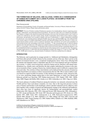 RADIOCARBON, Vol 51, Nr 2, 2009, p 445–455 © 2009 by the Arizona Board of Regents on behalf of the University of Arizona THE FORMATION OF DELUVIAL AND ALLUVIAL CONES AS A CONSEQUENCE OF HUMAN SETTLEMENT ON A LOESS PLATEAU: AN EXAMPLE FROM THE CHROBERZ AREA (POLAND) Piotr Szwarczewski Department of Geomorphology, Faculty of Geography and Regional Studies, University of Warsaw, Krakowskie Przedmieúcie 30, 00-927 Warsaw, Poland. Email: [email protected]. ABSTRACT. The area of Chroberz (southern Poland) poses questions of an interdisciplinary character comprising geomorphologic, sedimentation, and archaeological-historical problems. The main aim of this study was to identify the geomorphologic response to changes in the natural environment that took place in the area of the loess plateau (and its close vicinity) as a result of its settlement by man and of climate change. Periods of particularly intense human activity (land-use changes, deforestation, and agriculture) were recorded as changes in the type of sedimentation, i.e. organic sedimentation substituted for mineral one; it was extremely intensive during the Neolithic Age, Iron Age, and Early Middle Ages. The conducted fieldwork research, analysis of available archaeological materials, and radiocarbon dating results show that there is a direct connection between human economic activity in primeval and historic times and between soil erosion and accumulation of colluvial/alluvial fans in the surroundings of the locality of Chroberz. 14C dates documenting the age of colluvial sediment formation show that individual areas of the upland were settled by humans asynchronously. On the basis of a low facial variability, or, occasionally, even homogeneity, of individual colluvia (from soil erosion) and their considerable thickness, it can be concluded that the land was in constant use or that the intervals with no human activity were relatively short. The progressing human impact process is visible both in the form progradation recorded as the changes in 14C ages (e.g. from 1440 ± 100 to 780 ± 80 BP) and in textural (e.g. chemical) features of sediments of which the examined fans are composed. INTRODUCTION The Holocene, and in particular its younger periods (i.e. Subboreal and Subatlantic), distinguishes itself from other periods in Earth’s history by the economic activity of the man. Man’s activity in the natural environment became a new, exceptional morphogenetic factor whose force affecting both the animate and inanimate nature is dependent upon the level of development and type of dominating economy. A widely conceived pressure caused by human activity interferes with natural transformations (e.g. climatic ones), and therefore the data complex indicating the existence in the natural environment of these 2 groups of factors has a hybrid character and it is difficult to separate them from each other. The existence of these interrelations can be deduced from the outcome of numerous studies based both on an analysis of direct measurements (the last 200–300 yr) and on indirect analyses based on a signal recorded, for instance, in lake and deep-sea sediments, corals, calcareous tufa, or ice cores, projecting changes taking place in the entire Quaternary or solely Late Glacial and Holocene periods (e.g. Boryczka 1993; Ralska-Jasiewiczowa 1993; Starkel 1999, 2001, 2005b; Alley 2000; Wagner and Melles 2002; Gerdes et al. 2003; Zolitschka et al. 2003; Vlag et al. 2004). The loessic plateaus of southern Poland are among the territories very intensely colonized since the Neolith and have been used almost constantly ever since. Due to the long-term presence in those areas of farmers and breeders (with metallurgic cultures and their industrial activity added at a later time) together with a complex of natural and anthropogenic changes in the sediments and landforms, these areas have been of significant interest for archaeological and geomorphologic studies (Dπbrowska 1965; ånieszko 1985, 1995; Cabaj and Nowak 1986; Maruszczak 1986; Aleksandrowicz 1987; Jersak and ånieszko 1987; Kruk 1987; ånieszko and Grygierczyk 1991; Kruk et al. 1996; Kalicki 1997, 2000; Tunia 1997; Andrzejewski et al. 1998; Kulczycka-Leciejewiczowa 2002; Klimek 2002; Klimek et al. 2003; Zg≥obicki et al. 2003; Ba≥aga and Taras 2005; £anczont and Wojtanowicz 2005; Nogaj-Chachaj et al. 2005; Starkel 2005a; Schmitt et al. 2006, KaliÒska 2006; Zoll-Adamikowa et al. 2007). © 2009 by the Arizona Board of Regents on behalf of the University of Arizona Proceedings of the 5th International 14C and Archaeology Symposium, edited by Irka Hajdas et al. RADIOCARBON, Vol 51, Nr 2, 2009, p 445–455 445 Downloaded from https:/www.cambridge.org/core. IP address: 88.99.70.242, on 07 Mar 2017 at 04:29:55, subject to the Cambridge Core terms of use, available at https:/www.cambridge.org/core/terms. https://doi.org/10.1017/S0033822200055843 446 P Szwarczewski Figure 1 A) Location of the study area. B) Geomorphology of the study area. 1—top of the loess or loess and rock plateau, 2—slopes, 3—valley bottoms, 4—selected gullies, 5—surface waters (rivers and reservoirs); dots—boreholes, sampling points. Interdisciplinary research of loessic fluvial and slope environments indicates the existence of an elementary relationship between economic activity in the past and the typological diversity of the landforms and sediments that fill valley bottoms—both dry and permanently drained (ånieszko 1985, 1995; Maruszczak 1986; Jersak and ånieszko 1987; Kalicki 1997, 2000; ånieszko and Grygierczyk 1991; Klimek 2002; Schmitt et al. 2003, Zg≥obicki et al. 2003; Nalepka 2005; KaliÒska 2006). Changes in the texture, structure, and geochemistry of the sediments from which accumulation forms are made correlate with former intensity of human activity such as farming or deforestation. The palynological, geomorphologic, and geochemical data represent the record of human impact due to primi