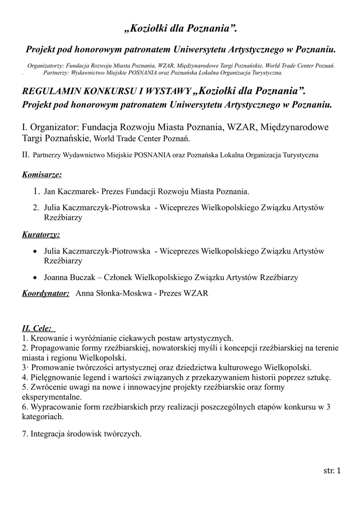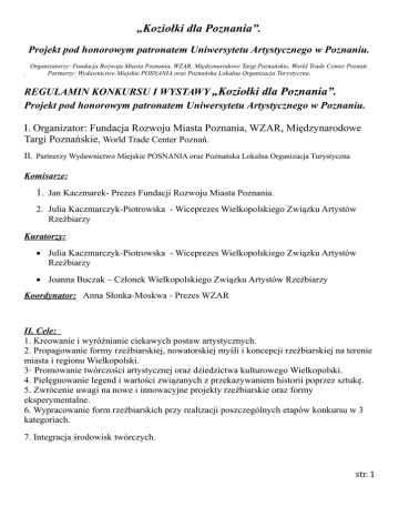 „Koziołki dla Poznania”. Projekt pod honorowym patronatem Uniwersytetu Artystycznego w Poznaniu. . Organizatorzy: Fundacja Rozwoju Miasta Poznania, WZAR, Międzynarodowe Targi Poznańskie, World Trade Center Poznań. Partnerzy: Wydawnictwo Miejskie POSNANIA oraz Poznańska Lokalna Organizacja Turystyczna. REGULAMIN KONKURSU I WYSTAWY „Koziołki dla Poznania”. Projekt pod honorowym patronatem Uniwersytetu Artystycznego w Poznaniu. I. Organizator: Fundacja Rozwoju Miasta Poznania, WZAR, Międzynarodowe Targi Poznańskie, World Trade Center Poznań. II. Partnerzy Wydawnictwo Miejskie POSNANIA oraz Poznańska Lokalna Organizacja Turystyczna Komisarze: 1. Jan Kaczmarek- Prezes Fundacji Rozwoju Miasta Poznania. 2. Julia Kaczmarczyk-Piotrowska - Wiceprezes Wielkopolskiego Związku Artystów Rzeźbiarzy Kuratorzy: Julia Kaczmarczyk-Piotrowska - Wiceprezes Wielkopolskiego Związku Artystów Rzeźbiarzy Joanna Buczak – Członek Wielkopolskiego Związku Artystów Rzeźbiarzy Koordynator: Anna Słonka-Moskwa - Prezes WZAR II. Cele: 1. Kreowanie i wyróżnianie ciekawych postaw artystycznych. 2. Propagowanie formy rzeźbiarskiej, nowatorskiej myśli i koncepcji rzeźbiarskiej na terenie miasta i regionu Wielkopolski. 3· Promowanie twórczości artystycznej oraz dziedzictwa kulturowego Wielkopolski. 4. Pielęgnowanie legend i wartości związanych z przekazywaniem historii poprzez sztukę. 5. Zwrócenie uwagi na nowe i innowacyjne projekty rzeźbiarskie oraz formy eksperymentalne. 6. Wypracowanie form rzeźbiarskich przy realizacji poszczególnych etapów konkursu w 3 kategoriach. 7. Integracja środowisk twórczych. str. 1 „Koziołki dla Poznania”. Projekt pod honorowym patronatem Uniwersytetu Artystycznego w Poznaniu. . Organizatorzy: Fundacja Rozwoju Miasta Poznania, WZAR, Międzynarodowe Targi Poznańskie, World Trade Center Poznań. Partnerzy: Wydawnictwo Miejskie POSNANIA oraz Poznańska Lokalna Organizacja Turystyczna. Kategorie: 1. Forma wielkogabarytowa – rzeźby przeznaczone na place, skwerki, parki, tereny osiedlowe… (np.: Koziołki Targowe, Koziołki Bankowe, Koziołki Leśne, muzyczne itp.) 2. Forma okazjonalna - pamiątka związana z Poznańskimi Koziołkami 3. Forma regionalno-turystyczna – np. instalacja przenośna, instalacja okolicznościowa, potykacze, oświetlenie, reklama.… III. Warunki: A. Przebieg: - Etap 1 do 15. 09. 2014 - termin złożenia kart zgłoszeniowych prac, oraz projektów wizualnych i dokumentacji fotograficznej zgłaszanych prac oraz opis w programie Word, zdjęcia zapisane w JPG 300 dpi. Opis powinien zawierać: 1. Informację w której z 3 kategorii konkursu zgłaszana praca bierze udział. 2. Tytuł pracy, materiał z którego ma być wykonana, docelowe wymiary. 3. Co najmniej 2 zdjęcia pracy. 4. Krótki życiorys artystyczny autora pracy. - Etap 2 dostarczenie prac na teren MTP 21-22.10. 2014r. (Dokładny termin i godzina będzie zamieszczona na stronach organizatorów 2 tygodnie przed planowaną wystawą.) - Etap 3 Wystawa oraz rozstrzygnięcie konkursu odbędzie się na terenie MTP podczas: TOUR SALONU, POZNAŃ GAME ARENA i MUSIC LAB w terminie 23.10 - 27.10. 2014r. - Etap 4 - 2014/2015 wystawa oraz stworzenie bazy powystawowej – oferta dla sponsorów. str. 2 „Koziołki dla Poznania”. Projekt pod honorowym patronatem Uniwersytetu Artystycznego w Poznaniu. . Organizatorzy: Fundacja Rozwoju Miasta Poznania, WZAR, Międzynarodowe Targi Poznańskie, World Trade Center Poznań. Partnerzy: Wydawnictwo Miejskie POSNANIA oraz Poznańska Lokalna Organizacja Turystyczna. B. Regulamin 1. Do udziału w konkursie oraz wystawie zapraszamy Artystów Rzeźbiarzy oraz Członków Wielkopolskiego Związku Rzeźbiarzy. 2. Format projektów nie większy niż 150 cm wysokości i szerokości w przypadku formy monumentalnej i instalacji, oraz maksymalnie 30 cm w przypadku form okazjonalnych. Możliwe jest przekroczenie 1 z dopuszczalnych rozmiarów o nie więcej jak 20% jego nominalnej wielkości. 3. Nadsyłanie dokumentacji prac na pierwszy etap: do 15. 09. 2014 r. do godz. 24.00 na adres e-mail: [email protected] 4. Prace o tematyce dowolnej według inspiracji artystycznej autora dotyczącej podań i legend o Poznańskich Koziołkach. 5. Prace w postaci rzeźbiarskich mogą być wykonane z dowolnego materiału (gips, tworzywo sztuczne, masy ceramiczne, brąz itp.) techniką dowolna. 6. Każdą pracę-projekt należy trwale oznaczyć (PODPIS< TYTUŁ) zgodnym z podanym w karcie zgłoszeniowej. 7. Przywożenie prac: a) organizator nie zwraca kosztów transportu prac, oraz nie odpowiada za uszkodzenia powstałe w transporcie, oraz wynikające ze złego zabezpieczenia prac. b) prace powinny być dostarczone w dobrze zabezpieczonych opakowaniach lub dostarczone osobiście na adres MTP – dokładne miejsce – pawilon i godzina zostaną przekazane wszystkim artystom, którzy zgłoszą projekty w wyznaczonym terminie na podane adresy e-mailowe w kartach zgłoszeniowych. 8. Maksymalna ilość zgłaszanych prac: 2 formy przestrzenne w każdej z kategorii. str. 3 „Koziołki dla Poznania”. Projekt pod honorowym patronatem Uniwersytetu Artystycznego w Poznaniu. . Organizatorzy: Fundacja Rozwoju Miasta Poznania, WZAR, Międzynarodowe Targi Poznańskie, World Trade Center Poznań. Partnerzy: Wydawnictwo Miejskie POSNANIA oraz Poznańska Lokalna Organizacja Turystyczna. 9. Prace nie spełniające warunków nie będą przyjmowane (np. nie można ich wyeksponować lub przekraczające podane wymiary więcej niż o 20%). 10.Organizatorzy zastrzegają sobie prawo do nieodpłatnego wykorzystania prac i ich wizerunków w mediach, prasie, telewizji, katalogach, informatorach i na plakatach w celach promocji konkursu. Organizatorzy zastrzegają sobie prawo do publikacji zdjęć nadesłanych prac w mediach oraz dokumentowania ich dla potrzeb wydawnictw bez wypłacania honorariów autorom. Uczestnik wyraża zgodę na wykorzystanie przez Organizatorów jego danych dla potr