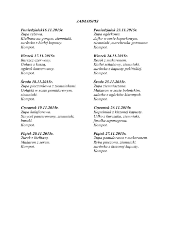 JADŁOSPIS Poniedziałek16.11.2015r. Zupa ryżowa. Kiełbasa na gorąco, ziemniaki, surówka z białej kapusty. Kompot. Poniedziałek 23.11.2015r. Zupa ogórkowa. Jajko w sosie koperkowym, ziemniaki ,marchewka gotowana. Kompot. Wtorek 17.11.2015r. Barszcz czerwony. Gulasz z kaszą, ogórek konserwowy. Kompot. Wtorek 24.11.2015r. Rosół z makaronem. Kotlet schabowy, ziemniaki, surówka z kapusty pekińskiej. Kompot. Środa 18.11.2015r. Zupa pieczarkowa z ziemniakami. Gołąbki w sosie pomidorowym, ziemniaki. Kompot. Środa 25.11.2015r. Zupa ziemniaczana. Makaron w sosie bolońskim, sałatka z ogórków kiszonych. Kompot. Czwartek 19.11.2015r. Zupa kalafiorowa. Sznycel panierowany, ziemniaki, buraki. Kompot. Czwartek 26.11.2015r. Kapuśniak z kiszonej kapusty. Udko z kurczaka, ziemniaki, fasolka szparagowa. Kompot. Piątek 20.11.2015r. Żurek z kiełbasą. Makaron z serem. Kompot. Piątek 27.11.2015r. Zupa pomidorowa z makaronem. Ryba pieczona, ziemniaki, surówka z kiszonej kapusty. Kompot.