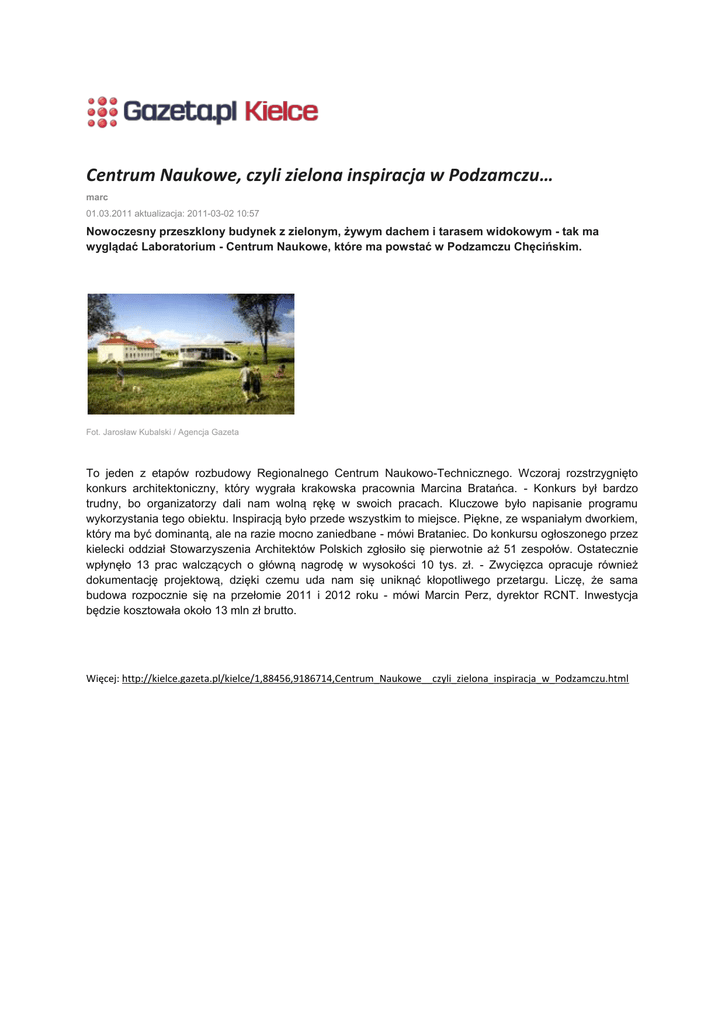 Centrum Naukowe, czyli zielona inspiracja w Podzamczu… marc 01.03.2011 aktualizacja: 2011-03-02 10:57 Nowoczesny przeszklony budynek z zielonym, żywym dachem i tarasem widokowym - tak ma wyglądać Laboratorium - Centrum Naukowe, które ma powstać w Podzamczu Chęcińskim. Fot. Jarosław Kubalski / Agencja Gazeta To jeden z etapów rozbudowy Regionalnego Centrum Naukowo-Technicznego. Wczoraj rozstrzygnięto konkurs architektoniczny, który wygrała krakowska pracownia Marcina Bratańca. - Konkurs był bardzo trudny, bo organizatorzy dali nam wolną rękę w swoich pracach. Kluczowe było napisanie programu wykorzystania tego obiektu. Inspiracją było przede wszystkim to miejsce. Piękne, ze wspaniałym dworkiem, który ma być dominantą, ale na razie mocno zaniedbane - mówi Brataniec. Do konkursu ogłoszonego przez kielecki oddział Stowarzyszenia Architektów Polskich zgłosiło się pierwotnie aż 51 zespołów. Ostatecznie wpłynęło 13 prac walczących o główną nagrodę w wysokości 10 tys. zł. - Zwycięzca opracuje również dokumentację projektową, dzięki czemu uda nam się uniknąć kłopotliwego przetargu. Liczę, że sama budowa rozpocznie się na przełomie 2011 i 2012 roku - mówi Marcin Perz, dyrektor RCNT. Inwestycja będzie kosztowała około 13 mln zł brutto. Więcej: http://kielce.gazeta.pl/kielce/1,88456,9186714,Centrum_Naukowe__czyli_zielona_inspiracja_w_Podzamczu.html