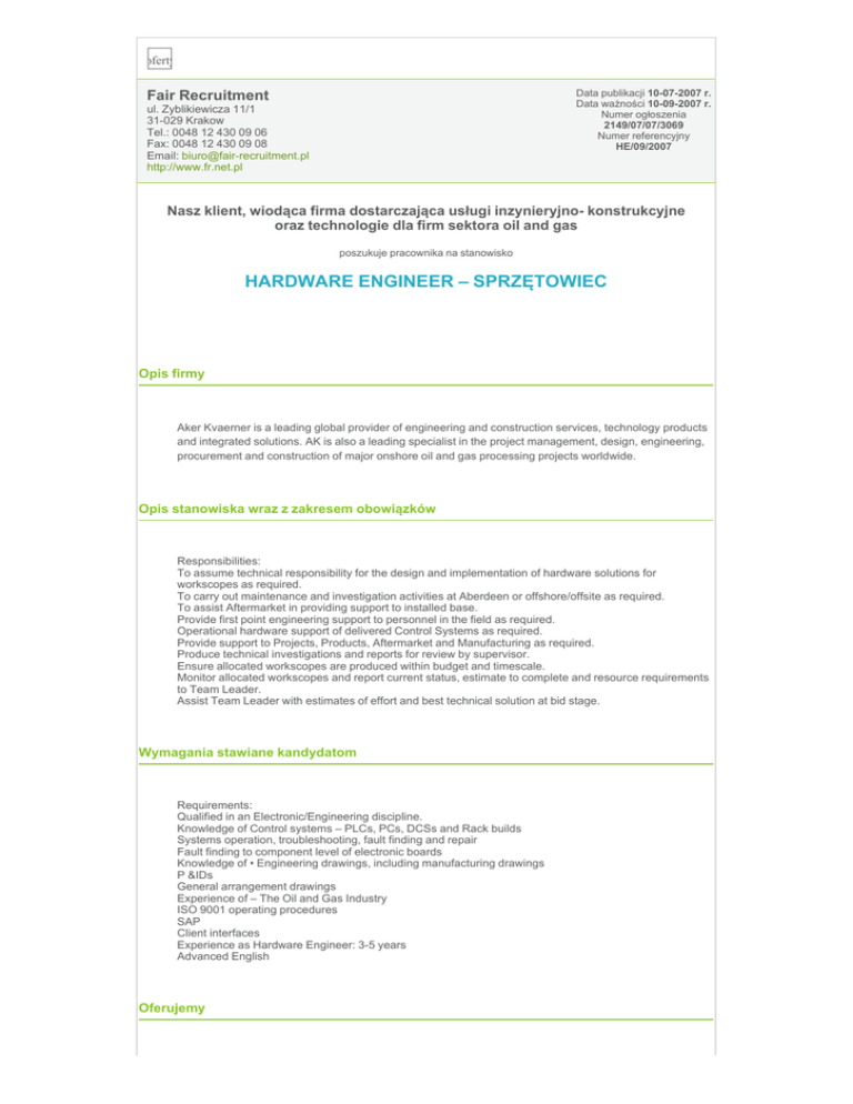praca, oferty pracy Data publikacji 10-07-2007 r. Data ważności 10-09-2007 r. Numer ogłoszenia 2149/07/07/3069 Numer referencyjny HE/09/2007 Fair Recruitment ul. Zyblikiewicza 11/1 31-029 Krakow Tel.: 0048 12 430 09 06 Fax: 0048 12 430 09 08 Email: [email protected] http://www.fr.net.pl Nasz klient, wiodąca firma dostarczająca usługi inzynieryjno- konstrukcyjne oraz technologie dla firm sektora oil and gas poszukuje pracownika na stanowisko HARDWARE ENGINEER – SPRZĘTOWIEC Opis firmy Aker Kvaerner is a leading global provider of engineering and construction services, technology products and integrated solutions. AK is also a leading specialist in the project management, design, engineering, procurement and construction of major onshore oil and gas processing projects worldwide. Opis stanowiska wraz z zakresem obowiązków Responsibilities: To assume technical responsibility for the design and implementation of hardware solutions for workscopes as required. To carry out maintenance and investigation activities at Aberdeen or offshore/offsite as required. To assist Aftermarket in providing support to installed base. Provide first point engineering support to personnel in the field as required. Operational hardware support of delivered Control Systems as required. Provide support to Projects, Products, Aftermarket and Manufacturing as required. Produce technical investigations and reports for review by supervisor. Ensure allocated workscopes are produced within budget and timescale. Monitor allocated workscopes and report current status, estimate to complete and resource requirements to Team Leader. Assist Team Leader with estimates of effort and best technical solution at bid stage. Wymagania stawiane kandydatom Requirements: Qualified in an Electronic/Engineering discipline. Knowledge of Control systems – PLCs, PCs, DCSs and Rack builds Systems operation, troubleshooting, fault finding and repair Fault finding to component level of electronic boards Knowledge of • Engineering drawings, including manufacturing drawings P &IDs General arrangement drawings Experience of – The Oil and Gas Industry ISO 9001 operating procedures SAP Client interfaces Experience as Hardware Engineer: 3-5 years Advanced English Oferujemy Company offers: Company offers: work in international, multicultural environment • opportunities to work internationally wide range of training and development programmes Salary: above industry standard Forma kontaktu Apply: If you feel comfortable with all mentioned requirements, please apply online at [email protected] Clause: Please, include the following statement: I hereby authorize Fair Recruitment to process my personal data included in my job application for the needs of the recruitment process in accordance with the Personnel Protection Act of 29.08.1997 (single text in Dz. U. from 2002 no 101 position 926 with later changes). Informacje dodatkowe Minimalne wykształcenie: wyższe Branża: Inżynieria i technologia chemiczna Forma zatrudnienia: umowa o pracę Wymiar pracy: pełny etat Wynagrodzenie (netto): nie podano Lokalizacja: zagranica Województwo: Miejsce pracy miasto(a) lub kraj(e): Aberdeen (UK) Prawo jazdy: tak Znajomość języka obcego: tak Ogłoszenie pochodzi z portalu www.i-praca.pl - Internetowy Portal Pracy ilość wyświetleń: 919