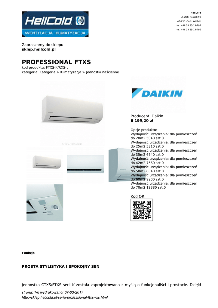 HellCold ul. Zofii Kossak 98 43-436, Górki Wielkie tel. +48 33 85-13-795 tel. +48 33 85-13-796 Zapraszamy do sklepu sklep.hellcold.pl PROFESSIONAL FTXS kod produktu: FTXS-K/RXS-L kategoria: Kategorie > Klimatyzacja > Jednostki naścienne Producent: Daikin 6 199,20 zł Opcje produktu: Wydajność urządzenia: do 20m2 5040 szt.0 Wydajność urządzenia: do 25m2 5310 szt.0 Wydajność urządzenia: do 35m2 6740 szt.0 Wydajność urządzenia: do 42m2 7560 szt.0 Wydajność urządzenia: do 50m2 8040 szt.0 Wydajność urządzenia: do 60m2 9900 szt.0 Wydajność urządzenia: do 70m2 12380 szt.0 dla pomieszczeń dla pomieszczeń dla pomieszczeń dla pomieszczeń dla pomieszczeń dla pomieszczeń dla pomieszczeń Kod QR: Funkcje PROSTA STYLISTYKA I SPOKOJNY SEN Jednostka CTXS/FTXS serii K została zaprojektowana z myślą o funkcjonaliści i prostocie. Dzięki strona: 1/6 wydrukowano: 07-03-2017 http://sklep.hellcold.pl/seria-professional-ftxs-rxs.html płynności kształtu, łatwo komponuje się ze ścianą i idealnie dopasowuje do nowocześnie urządzonych pokoi i innych niewielkich pomieszczeń. Eleganckie opływowe kształty pozwalają dopasować urządzenie do każdego wnętrza. Ta minimalistyczna i nowoczesna budowa jednostki CTXS / FTXS serii K poprzez dyskretny i łagodny wygląd nadaje sypialni lub innemu pomieszczeniu wyjątkowy unikalny akcent. WYSOKIEJ JAKOŚCI WYKOŃCZENIE "Doskonałość tkwi w szczegółach", to właśnie dlatego CTXS/FTXS seri K jest nie tylko funkcjonalny i elegancki ale przede wszystkim jest wykończony wysokiej jakości materiałami. Biały, kryształowo matowy kolor urządzenia ukazuje jego czystość i klasę. ZDALNY STEROWNIK Jeśli potrzebujesz zapewnić sobie komfort w sypialni za pomocą jednego przycisku, to właśnie dla Ciebie stworzyliśmy takie rozwiązanie. Urządzenie CTXS/FTXS serii K posiada bardzo przyjazny i łatwy w obsłudze zdalny sterownik. Zrobiony z taką samą troską i uwagą jak wyjątkowa i elegancka jednostka wewnętrzna. Pilot charakteryzuje się minimalistycznym i wyjątkowym designem. Jednostka wewnętrzna oraz pilot zdalnego sterowania wykończone są takim samym wysokiej jakości materiałem w kolorze krystalicznie matowej bieli, co powoduje, że doskonale do siebie pasują. WYJĄTKOWO CICHE URZĄDZENIE Zbędne hałasy są ostatnią rzeczą jaką chcesz usłyszeć w swojej sypialni. Cisza jest koniecznym elementem dobrego snu. Ab pomóc ci odpoczywać komfortowo i w ciszy, Daikin stworzył jednostkę wewnętrzną, która działa prawie bezgłośnie. Wytwarzany hałas osiąga maksymalnie poziom 19 dBA, to tyle co delikatny szum lub cichy szept. ŚPIJ SPOKOJNIE! NAJWYŻSZE OSIĄGI Poprzez nieustanne dążenie firmy Daikin do zwiększenia efektywności, system CTXS/FTXS serii K osiąga najwyższe wydajności. Dzięki technologii inwerterowej urządzenie dostosowuje pobór mocy do aktualnych potrzeb. Zapewnia to znaczne oszczędności oraz zwiększa komfort, a temperatura w pomieszczeniu utrzymywana jest na stałym poziomie. W rezultacie CTXS/FTXS serii K może poszczycić się pełną gamą urządzeń w klasie energetycznej A. WŁAŚCIWE URZĄDZENIE WE WŁAŚCIWYM MIEJSCU Jednostka CTXS/FTXS serii K jest zaprojektowana specjalnie do niewielkich pomieszczeń np. sypialni, co jest typowe dla aktualnie projektowanych nowoczesnych mieszkań. Regulacje określające wzrastające wymagania, dotyczące izolacji budynków, znacznie zmniejszają wydajność urządzeń potrzebnych do utrzymania właściwego klimatu pomieszczeń. Nowa jednostka klasy 15 jest w pełni dostosowana do tych aktualnych wymogów, co powoduje oszczędność energii oraz całkowicie nowy poziom komfortu. strona: 2/6 wydrukowano: 07-03-2017 http://sklep.hellcold.pl/seria-professional-ftxs-rxs.html FUNKCJE OSZCZĘDZANIA ENERGII Korzyści Cechy produktu Dyskretne, nowoczesne wzornictwo. Jego łagodny profil doskonale stapia się ze ścianą, zapewniając dyskretną obecność w każdym wystroju wnętrza. Te modele są przeznaczone specjalnie dla małych lub dobrze izolowanych pomieszczeń. Idealne do montażu w sypialniach Wysokiej jakości matowe, krystalicznie białe wykończenie. Bardzo cicha praca: działająca jednostka jest praktycznie niesłyszalna. Poziom ciśnienia akustycznego spada do 19 dBA ! Nadaje się idealnie do instalowania w sypialniach (klasa 20,25) oraz w większych przestrzeniach o nieregularnym kształcie (klasa 35,42,50) ryb ECONO zmniejsza pobór mocy, dlatego można używać innych urządzeń, które potrzebują dużego zasilania Nowy projekt zdalnego sterownika, również w wysokiej jakości, z matowym, białym wykończeniem, doskonale dopasowanym do jednostki wewnętrznej. Tryb komfortowy gwarantuje operację bez przeciągów. Zimne i gorące powietrze nie jest skierowane bezpośrednio na osoby znajdujące się w pomieszczeniu Tytanowo-apatytowy fotokatalityczny filtr oczyszczający powietrze usuwa unoszące się w powietrzu mikroskopijne cząsteczki kurzu, likwiduje nieprzyjemne zapachy i powstrzymuje rozwój bakterii, wirusów i drobnoustrojów, zapewniając stały dopływ czystego powietrza Tryb POWERFUL (działanie na pełnej mocy) można ustawić na szybkie schłodzenie lub ogrzanie pomieszczenia; Po wyłączeniu funkcji pracy na pełnej mocy, urządzenie powraca do poprzedniego trybu pracy. strona: 3/6 wydrukowano: 07-03-2017 http://sklep.hellcold.pl/seria-professional-ftxs-rxs.html Tryb nocny oszczędza energię przez zapobieganie przechłodzeniu lub przegrzaniu w nocy Cicha praca jednostki wewnętrznej: Przycisk "Silent" na pilocie zmniejsza głośność pracy jednostki wewnętrznej o 3dB(A) Oszczędzanie energii w trybie bezczynności: Zmniejszenie zużycia o około 80 % w trybie bezczynności. Jeśli nie zostanie wykryta żadna osoba przez dłużej niż 20 minut, system automatycznie przełączy się w tryb oszczędności prądu. Sterownik online (opcja): umożliwia kontrolę jednostki wewnętrznej z dowolnego miejsca za pośrednictw