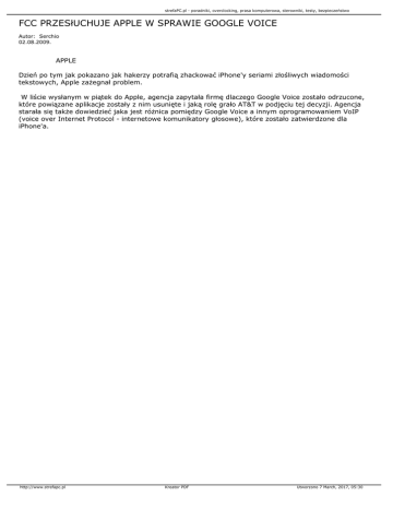 strefaPC.pl - poradniki, overclocking, prasa komputerowa, sterowniki, testy, bezpieczeństwo FCC PRZESłUCHUJE APPLE W SPRAWIE GOOGLE VOICE Autor: Serchio 02.08.2009. APPLE Dzień po tym jak pokazano jak hakerzy potrafią zhackować iPhone'y seriami złośliwych wiadomości tekstowych, Apple zażegnał problem. W liście wysłanym w piątek do Apple, agencja zapytała firmę dlaczego Google Voice zostało odrzucone, które powiązane aplikacje zostały z nim usunięte i jaką rolę grało AT&T w podjęciu tej decyzji. Agencja starała się także dowiedzieć jaka jest różnica pomiędzy Google Voice a innym oprogramowaniem VoIP (voice over Internet Protocol - internetowe komunikatory głosowe), które zostało zatwierdzone dla iPhone'a. http://www.strefapc.pl Kreator PDF Utworzono 7 March, 2017, 05:30